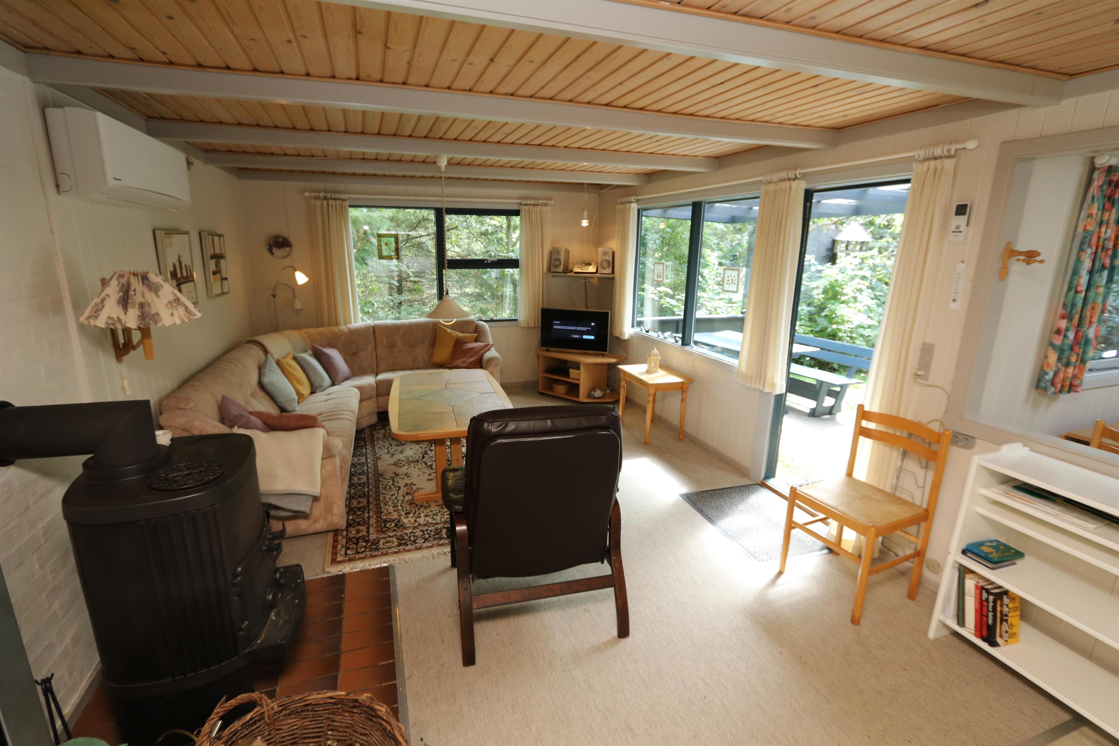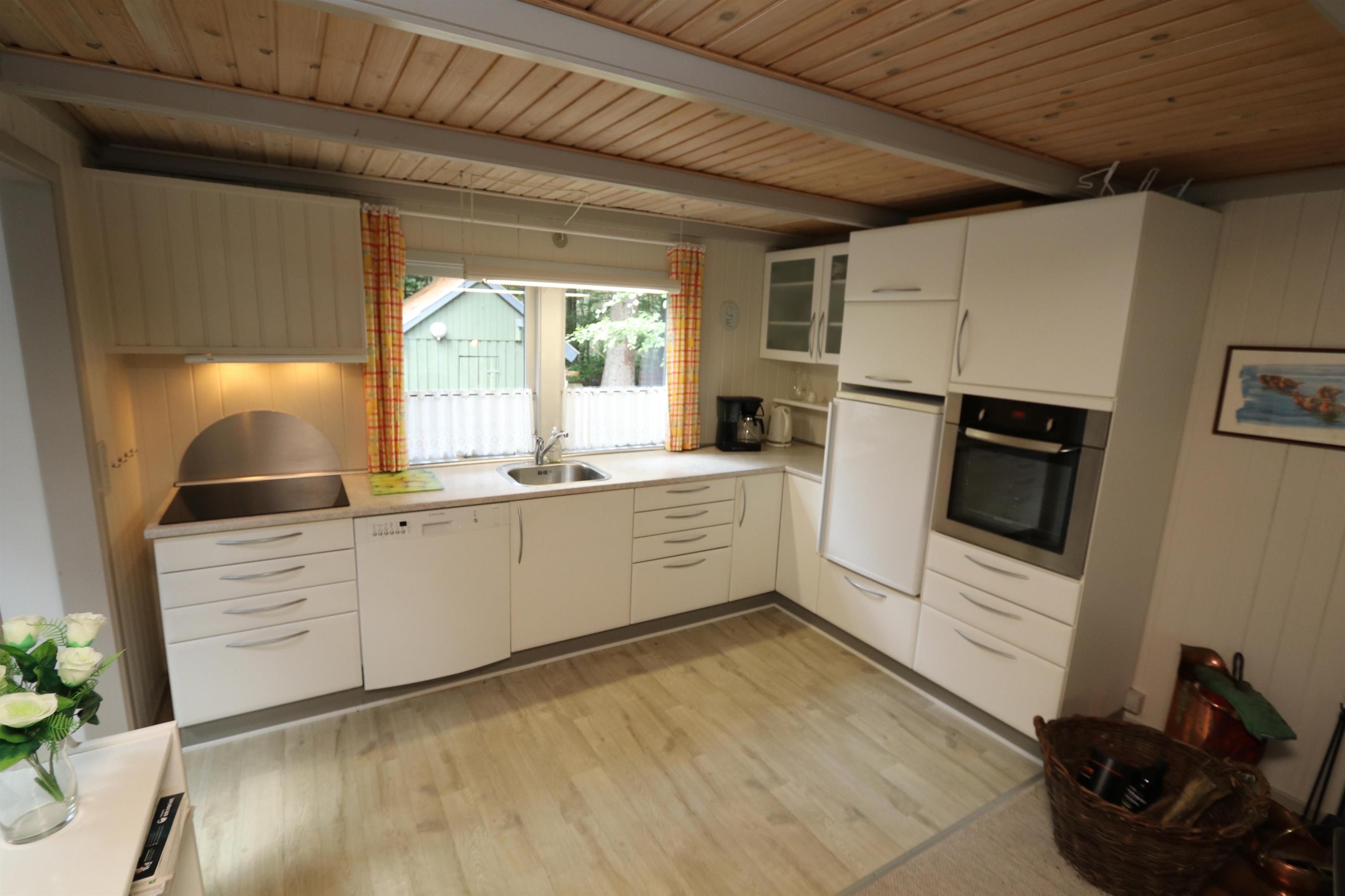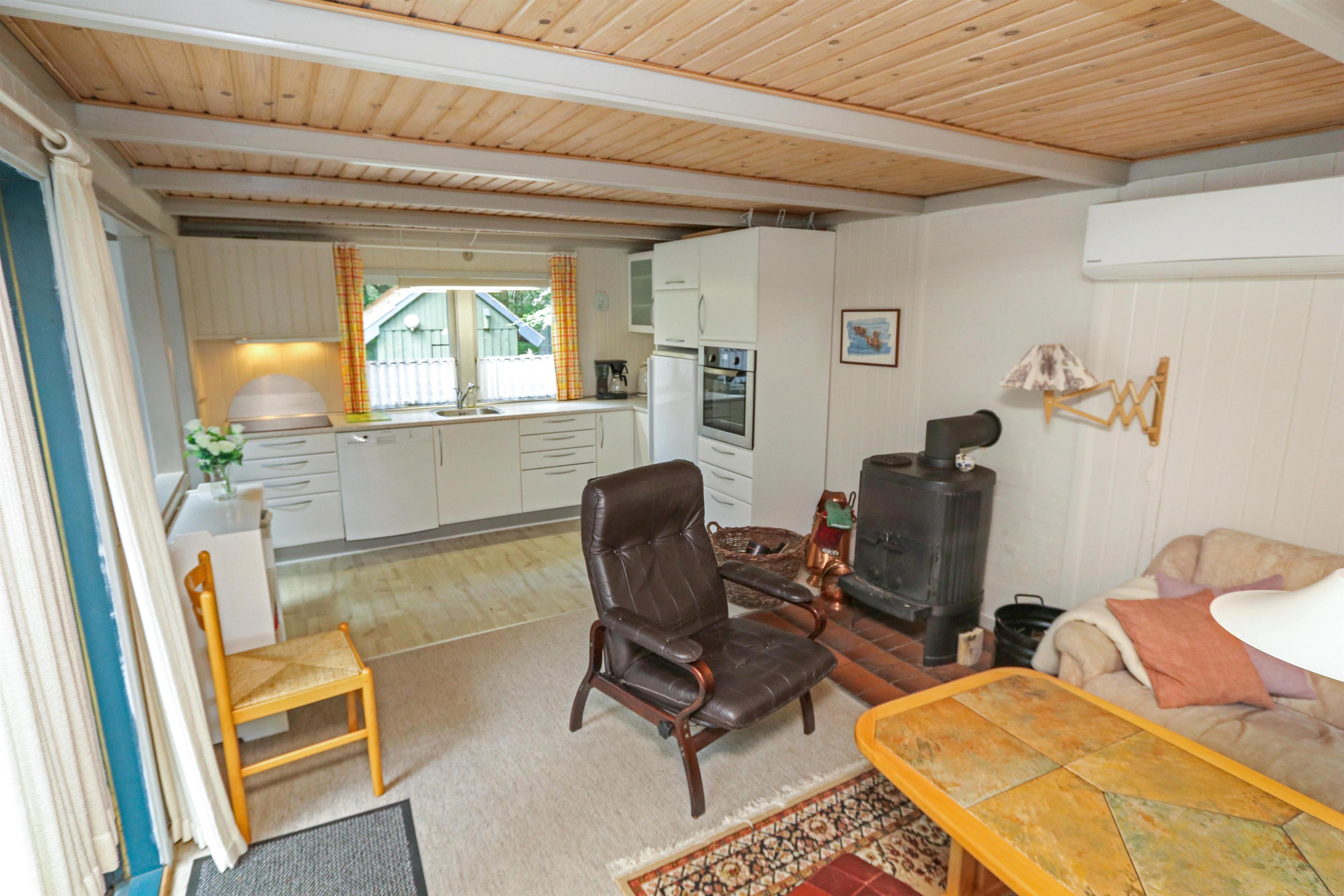 Gemütliches, überschaubares Ferienhaus von ca. 56 m2. Es gibt eine kombinierte Küchenecke und ein Wohnzimmer. In der neueren Küchenecke gibt es Cerankochfeld, Einbaubackofen, Mikrowelle, Dunstabzugshaube, Kühlschrank mit kleinem Gefrierfach und Geschirrspüler. Neben der Küche befindet sich der Esstisch mit Platz für 4 Personen. Wohnzimmer mit Polstermöbeln, TV mit dänischen Sendern, Streamingmöglichkeit über Chromecast sowie Radio und CD-Player, wofür Sie selber einen Abonnement haben. Der Kaminofen mit Wärmepumpe senkt die Heizkosten. 2 Schlafzimmer (1DS, 1DS). Kleines Badezimmer mit Toilette, Dusche und Waschbecken. Nichtraucher-Haus. Maximal ist 1 Haustier erlaubt. Dieses Haus hat kein Internet.