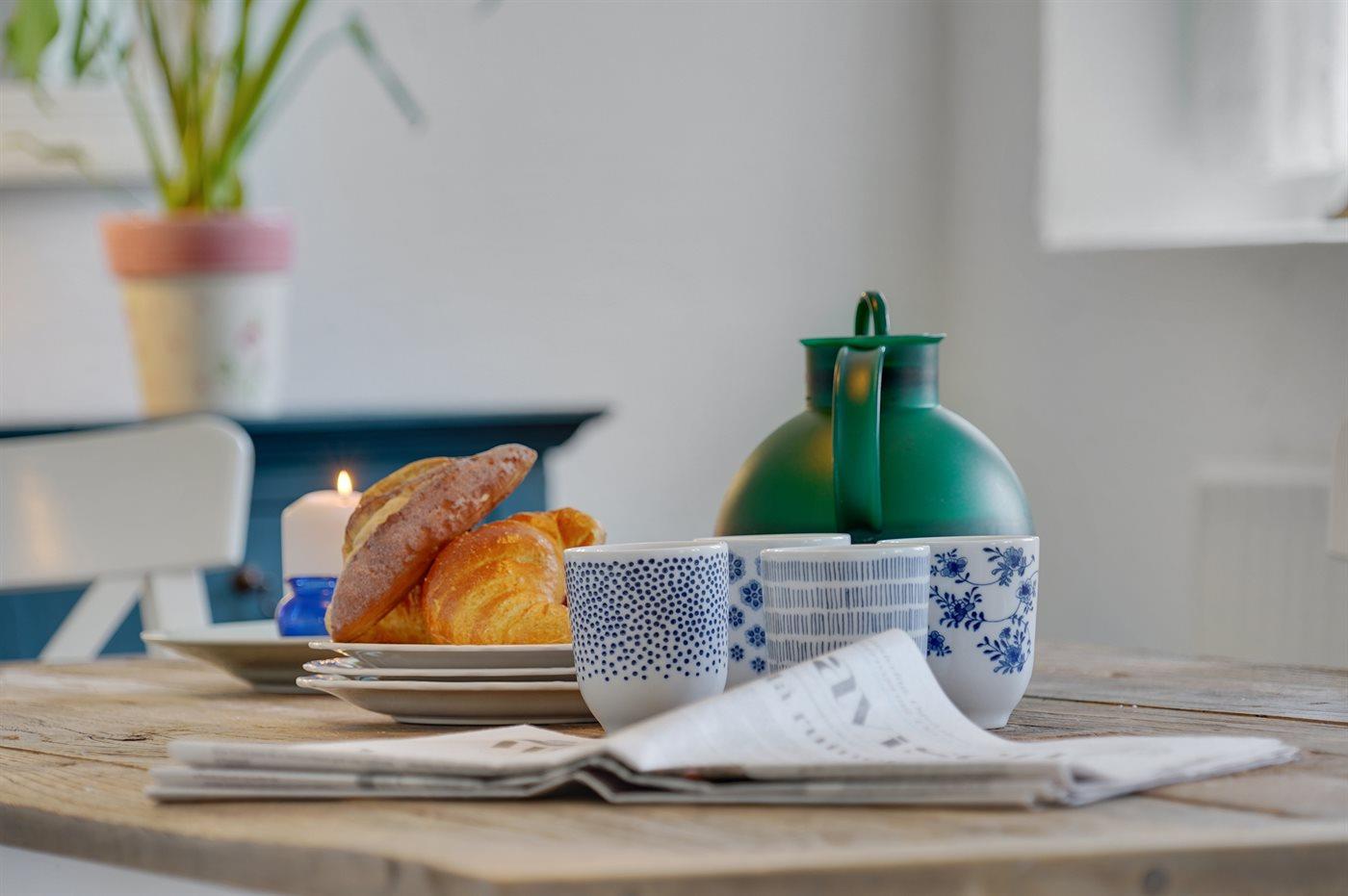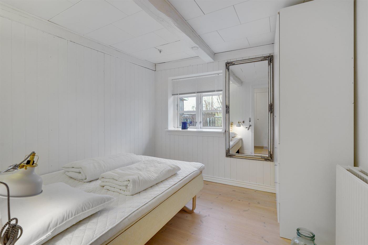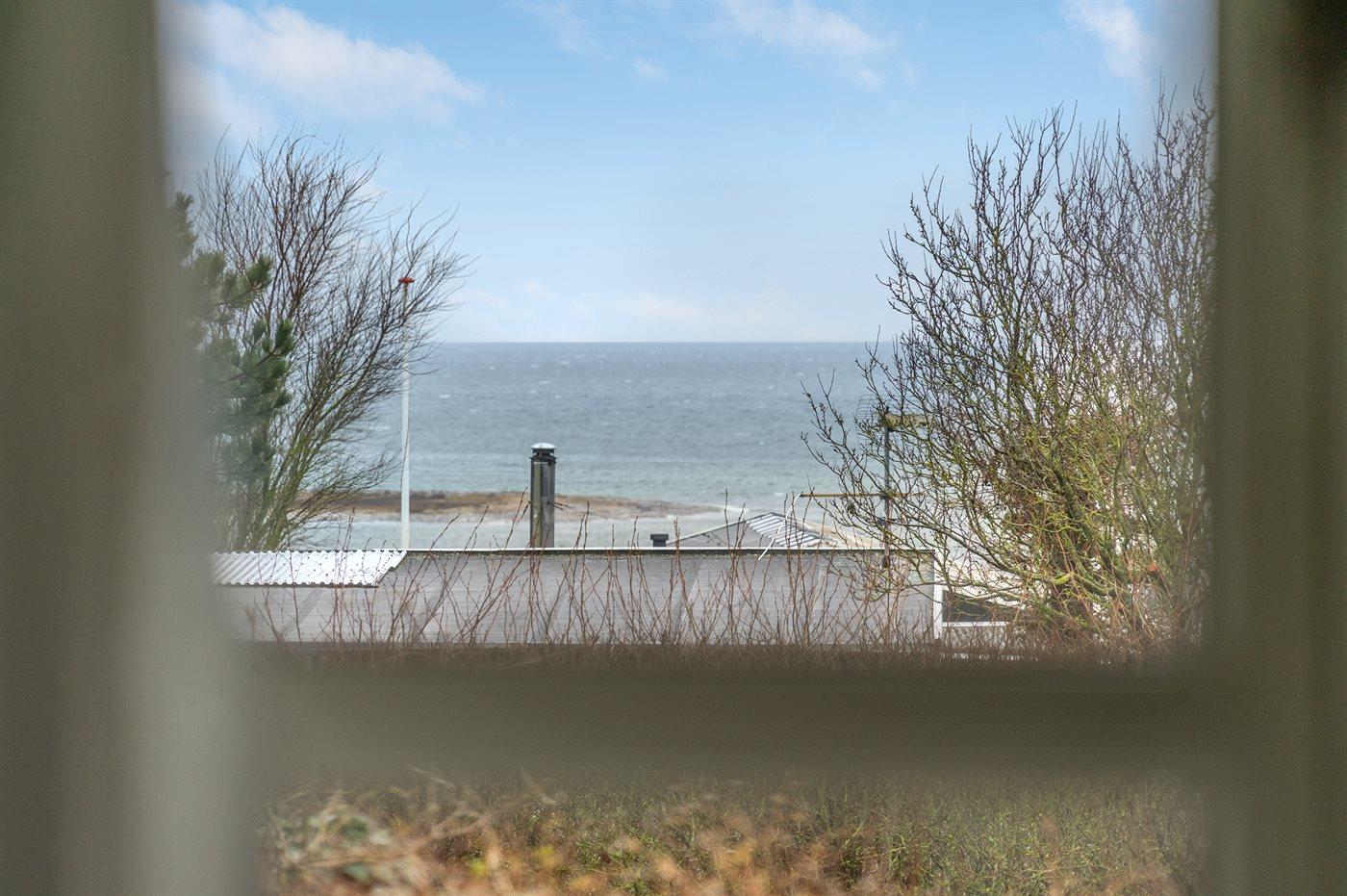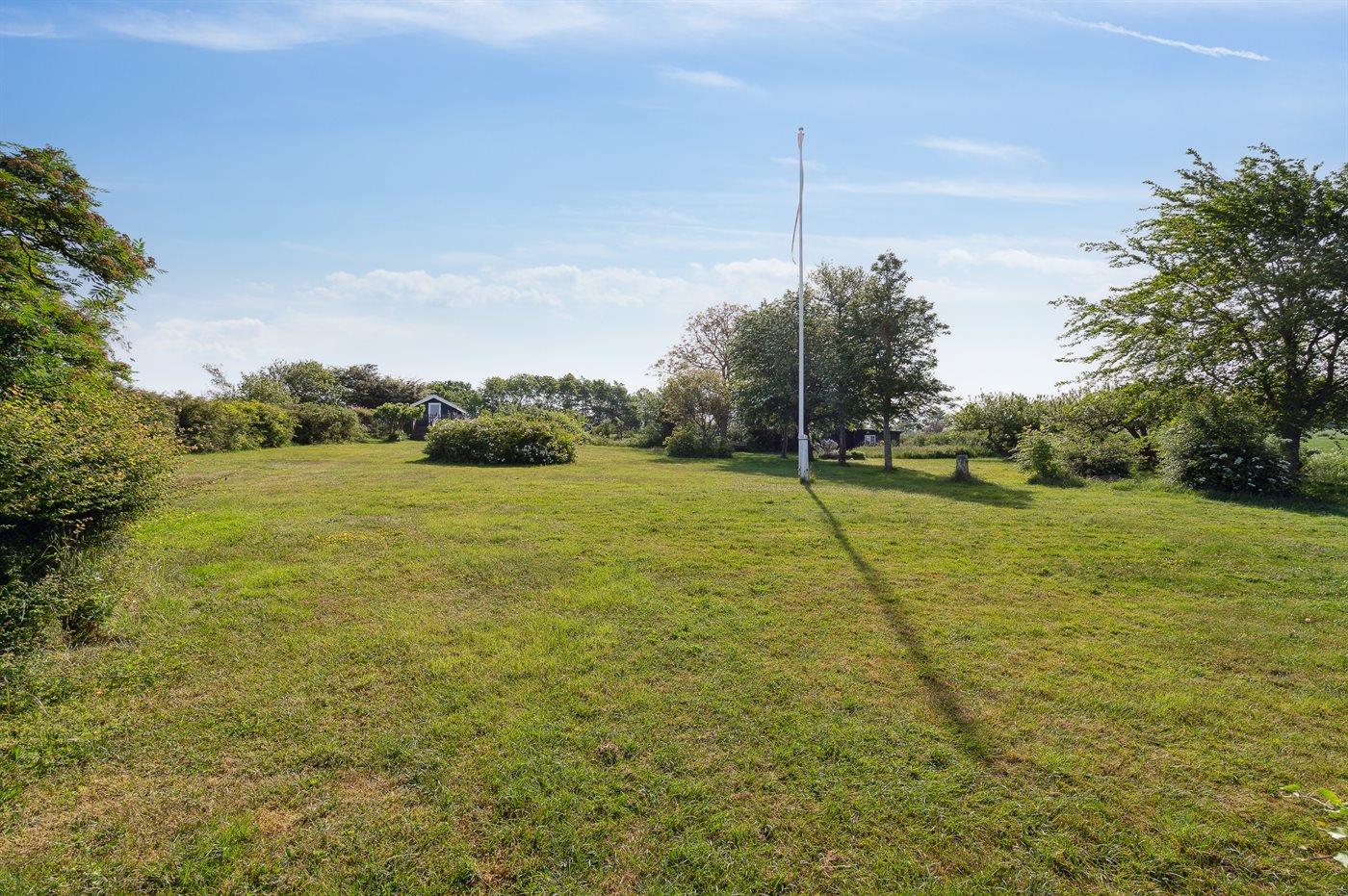 Am Ende des großen Grundstücks ist ein kleines Gästehaus errichtet, das über eine sich in erhöhter Lage befindenen Holzterrasse verfügt - von wo aus man Ausblick über die Bucht von Helnæs hat.