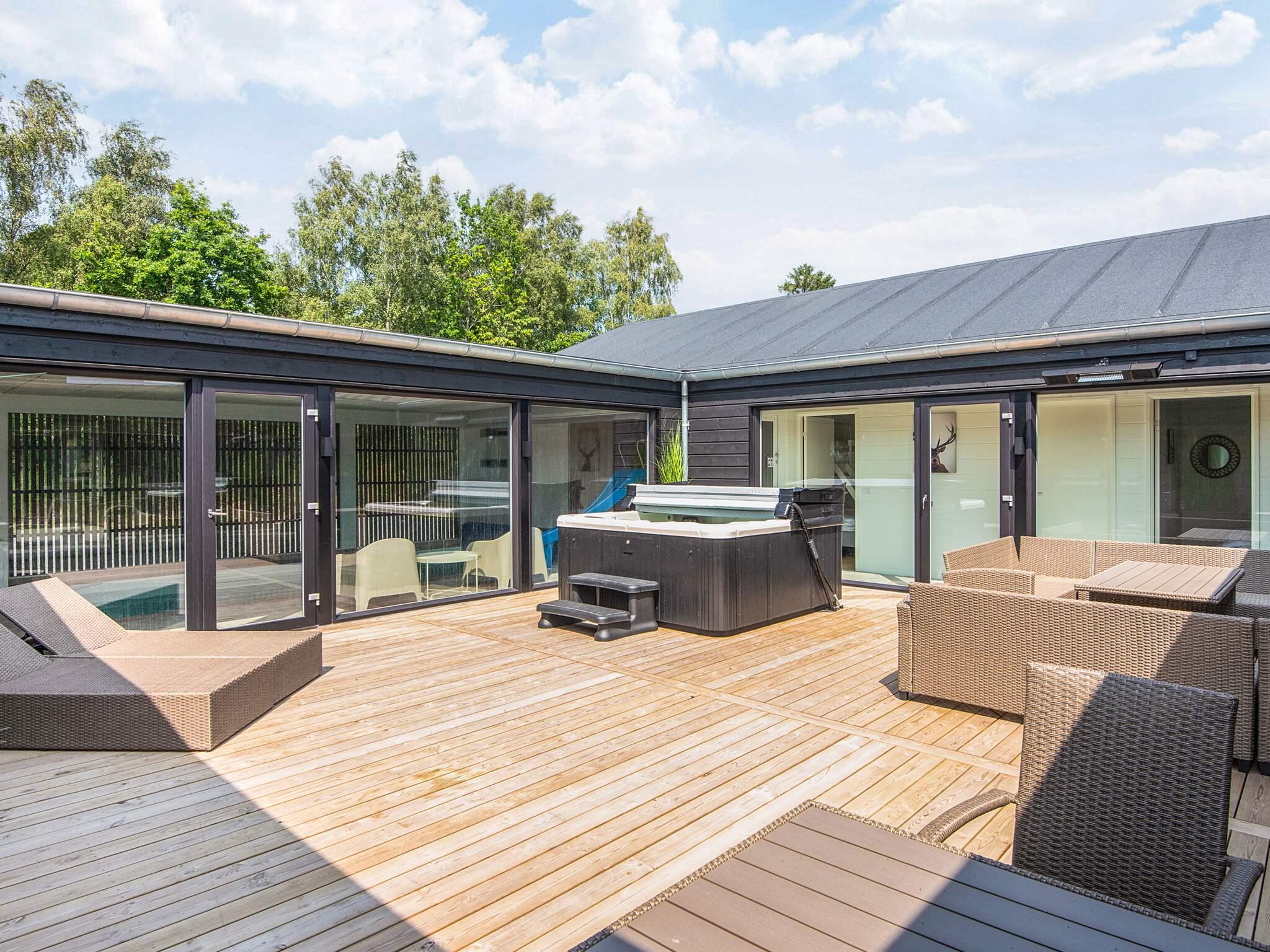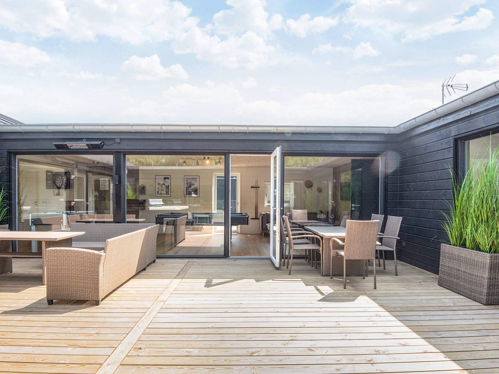 Zur Entspannung bietet das Ferienhaus außerdem einen Indoor-Whirlpool für 4 Personen, einen Outdoor-Whirlpool mit Standwasser für 7 Personen sowie eine Sauna. Auf der Terrasse sorgen 4 Terrassenheizstrahler mit integrierten Lautsprechern dafür, dass Sie die Abende auch bei kühleren Temperaturen im Freien genießen können.