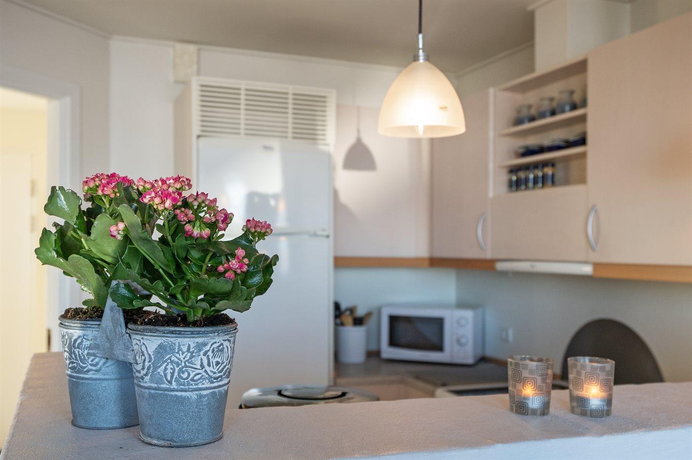 Die Küche ist mit Kühlschrank ausgestattet. Außerdem gibt es 4 Keramik-Kochfelder, Umluftofen, Mikrowelle sowie Geschirrspüler.