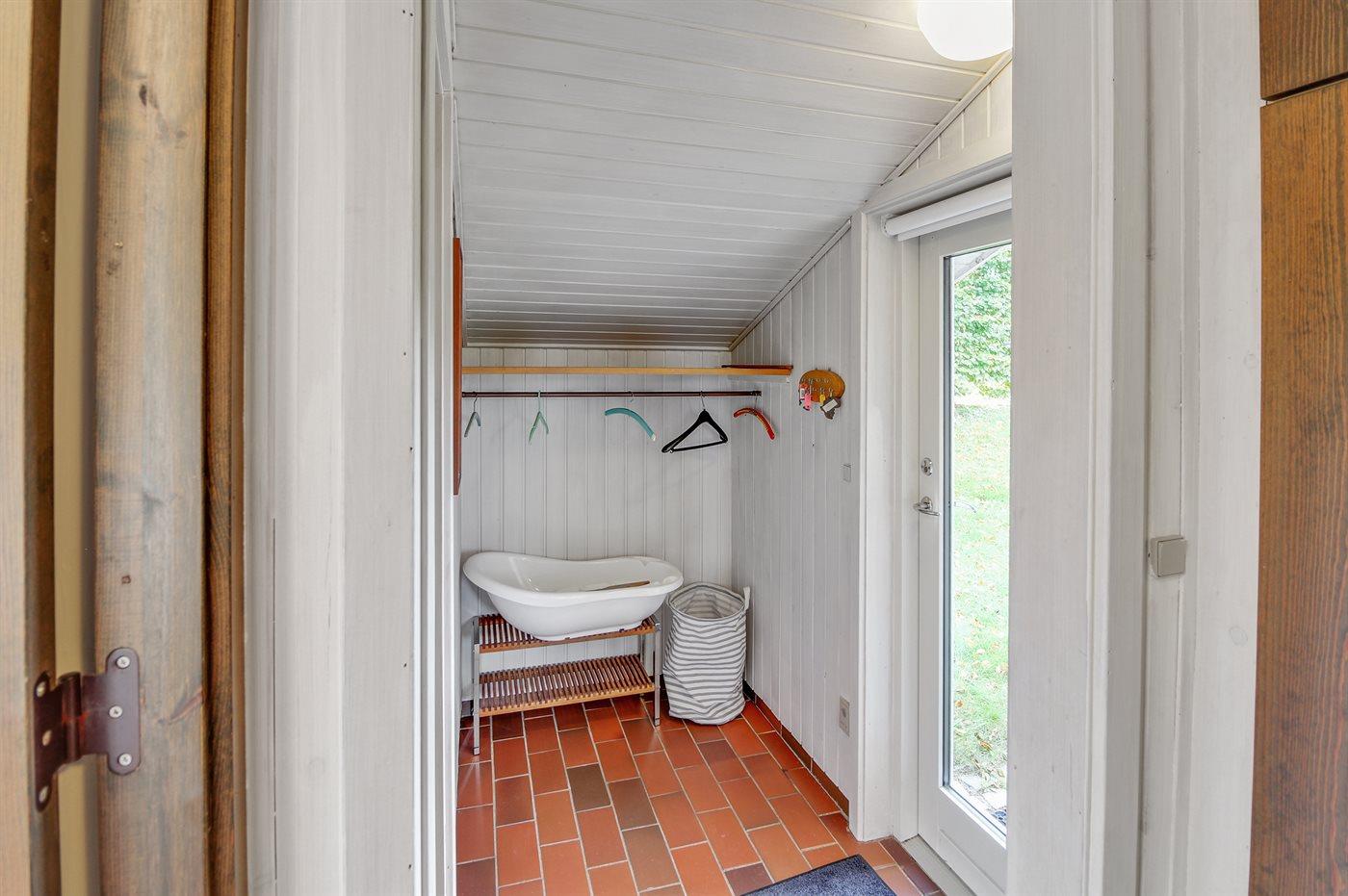 Das Badezimmer hat eine Duschnische und eine Toilette. In der Sauna und im Eingangsbereich gibt es Fußbodenheizung.