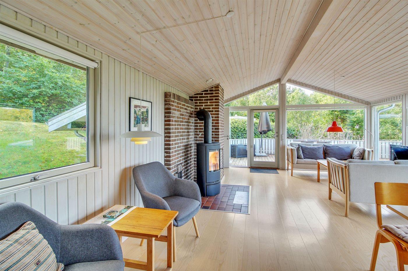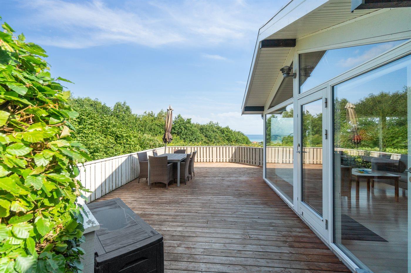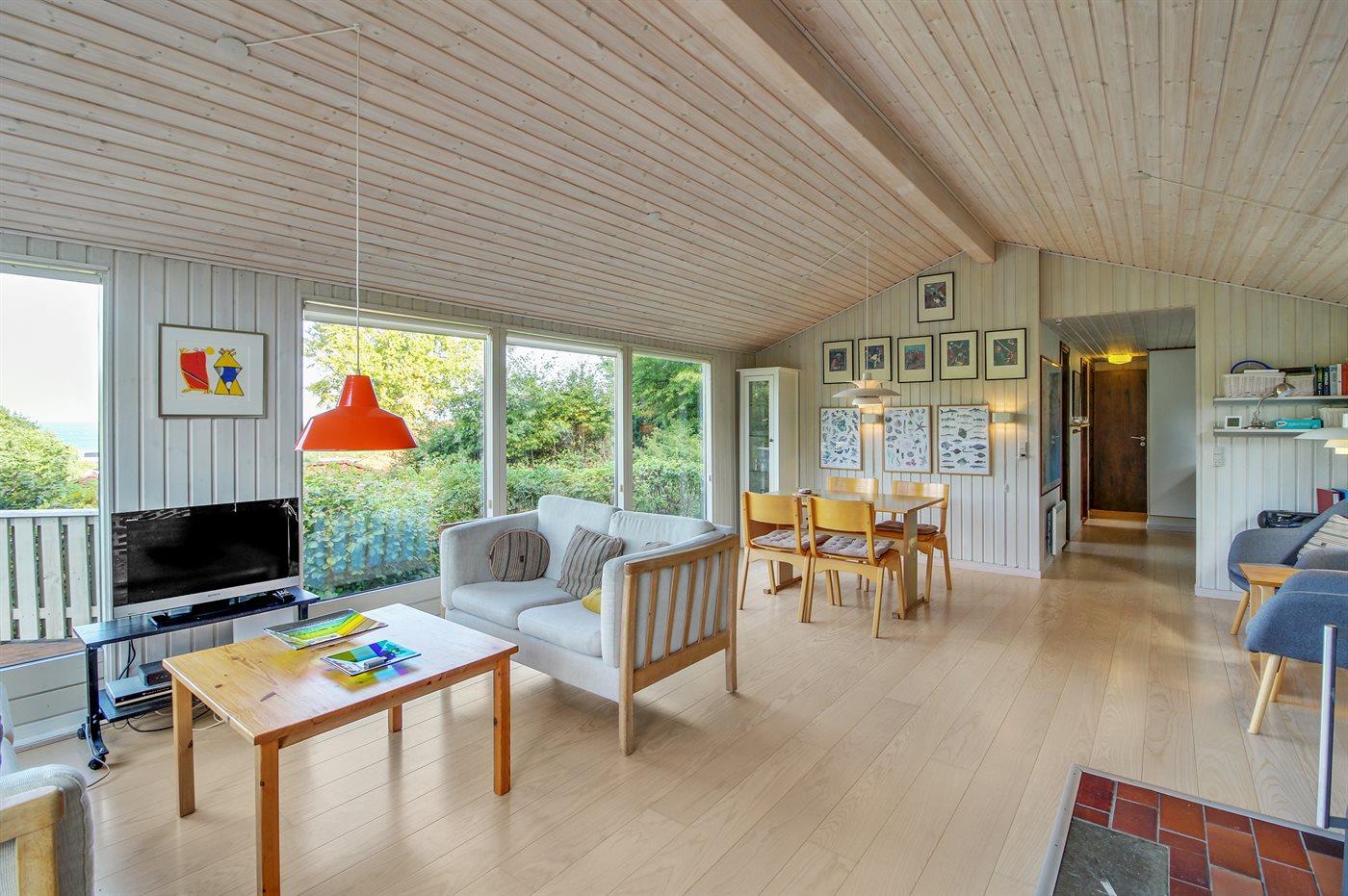 Auf einem leicht hügeligen Grundstück mit Meerblick – sowohl vom Haus als auch vom Grundstück aus, liegt dieses gepflegte Ferienhaus. Das Haus hat ein großes, hell eingerichtetes Wohnzimmer. Zum Haus gehören eine westlich ausgerichtete Holzterrasse mit direktem Zugang vom Wohnzimmer sowie eine östlich ausgerichtete Holzterrasse.