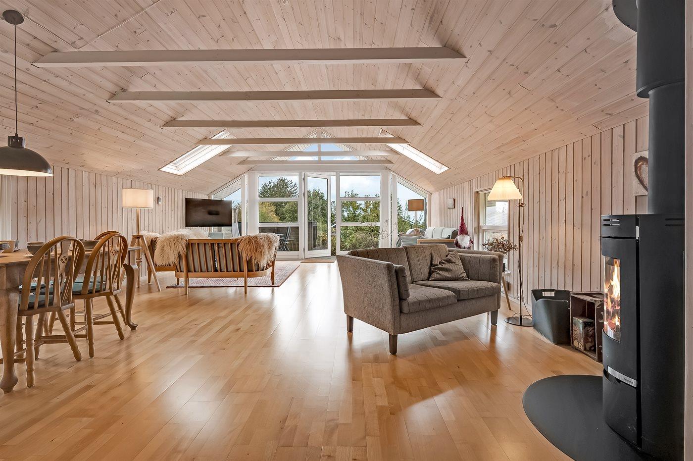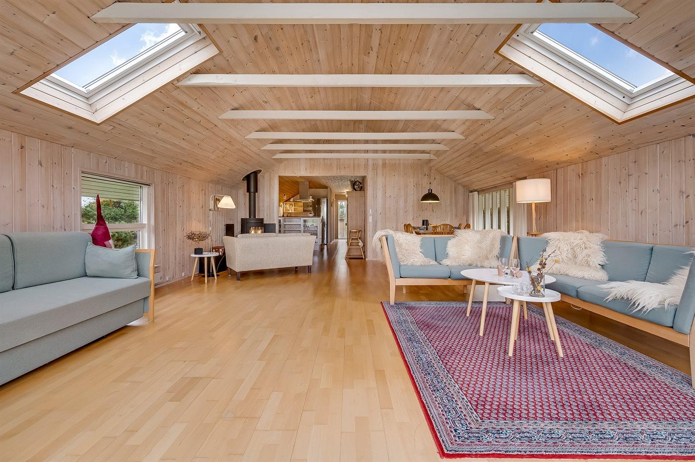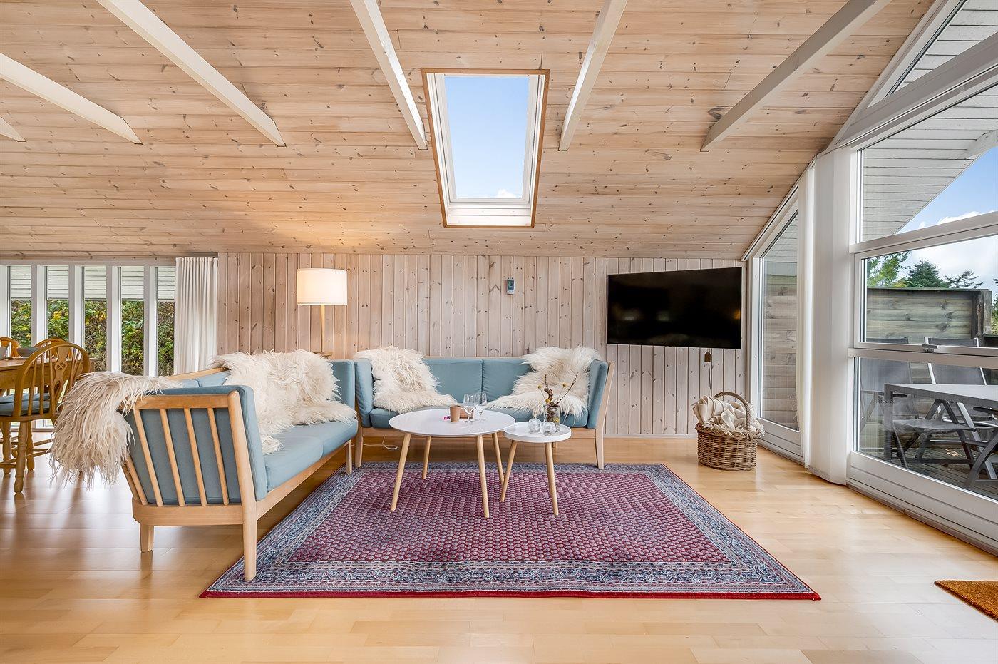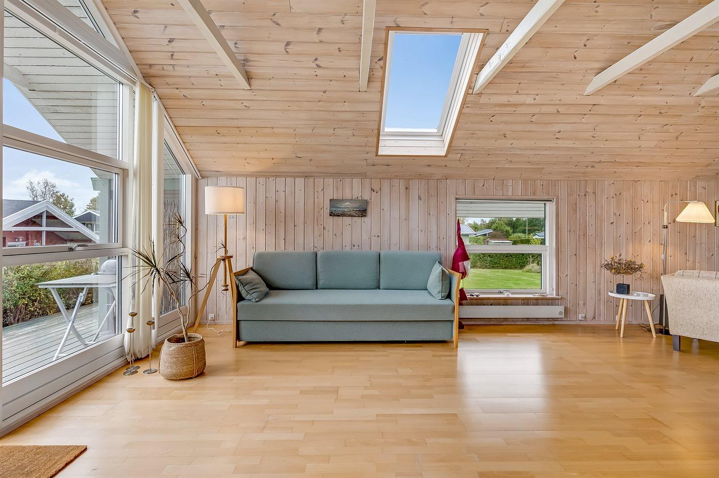 Im Inneren präsentiert sich das Ferienhaus hell und einladend mit einer funktionalen Einrichtung, die sich perfekt für eine Familie mit Kindern eignet, und es besteht auch die Möglichkeit, zum Beispiel die Großeltern mit in den Urlaub zu nehmen. Das Herzstück des Hauses ist der schöne Küchen-Essbereich, der mit dem Wohnbereich kombiniert ist. Die großen Fenster und Dachfenster sorgen für einen fantastischen Lichteinfall, und vom Wohnzimmer aus gelangt man direkt auf die Terrasse.