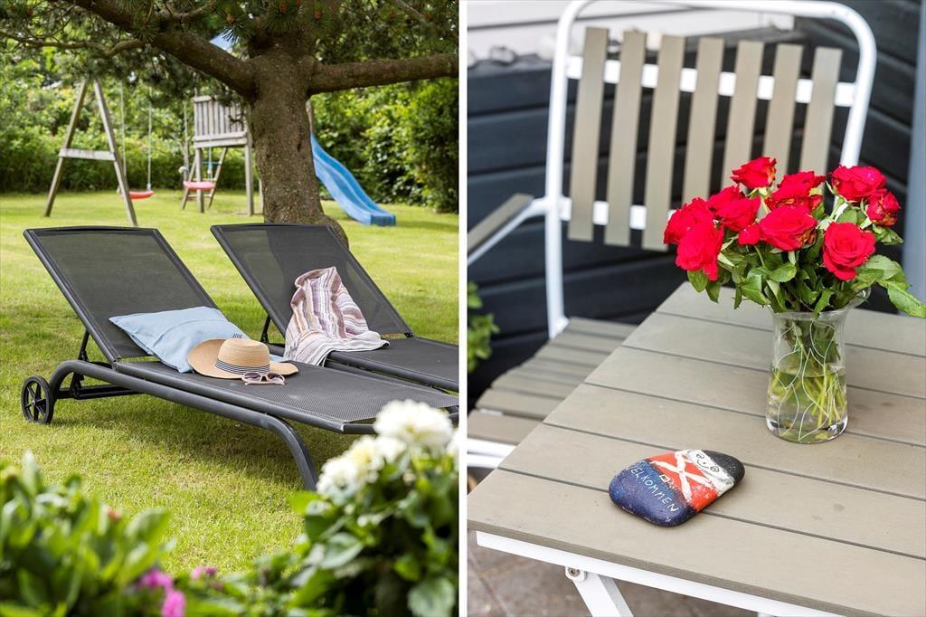 Der große Garten ist eine wahre Oase mit grünem Gras rund um das Haus. Es gibt viele Möglichkeiten zum Spielen und Entspannen. Kinder können sich in den vielen Ecken im Garten verstecken. Für die Erwachsenen gibt es mehrere gemütliche Liegeflächen und eine schöne überdachte Terrasse, auf der du einen ruhigen Morgenkaffee oder einen warmen Sommerabend mit einem Grill und guten Gesprächen genießen kannst.