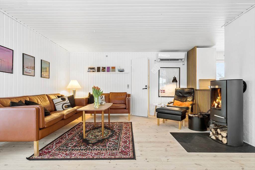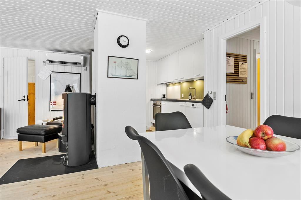 Mit seiner einladenden, warmen Wohnatmosphäre bildet dein Ferienhaus einen perfekten Rahmen für ruhige Stunden und das gemütliche Beisammensein. Stelle dir nur vor, wie du nach einem langen, erlebnisreichen Tag in dein Ferienhaus zurückkehrst und dich im Kreise deiner Familie auf dem Sofa vor dem Kaminofen niederlässt. Mit vier Schlafräumen, die wie kleine Oasen wirken und mit jeweils einem Doppelbett ausgestattet sind, ist guter Schlaf garantiert. Nach dem Aufstehen am Morgen bereitest du mit deinen Lieben in der hellen, offenen Küche das Frühstück zu, das ihr anschließend am angrenzenden Esstisch genießt. Die Küche ist sehr gut ausgestattet und macht selbst die Zubereitung aufwendigerer Gerichte zum reinen Vergnügen. Nachdem ihr an kühlen Abenden das Feuer im Kaminofen angeheizt habt, könnt ihr den Tag mit einem spannenden Buch in der Hand, bei einem unterhaltsamen Gesellschaftsspiel oder auch vor dem Fernseher ausklingen lassen. Laue Sommerabende genießt ihr sicherlich gern auf der vom Wohnraum aus zugänglichen Terrasse. Wohlige Momente mit bester Erholung und Regenration verspricht die von der Terrasse aus erreichbare Sauna. Vor der Terrasse erstreckt sich der hübsche Garten mit einem Shelter und einer Lagerfeuerstelle - perfekt für stimmungsvolle Stunden unter dem funkelnden Sternenzelt.