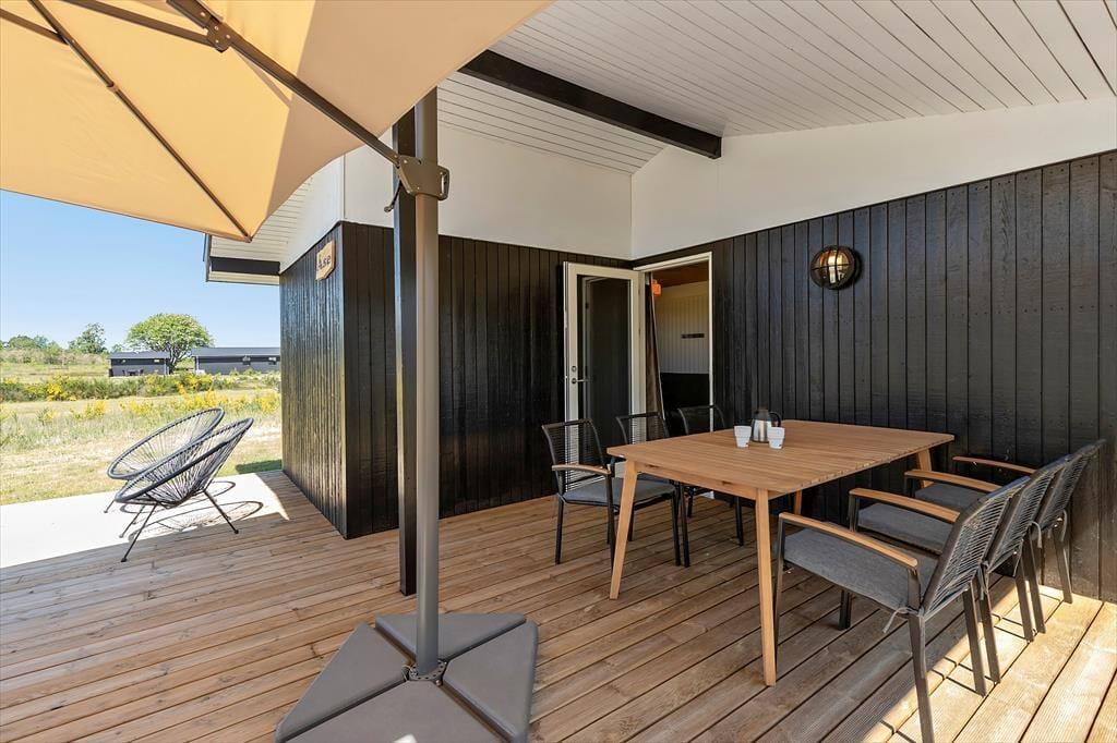 Nur 350 Meter vor deiner Haustür erstreckt sich der schöne, kinderfreundliche Strand. Das ansprechende, ebene Grundstück eignet sich bestens zum Ballspielen und für zahllose andere unterhaltsame Outdoor-Aktivitäten. An dein Ferienhaus schließen zwei sonnenverwöhnte Terrassen - eine an der Ostseite vor dem Eingang und eine Westterrasse, die vom Wohnraum aus zugänglich ist. Auf der Ostterrasse kannst du es dir wunderbar mit einem frischen Kaffee in der Morgensonne gemütlich machen. Später am Tag wird es dich auf die Westterrasse ziehen, die mit ihren Loungemöbeln und einem Grill unter anderem zum Genießen der langen, lauen Sommerabende einlädt.