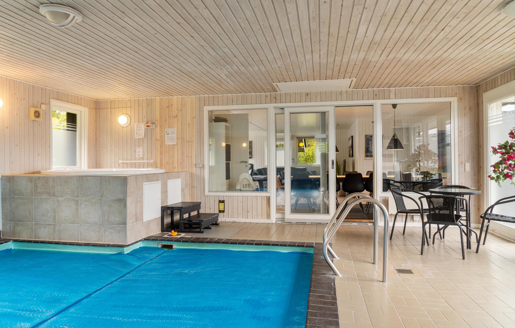 Farbenfrohes Poolhaus mit Sauna und Whirlpool nahe Bønnerup Strand für erholsame Ferien zu jeder Jahreszeit.