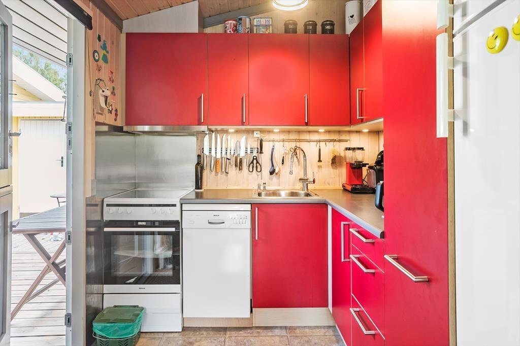 Køkken med komfur, bageovn, kogeplader, opvaskemaskine, køleskab samt lille fryseskab.