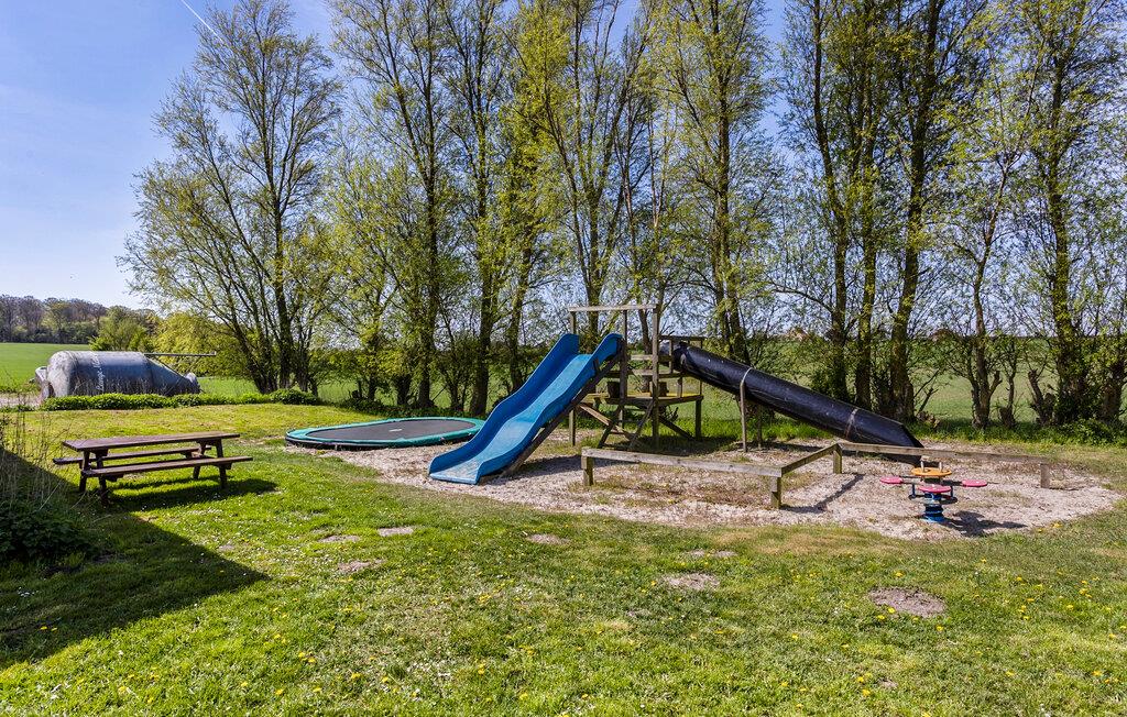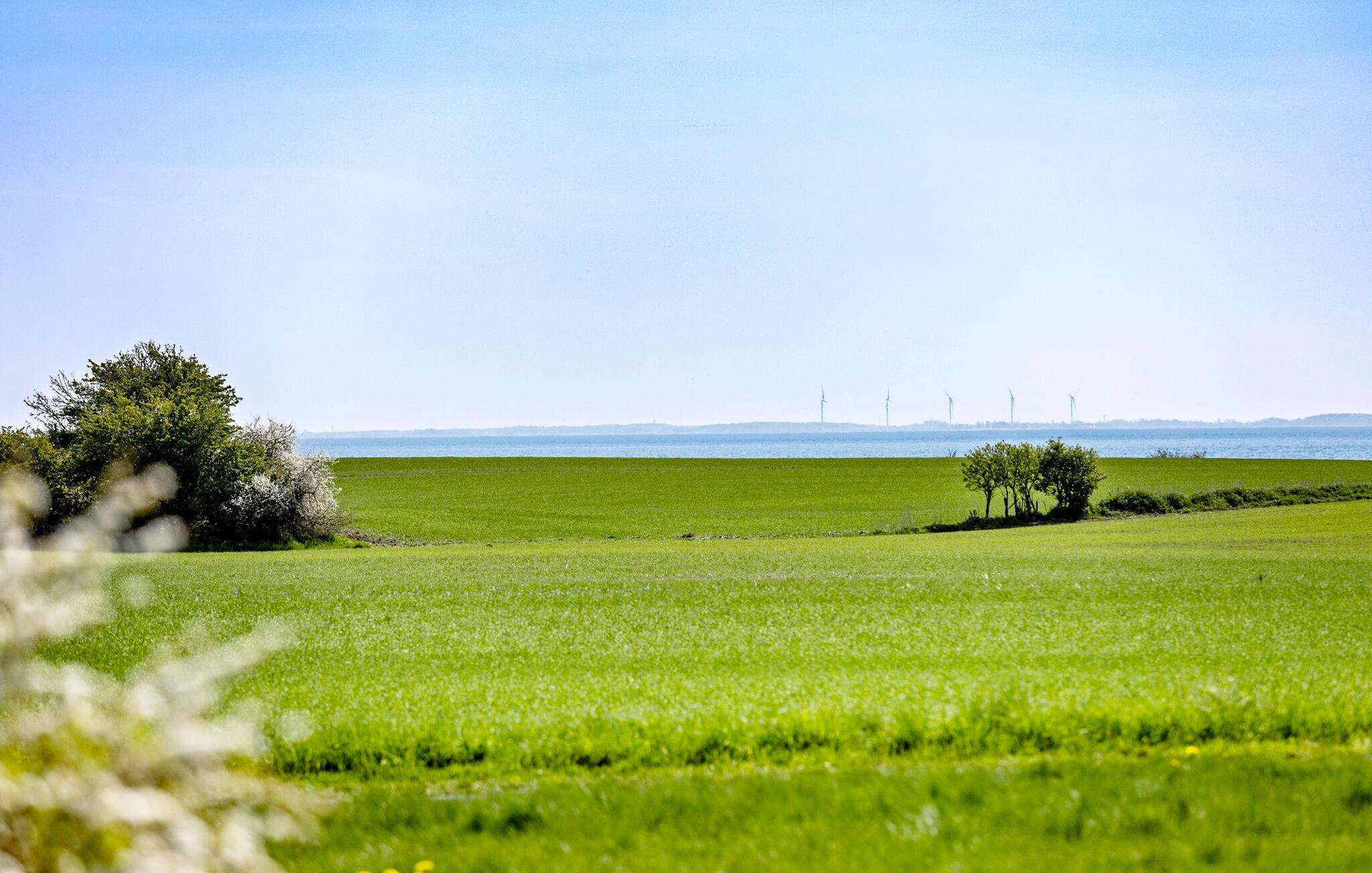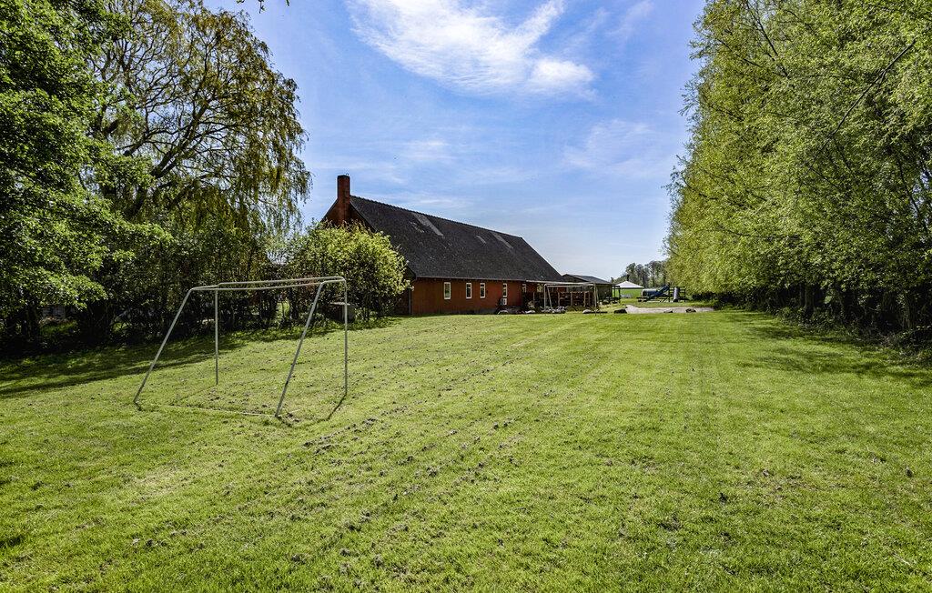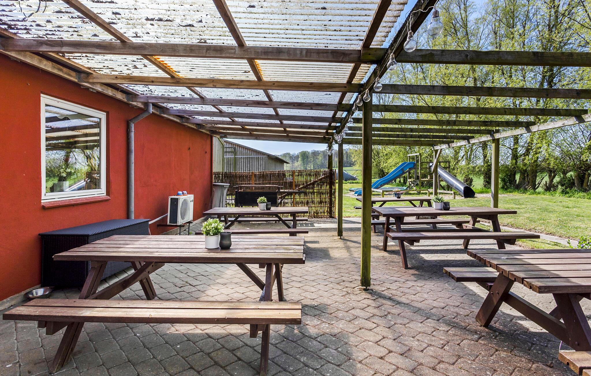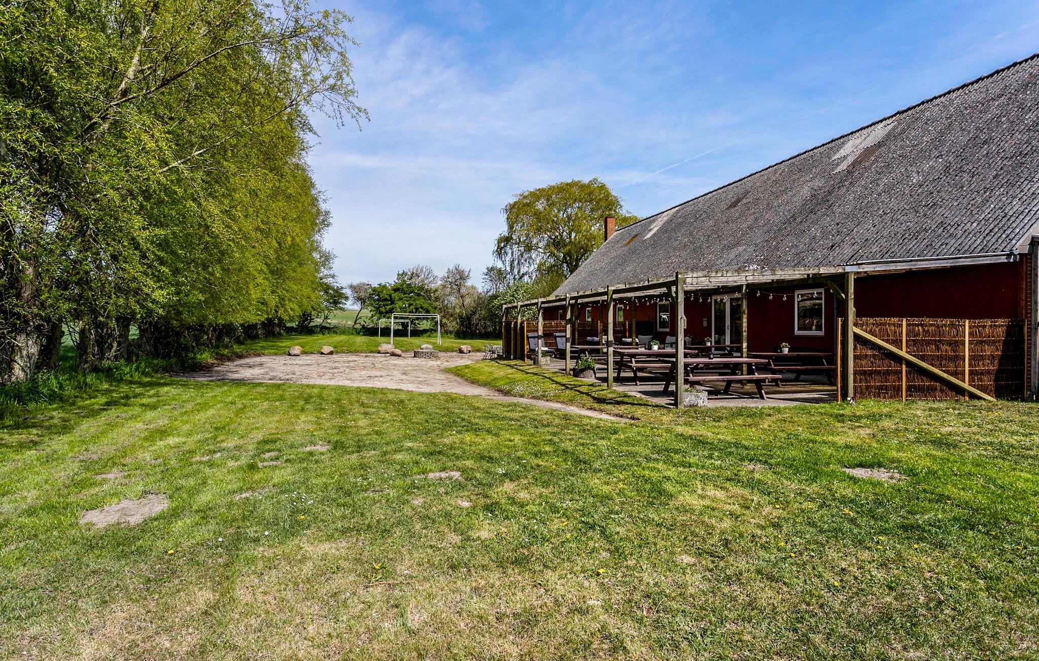 Verbringen Sie auch entspannte Stunden im geschützten Innenhof mit Lounge-Möbeln oder nehmen Sie Platz an den langen Tischen auf der überdachten Terrasse. Genießen Sie die Sonne auf den Liegen oder beobachten Sie die Kinder beim Spielen auf dem großzügigen Gelände mit Rutsche, Trampolin und Platz für Ballspiele. Das große Grundstück wird gemeinsam mit dem Haupthaus genutzt und bietet weite Ausblicke über Felder, Wald und bis zum Langelandsbælt.