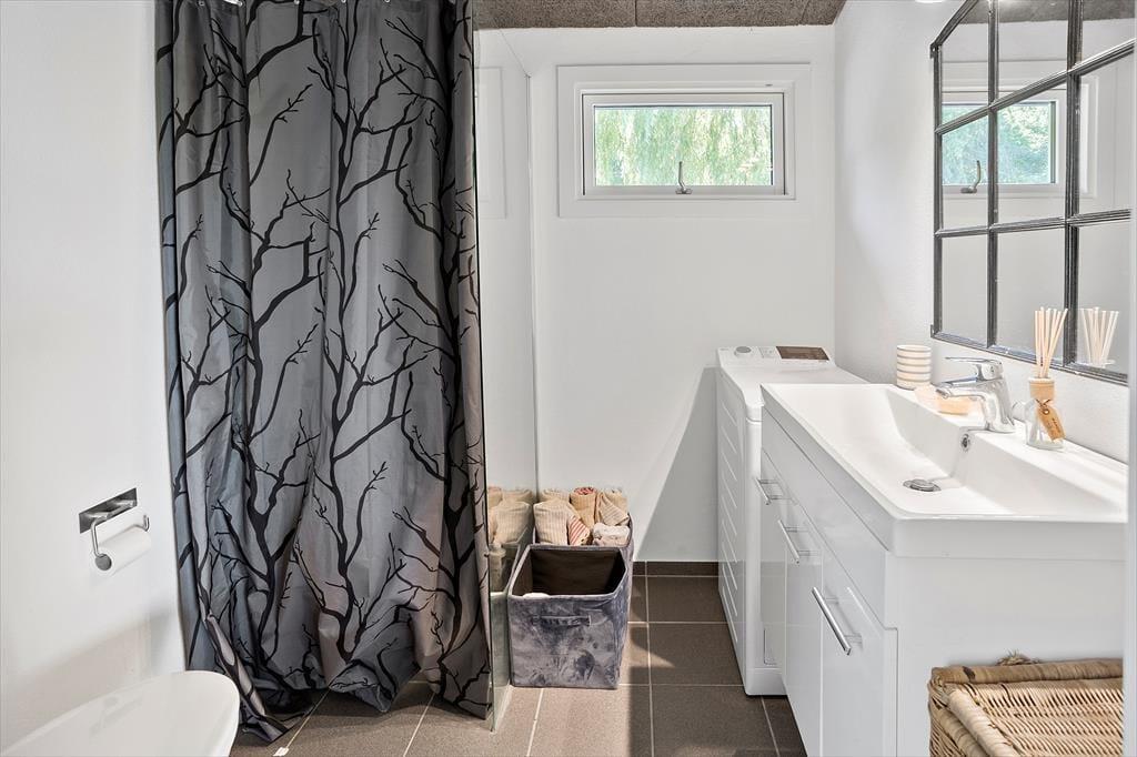 Vom Wohnzimmer aus führt ein Flur zum schönen Badezimmer des Hauses und zu zwei Schlafzimmern. Das Badezimmer umfasst ein WC, ein Waschbecken, eine Duschnische sowie eine Waschmaschine. Der eine Schlafraum umfasst ein Doppelbett und einen Schrank, der andere ein Einzelbett und ein Gästebett.