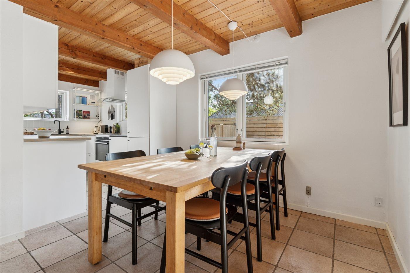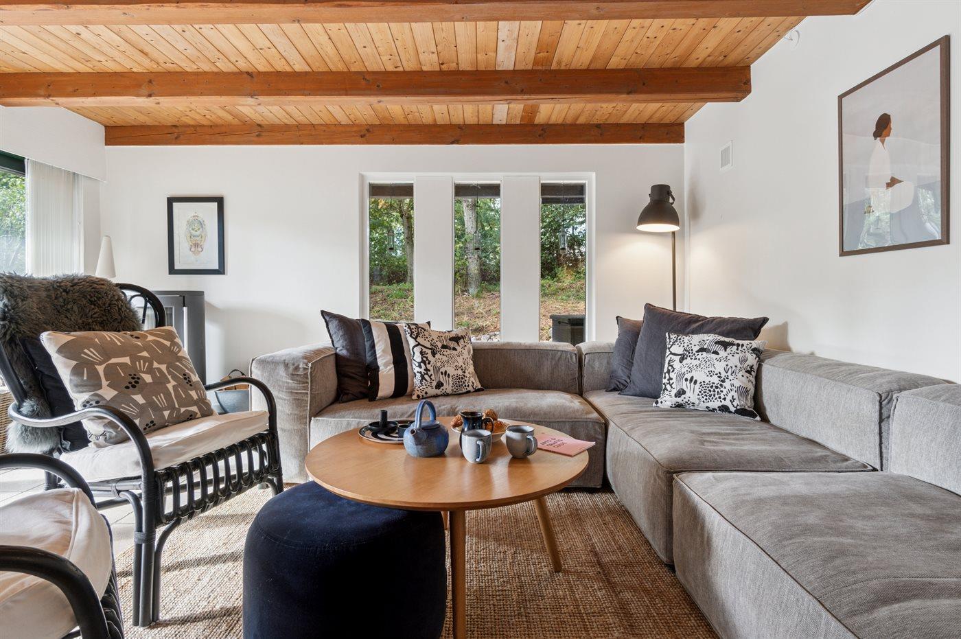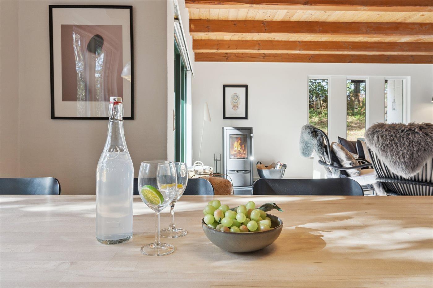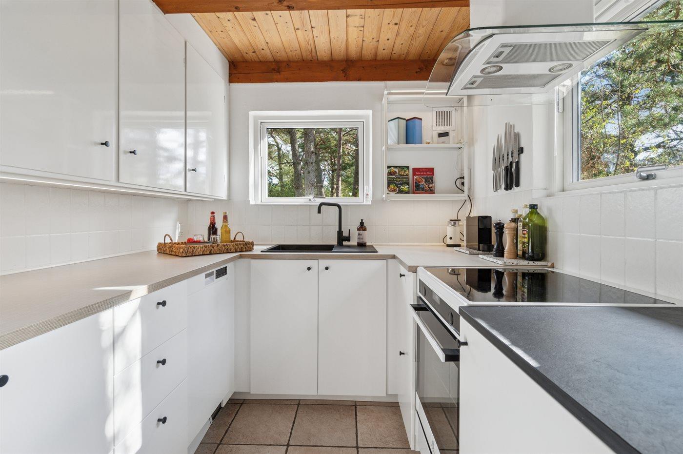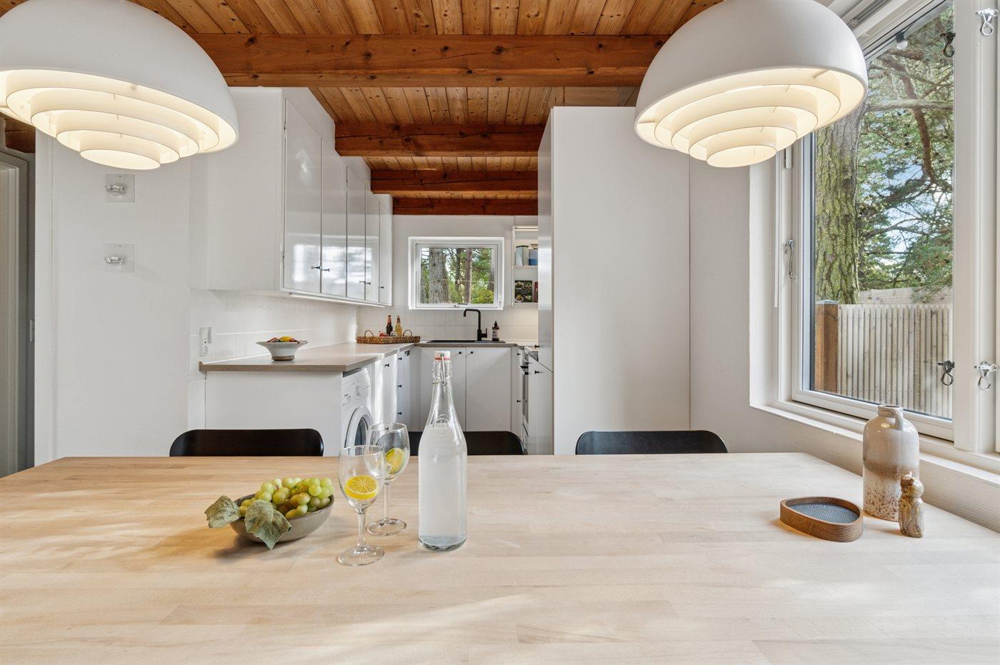 Eine große, teilweise überdachte Holzterrasse umgibt das Haus und bietet Euch die Möglichkeit, die sommerliche Wärme zu genießen und gleichzeitig die Familie mittags oder abends beim Grillen zu versammeln. Das große, helle Wohnzimmer ist mit der Küche kombiniert, die mit allem ausgestattet ist, was Ihr braucht, um die Ferienmahlzeiten zuzubereiten. Ein Badezimmer mit hellen Fliesen liegt neben der Gäste-Toilette, von der Ihr Zugang zur abgeschirmten Außendusche habt.