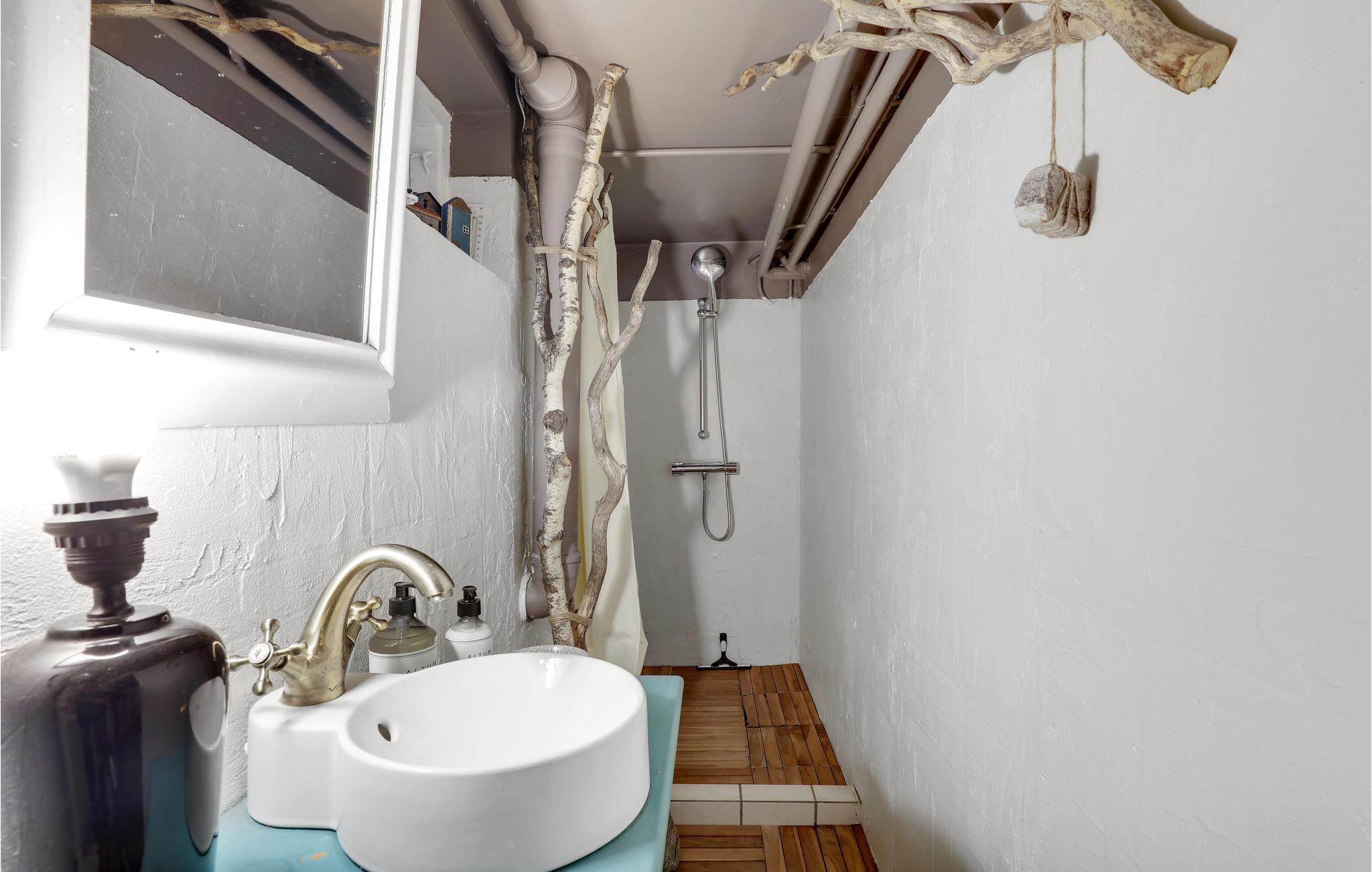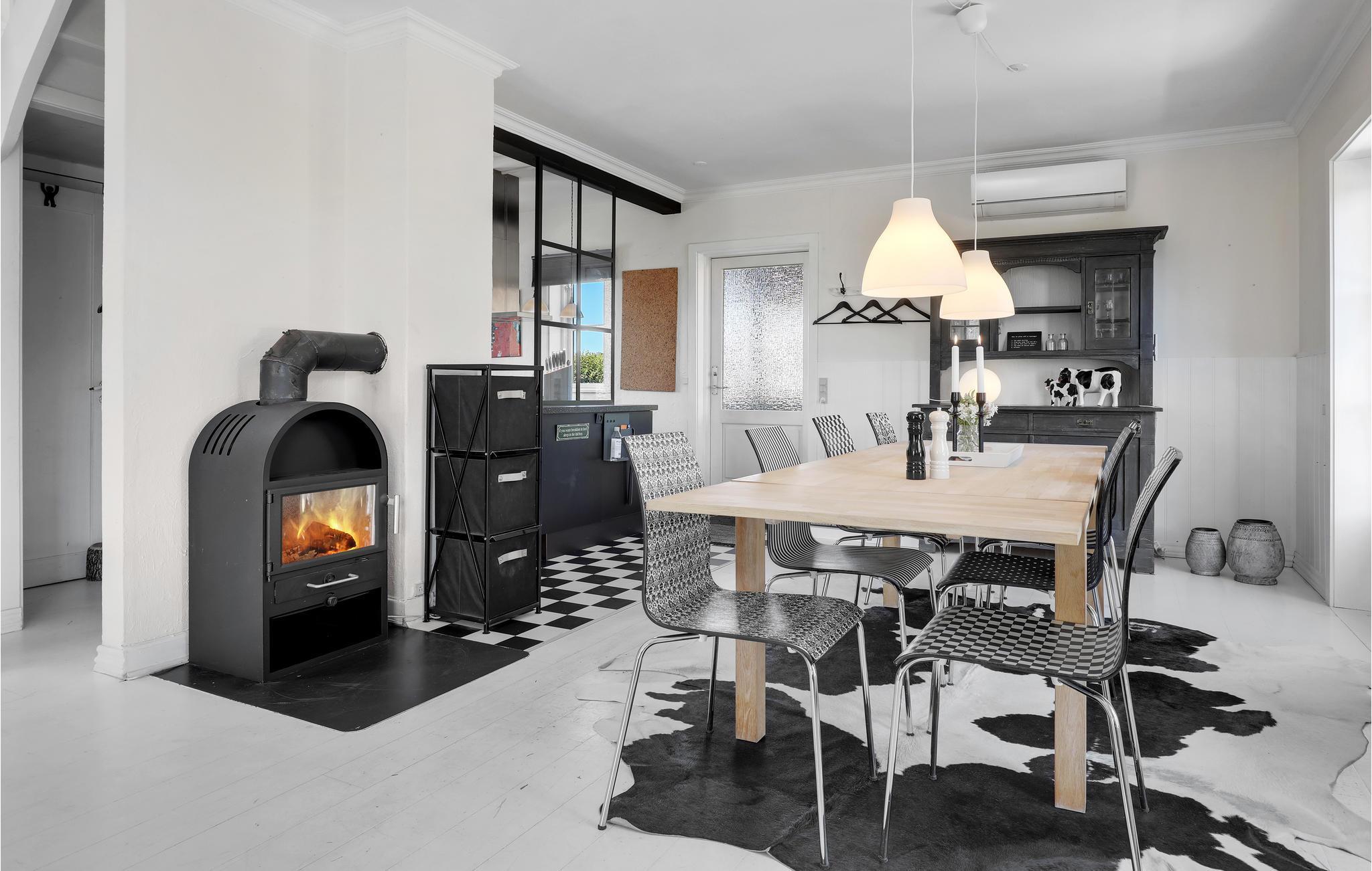 Im Erdgeschoss befindet sich ein großer Wohnraum mit Essplatz und Sofagruppe und Ausgang zur Terrasse. Die offene Küche liegt ebenfalls hier, genau wie ein Schlafzimmer mit Einzelbetten und das WC. Im 1. Stock befinden sich 2 Schlafzimmer mit Doppelbetten. Machen Sie es sich an kühleren Abenden am Kaminofen im Wohnzimmer gemütlich. Im Anbau gibt es die Möglichkeit, 2 weitere Personen unterzubringen.
