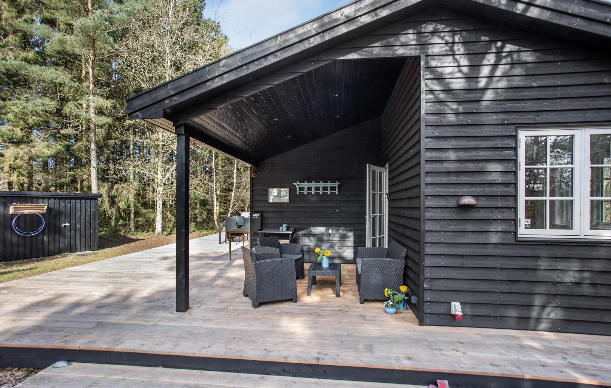 Vom Wohnzimmer aus gelangen Sie auf die teilweise überdachte Terrasse mit Gartenmöbeln, Sonnenschirm und Gasgrill. Hier können Sie der Urlaubslektüre ungestört widmen und die langen, hellen Sommerabende in vollen Zügen genießen. Das bewaldete Grundstück ist ein wunderbarer Ort für Spiel oder Entspannung, so dass die Kinder frei herumtoben und spielen können.