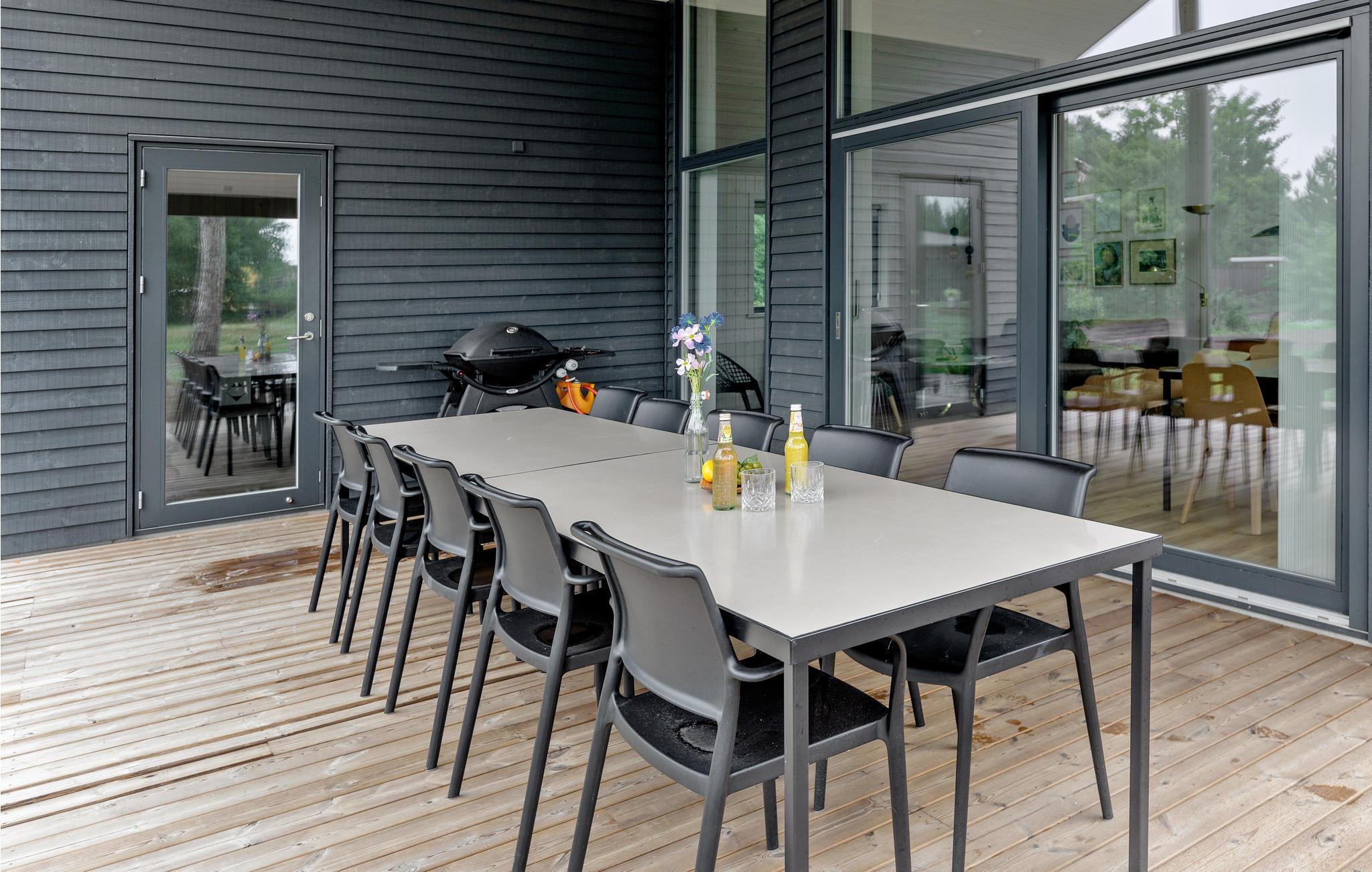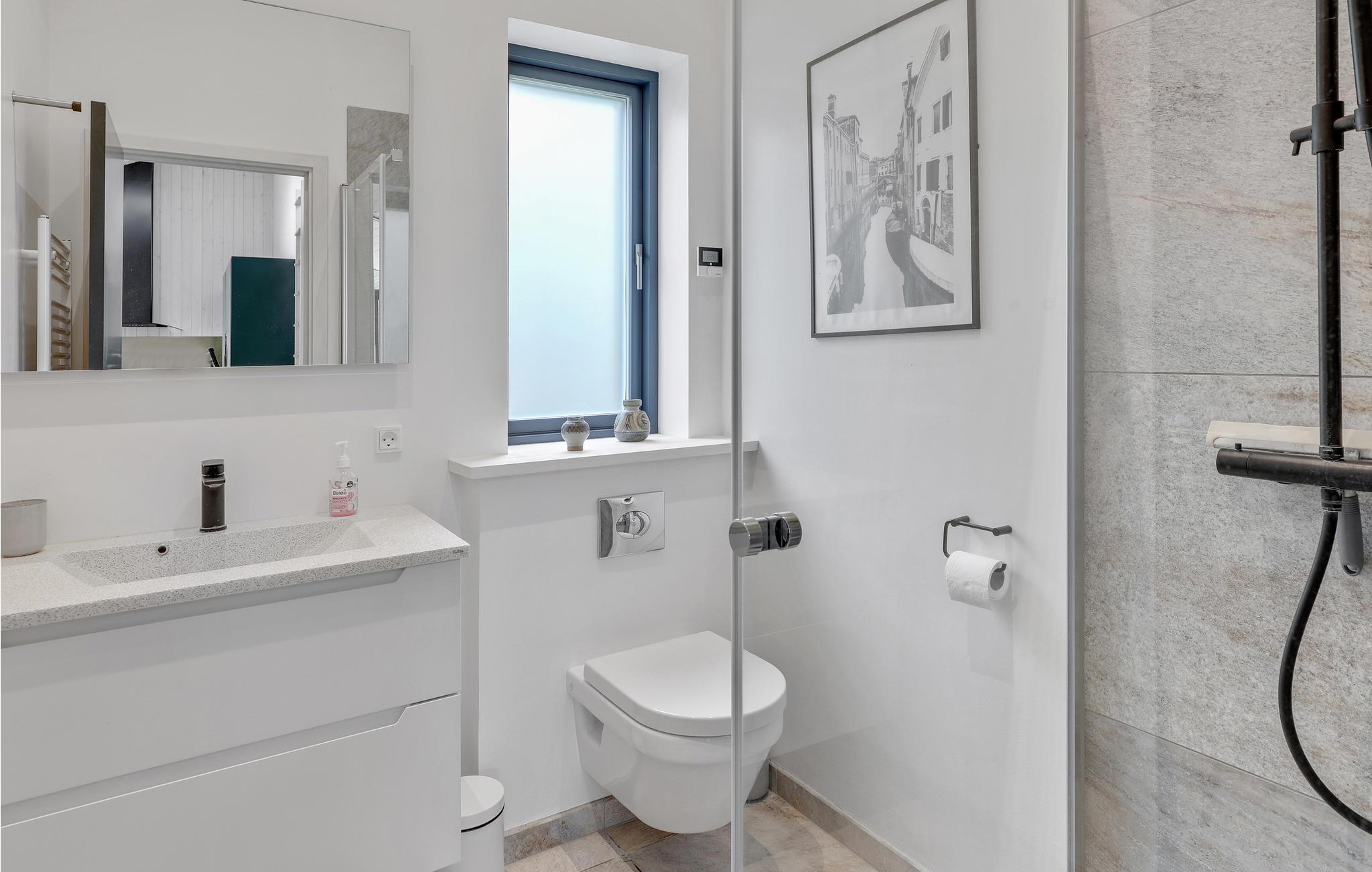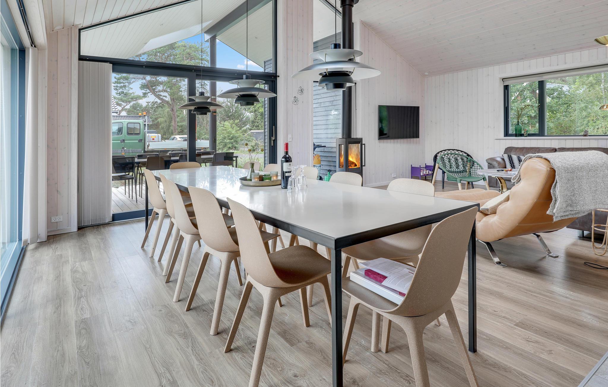 Hier wohnen Sie in einem Ferienhaus der Extraklasse mit Platz für viele Gäste. Das offene Raumkonzept bis unter den Dachgiebel in Kombination mit großen Fenstern macht das Haus sehr geräumig und hell. Die Einrichtung ist modern, eine Fußbodenheizung sorgt im ganzen Haus für ein angenehmes Raumklima. Das Wohnzimmer ist der natürliche Mittelpunkt des Hauses. Hier können Sie es sich bequem machen, Filme auf dem Flachbildschirm schauen, und im Winter die Wärme und gemütliche Atmosphäre des Ofens genießen. In der großen, offenen und sehr gut ausgestatteten Küche ist es ein Fest, leckere Gerichte gemeinsam zuzubereiten. Von den vier Schlafzimmern ist eines mit TV ausgestattet. Im Haus gibt es zudem einen großen Dachboden mit zwei Betten und zwei Badezimmern. Im Hauswirtschaftsraum finden Sie einen Gefrierschrank, eine Waschmaschine und einen Trockner. Das Haus verfügt über ein energiefreundliches Wärmepumpensystem und eine Lademöglichkeit für Elektroautos.