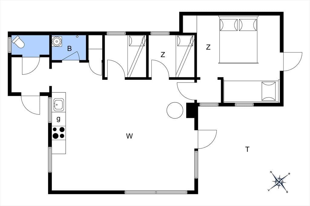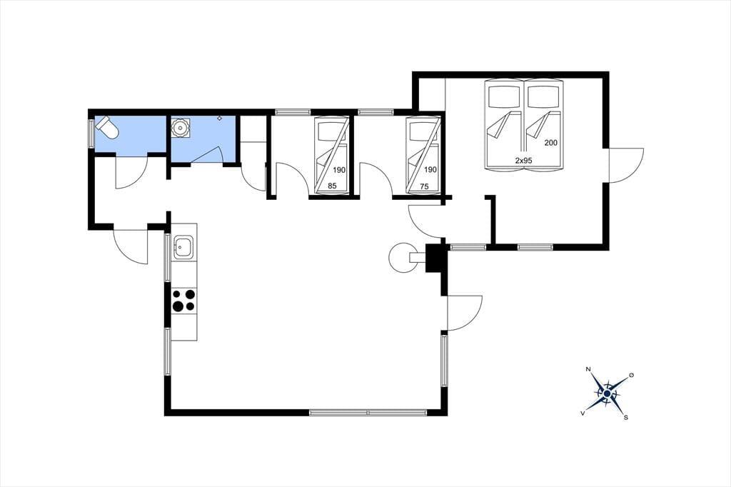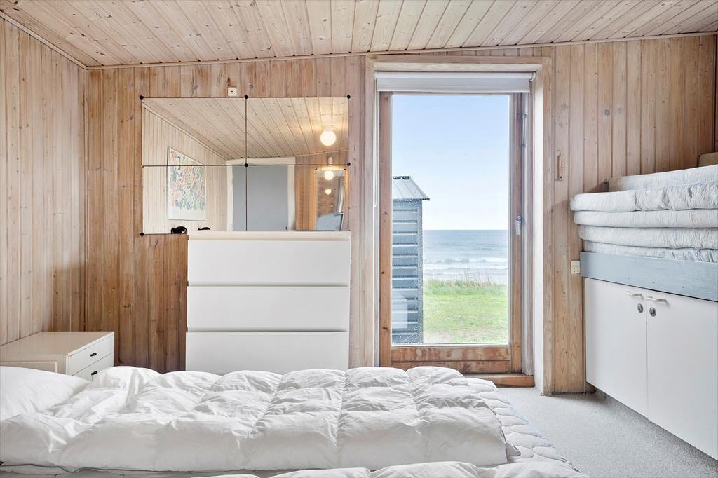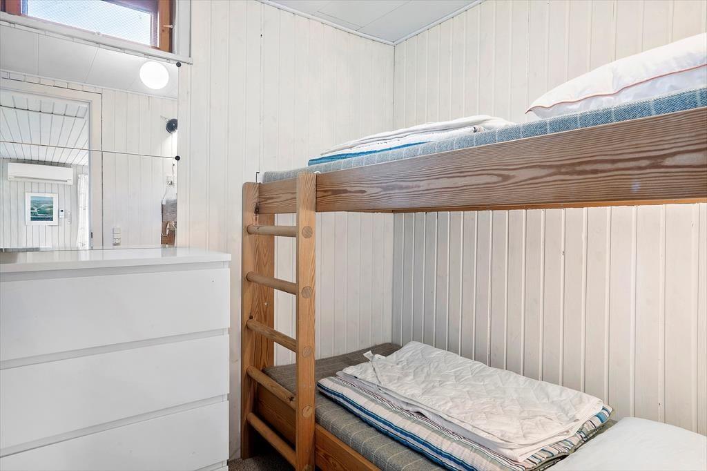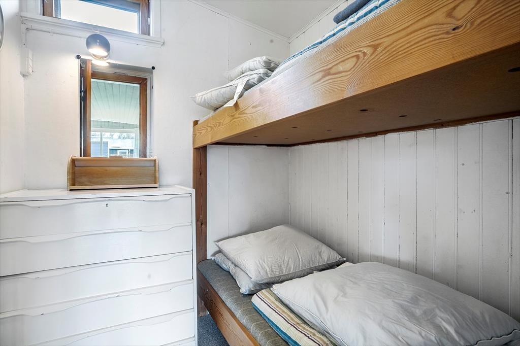 Vom Wohnraum aus gelangen Sie in die Schlafzimmer des Mietobjekts. Ihnen stehen zwei kleinere Schlafzimmer mit Etagenbetten zur Verfügung, die sich gut für Kinder eignen. Der große Schlafraum mit einem schönen Tageslichteinfall beinhaltet ein Doppelbett und viel Schrankfläche. In diesem Raum ist darüber hinaus ein zusätzliches Einzelbett untergebracht. Vom Schlafraum treten Sie durch eine Terrassentür direkt in den Garten und genießen Ausblick auf das Wasser. Die Dusche und das WC sind in verschiedenen Räumen untergebracht, die beide vom Eingangsbereich aus erreichbar sind. Der Eingangsbereich bietet Platz zum Aufhängen Ihrer Oberbekleidung. Das Ferienhaus ist nicht sonderlich groß, dafür aber funktionell und gemütlich und begeistert mit seiner grandiosen Lage.