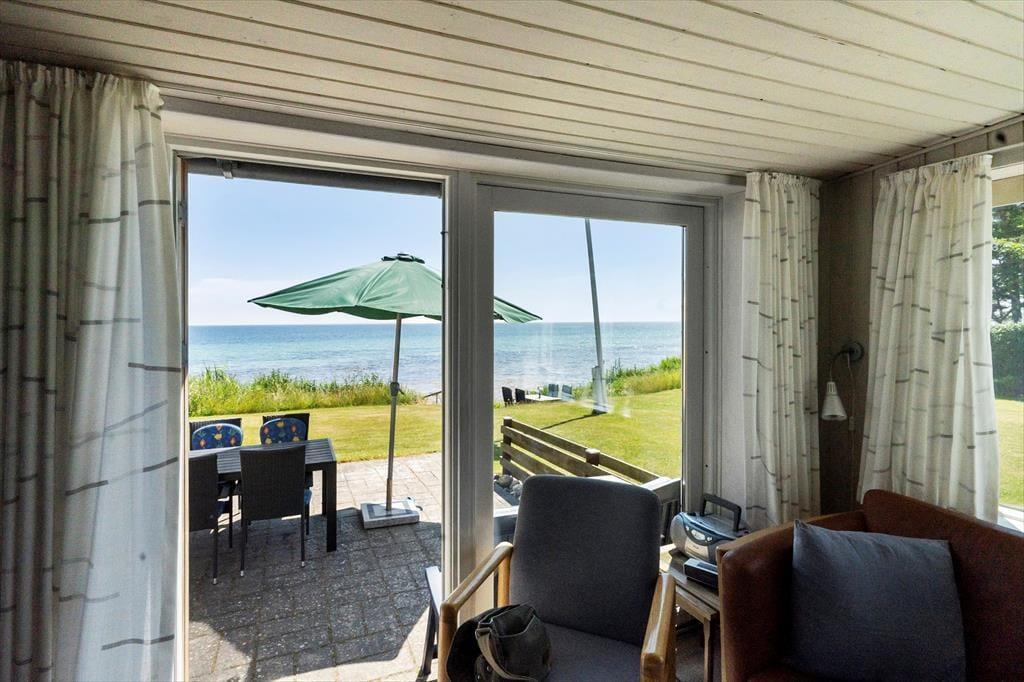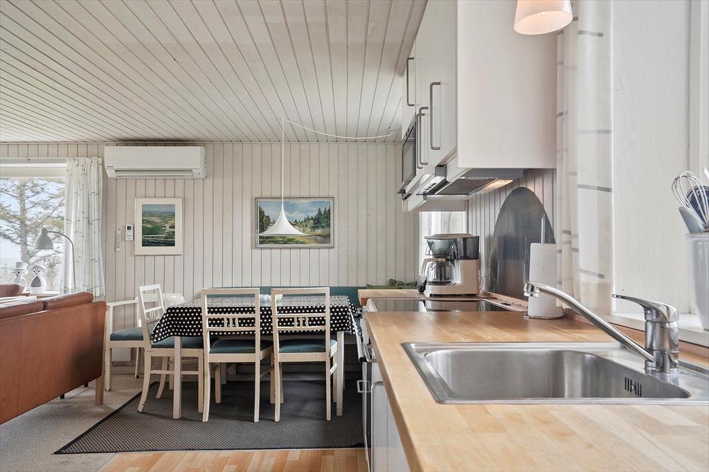 Das quadratische, reizende Ferienhaus präsentiert sich angenehm gepflegt und schön hell. Die offene Küche verfügt über einen gemütlichen Essplatz mit einer Bank und grenzt unmittelbar an den stimmungsvollen Wohnraum. Mit angenehm viel Schrankfläche, einem Geschirrspüler, einem Kühl- und Gefrierschrank und weiteren Annehmlichkeiten bietet Ihnen die Küche gute Arbeitsbedingungen. Die große Fensterpartie vor der Polstersitzgruppe verwöhnt mit Meerblick in Richtung Südosten. Durch die Terrassentür treten Sie hinaus auf die gepflasterte Terrasse, vor der sich der Garten und das Strandgrundstück erstrecken. Im kombinierten Küchen-, Wohn- und Essbereich werden Sie viel gemeinsame Zeit beim Zubereiten der Mahlzeiten, beim Kartenspielen und während gemütlicher Filmabende verleben. Der Fernseher empfängt dänische und deutsche Sender.