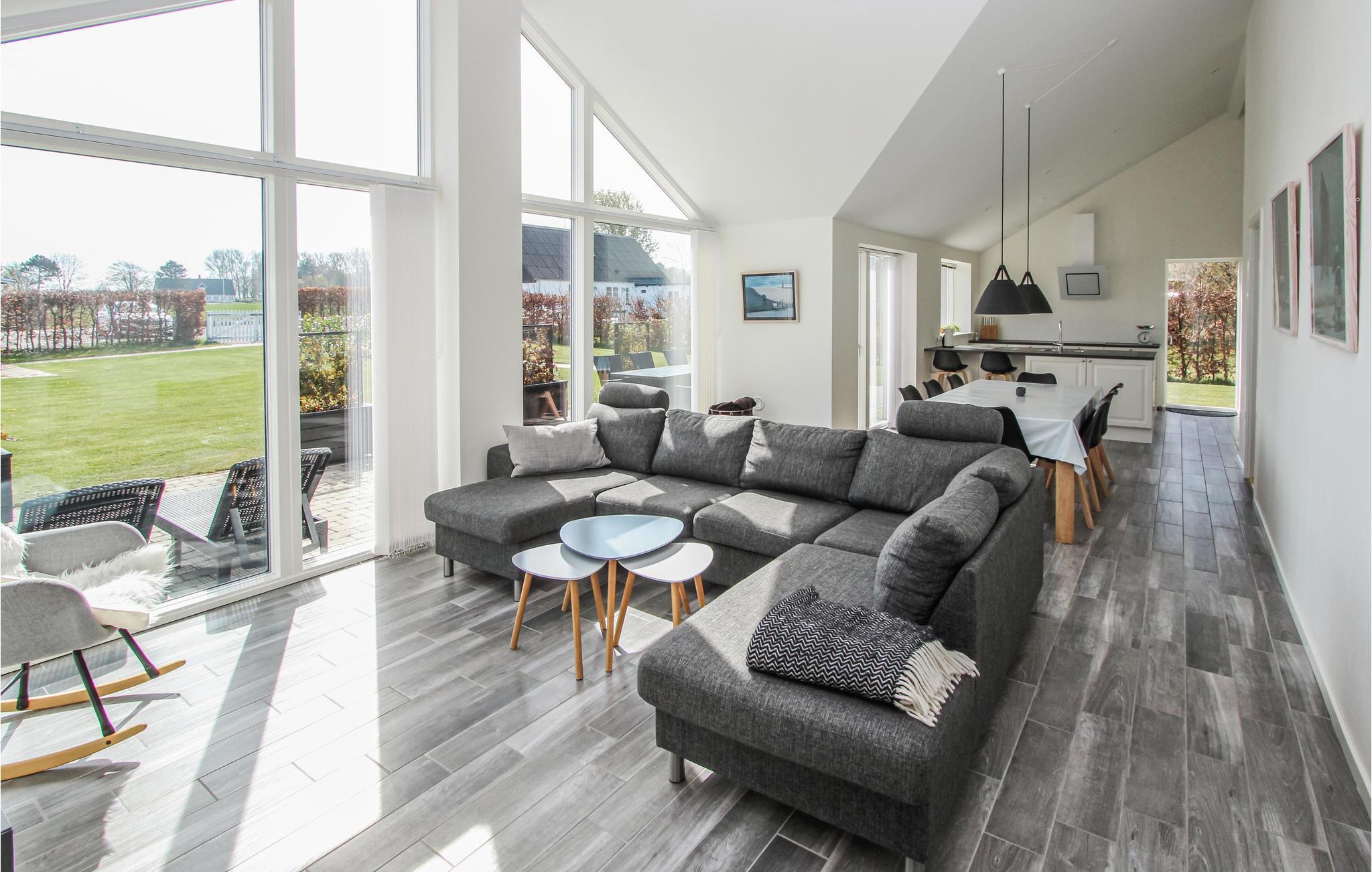 In dem modernen Ferienhaus genießen Sie überall im Wohnbereich einen schönen Blick ins Freie. Lassen Sie sich mit einer Tasse Kaffee auf dem großzügigen Sofa nieder, legen Sie die Beine hoch und genießen Sie die Aussicht durch die bodentiefen Fenster - so fühlt sich Urlaubsentspannung an!