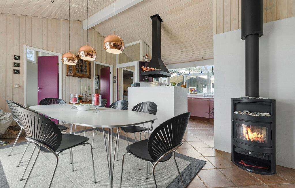 Ihr gemütliches Ferienhaus in erster Reihe zum Wasser bietet eine angenehme Basis für einen naturnahen Aufenthalt. Hier finden Sie den passenden Rahmen für ruhige Stunden mit der Familie. Der Wohnbereich ist offen gestaltet und lädt mit seinen großen Fensterflächen und dem Kaminofen zum Verweilen ein. Machen Sie es sich auf den bequemen Sitzgelegenheiten gemütlich oder genießen Sie eine Mahlzeit am stilvollen Esstisch. In der angrenzenden Küche finden Sie, was Sie zum Kochen brauchen sowie ausreichend Stauraum.