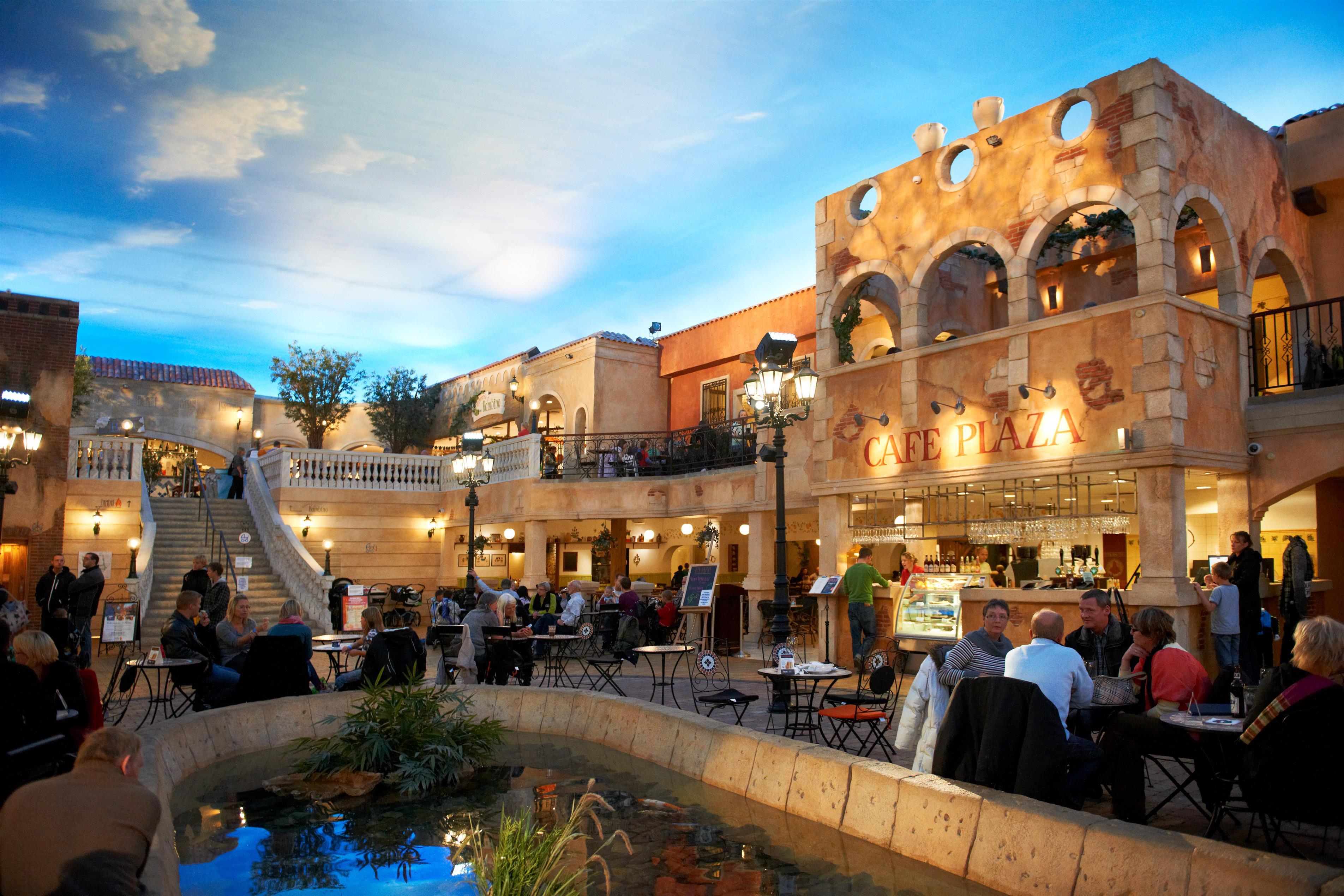 In der eindrucksvollen Arkade ist der Himmel immer blau und hier fühlt man sich an einen Ort weit im Süden versetzt. Hinter den schönen südländischen Hausfassaden liegen gemütliche und kinderfreundliche Restaurants, spannende Shops und jede Menge Unterhaltung für die ganze Familie. Wenn sich der Tag dem Ende zuneigt, wird auf der Bühne im schönen Amphitheater Unterhaltung geboten.