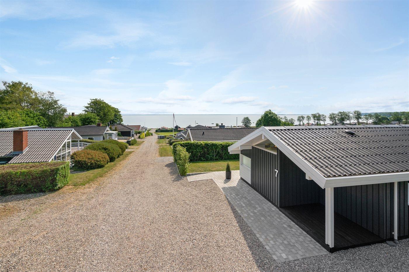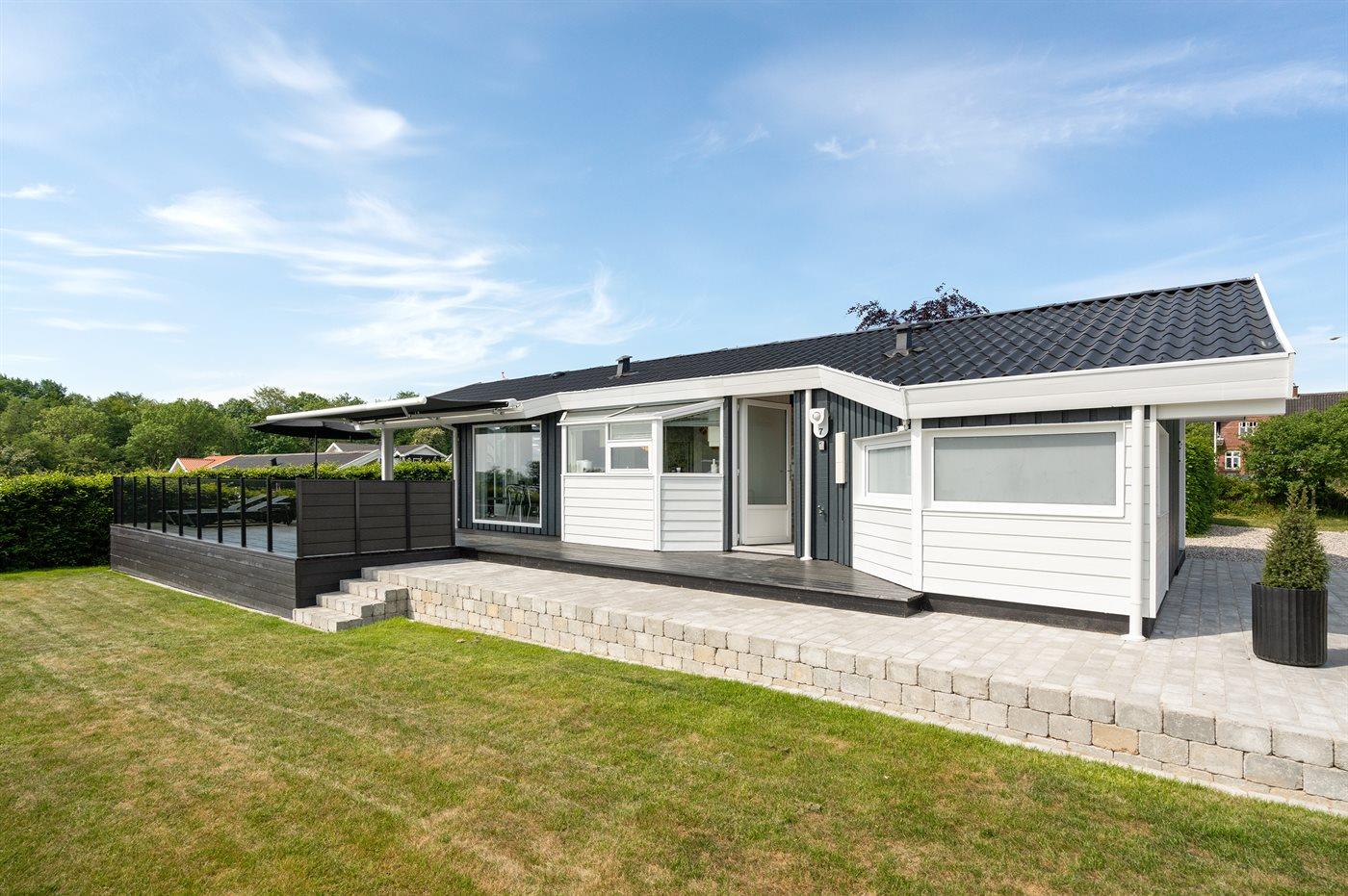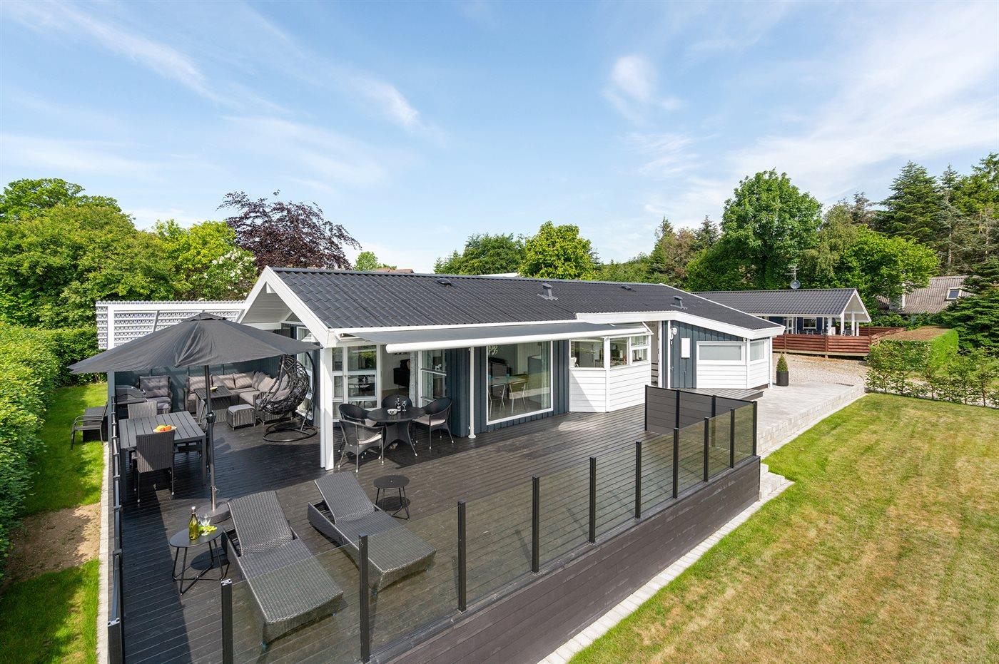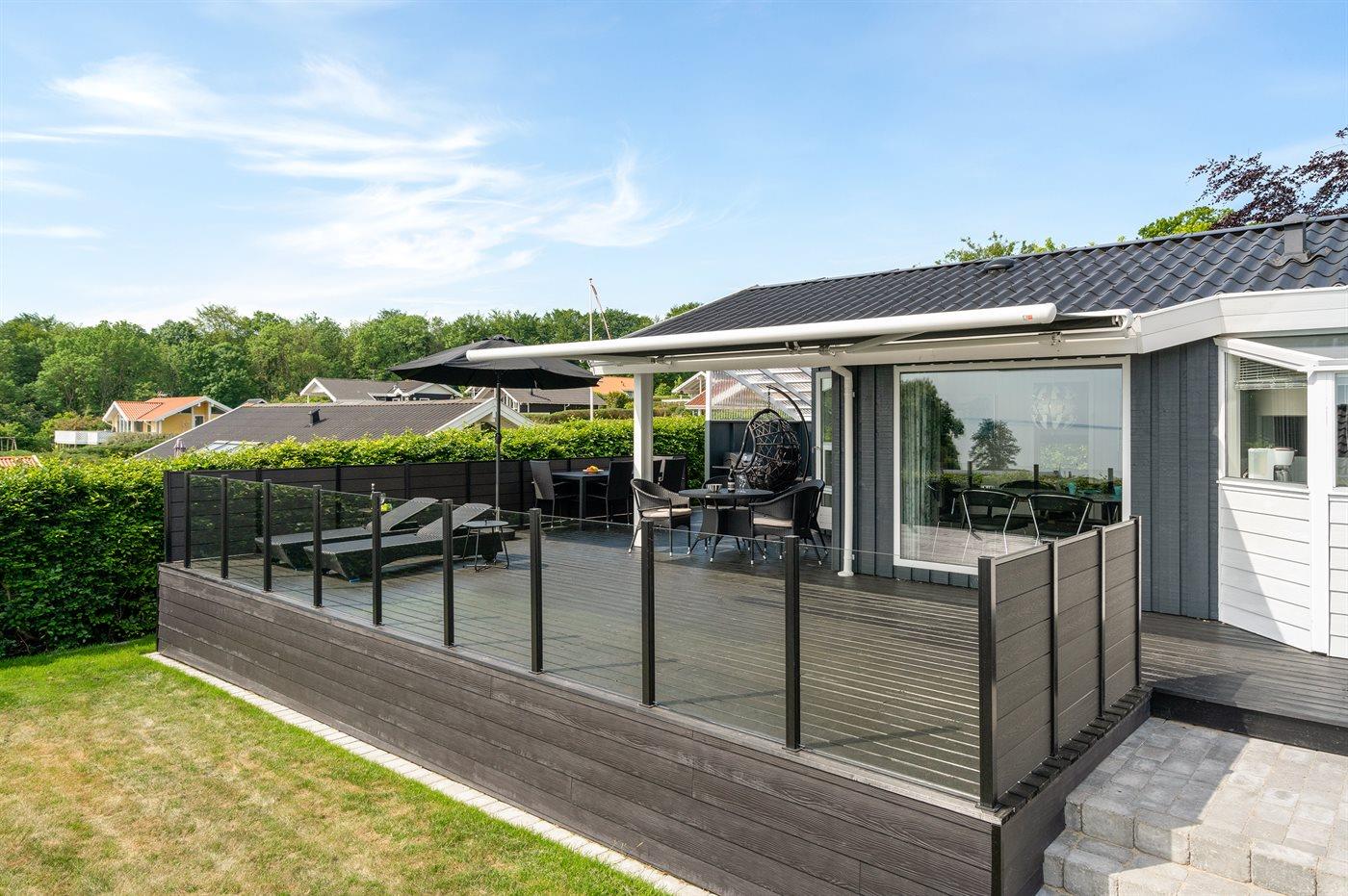 Schönes Ferienhaus auf einem tollen Gartengrundstück in nur 100 Metern Entfernung vom Sandstrand gelegen. Vom Haus und Grundstück aus haben Sie einen tollen Panoramablick aufs Wasser.