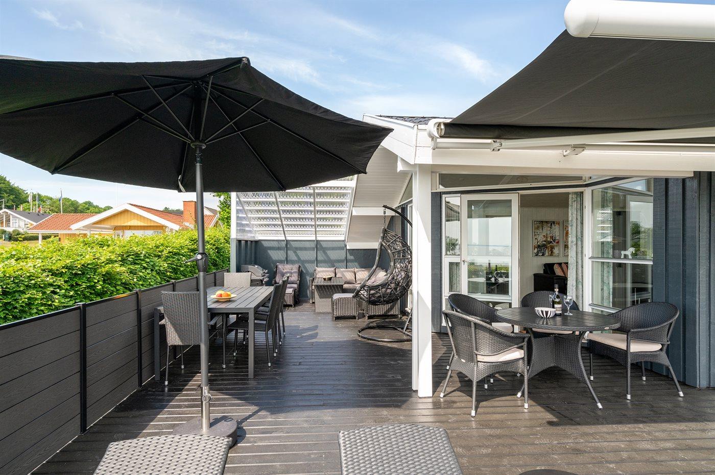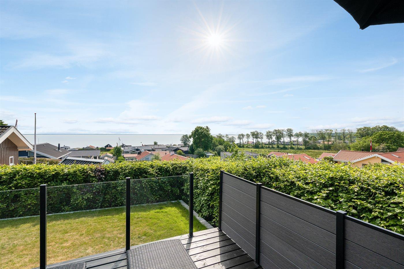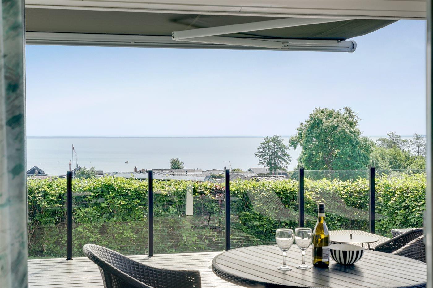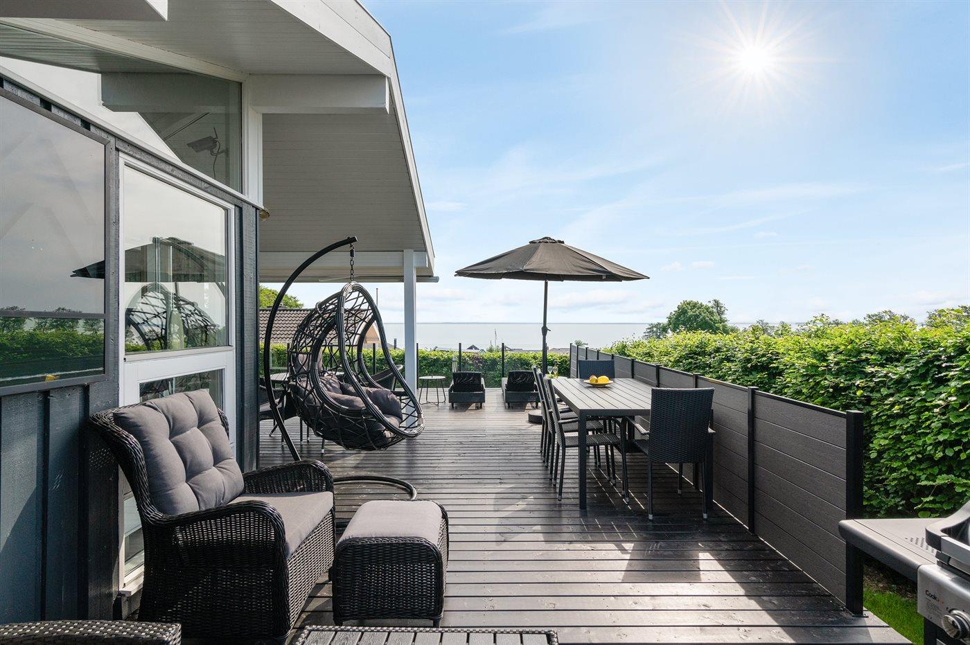 Schönes Ferienhaus auf einem tollen Gartengrundstück in nur 100 Metern Entfernung vom Sandstrand gelegen. Vom Haus und Grundstück aus haben Sie einen tollen Panoramablick aufs Wasser.