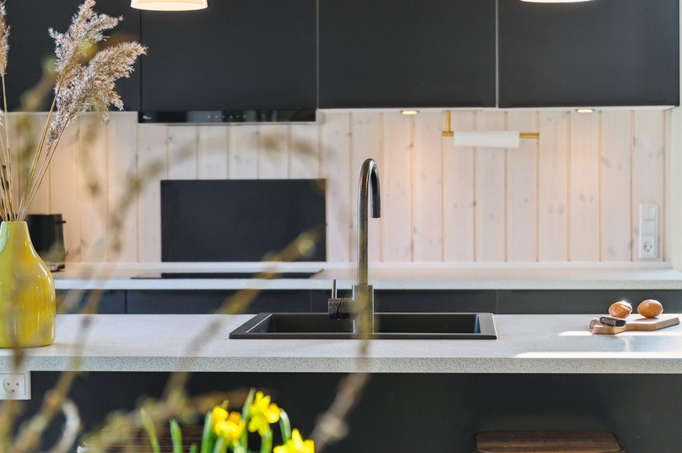 Die Küche ist mit Kühlschrank ausgestattet. Außerdem gibt es 4 Induktions-Kochzonen, Umluftofen, Mikrowelle sowie Geschirrspüler.