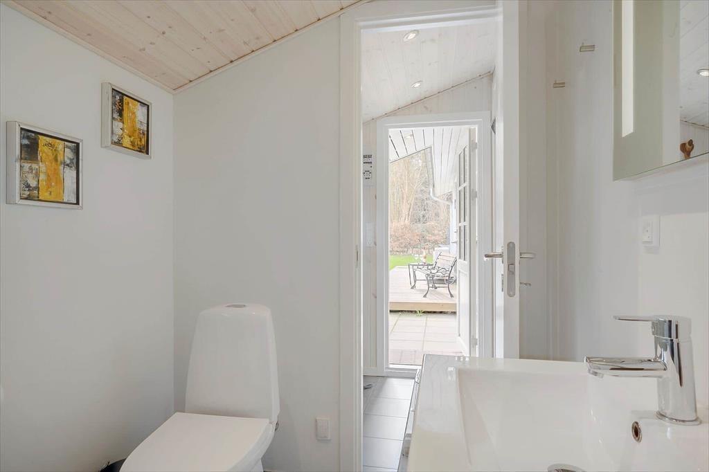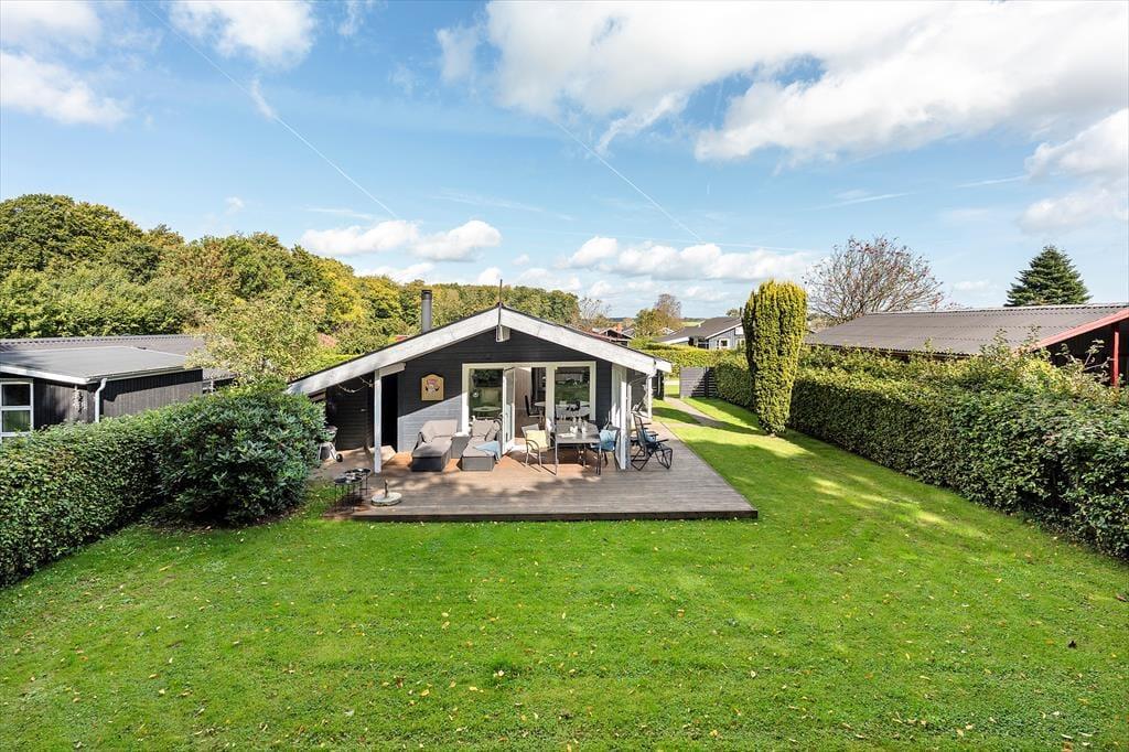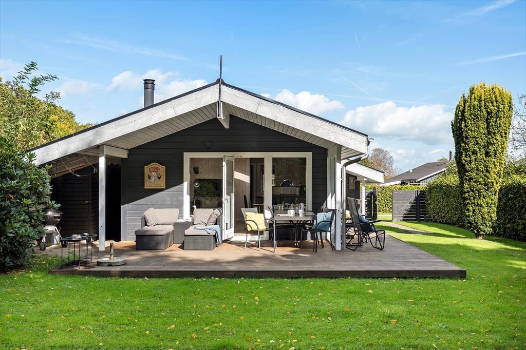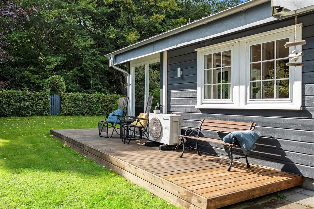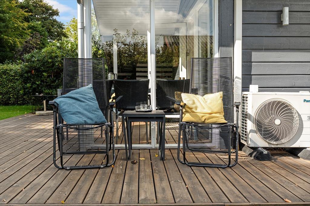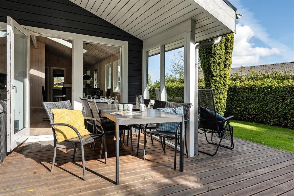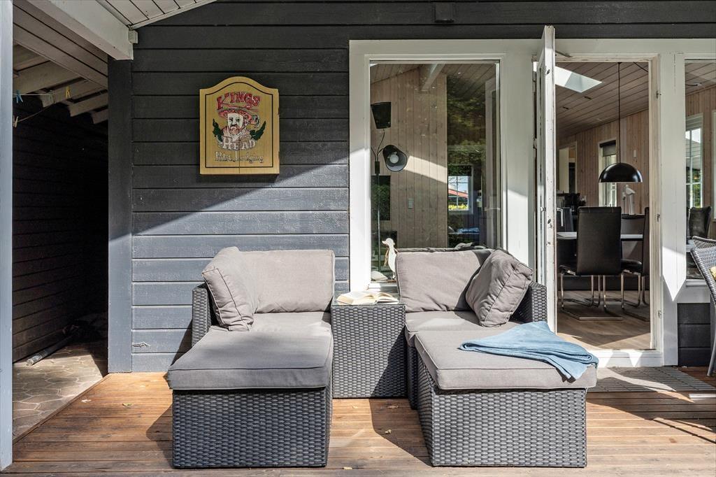 Die teilweise überdachte Holzterrasse des Ferienhauses wird während des Urlaubs schnell zu einem beliebten Aufenthaltsort. Hier kannst du deinen Morgenkaffee geschützt vor Tau genießen, während die ersten Sonnenstrahlen des Tages langsam die Luft erwärmen, oder die Familie zu langen, gemütlichen Abenden mit Grill und guten Gesprächen versammeln. Die Terrasse ermöglicht es, sich bei fast jedem Wetter draußen aufzuhalten, und bietet sowohl Sonne als auch Schatten im Laufe des Tages. Das umliegende Grundstück lädt zu Spiel, Entspannung und ruhigen Momenten ein, in denen du dem Zwitschern der Vögel lauschen und die Ferienstimmung auf dich wirken lassen kannst. Dank der kurzen Entfernung zum Strand ist es ganz einfach, spontan ans Wasser zu gehen – vielleicht mit einem Handtuch über der Schulter und wenige Minuten später Sand zwischen den Zehen. Nach einem Tag am Meer kehrst du ins Ferienhaus zurück, spülst das Salzwasser ab und setzt den Urlaub in ruhiger und privater Umgebung fort.