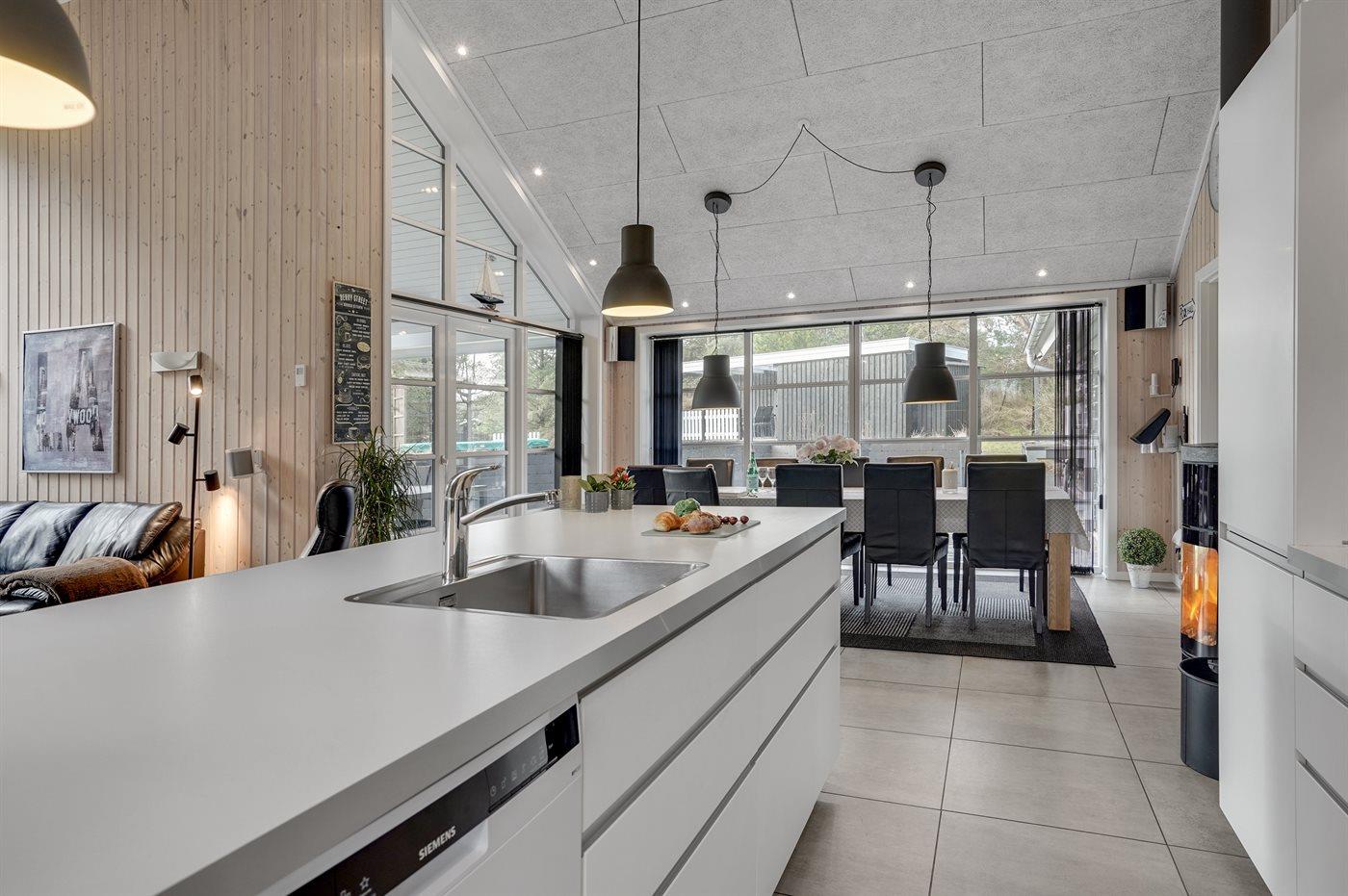 Die Küche ist mit Kühlschrank ausgestattet. Außerdem gibt es 4 Induktions-Kochzonen, Umluftofen, Mikrowelle, Airfryer sowie Geschirrspüler.
