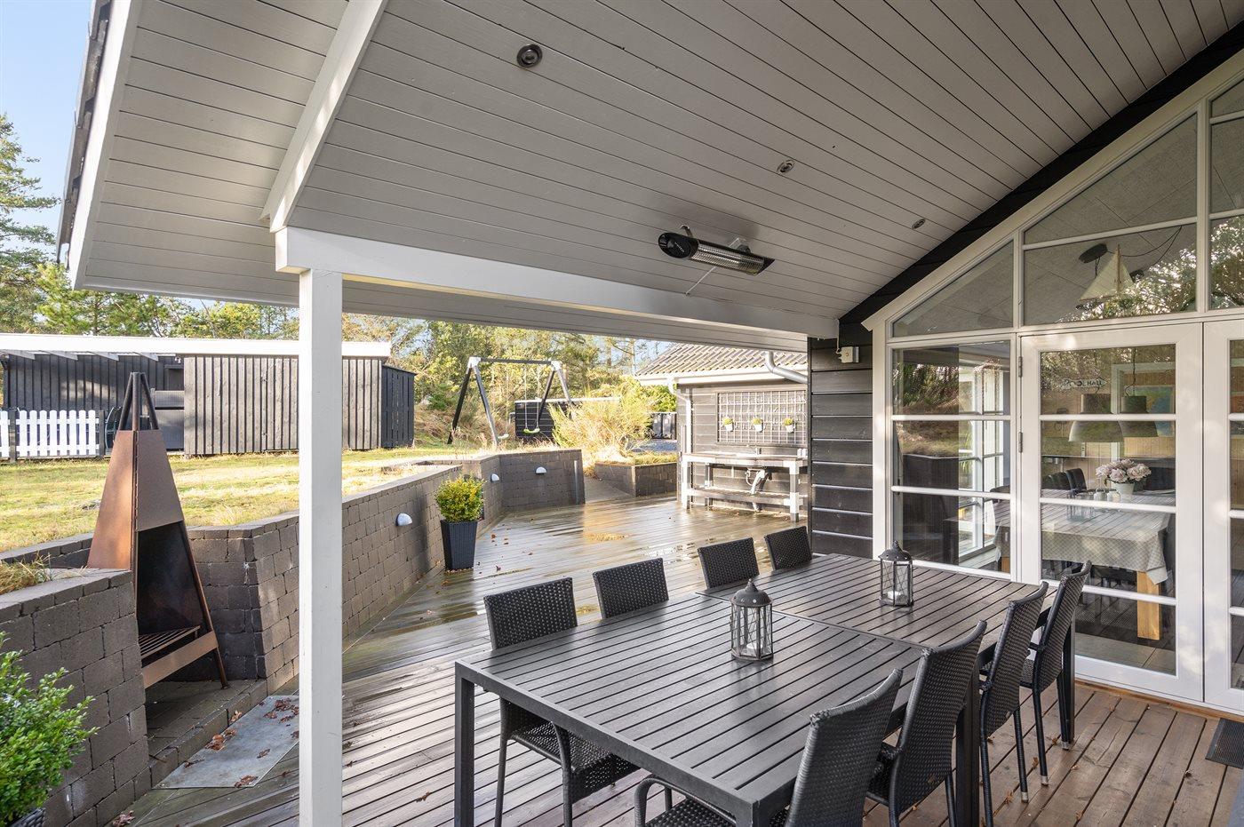Die Ferienunterkunft liegt auf einem 1479 m² großen Naturgrundstück. Die Entfernung zum Meer beträgt 270 m. Die nächste Einkaufsmöglichkeit liegt 3000 m entfernt. In einem Abstand von 2500 m gibt es einen Golfplatz. Es steht ein 135 m² Terrassenareal zur Verfügung. Außerdem gibt es 30 m² überdachte Terrasse. Geräteraum. Schaukel. Trampolin. Spielturm. Rutsche. Petanque. Außendusche. An Sommerabenden sorgt der Außenkamin für eine gemütliche Atmosphäre und es steht außerdem ein Terrassenheizstrahler zur Verfügung. Es steht ein Grill zur Verfügung. Es ist ein Ladestecker für Elektroautos installiert. Parkplatz auf dem Grundstück.