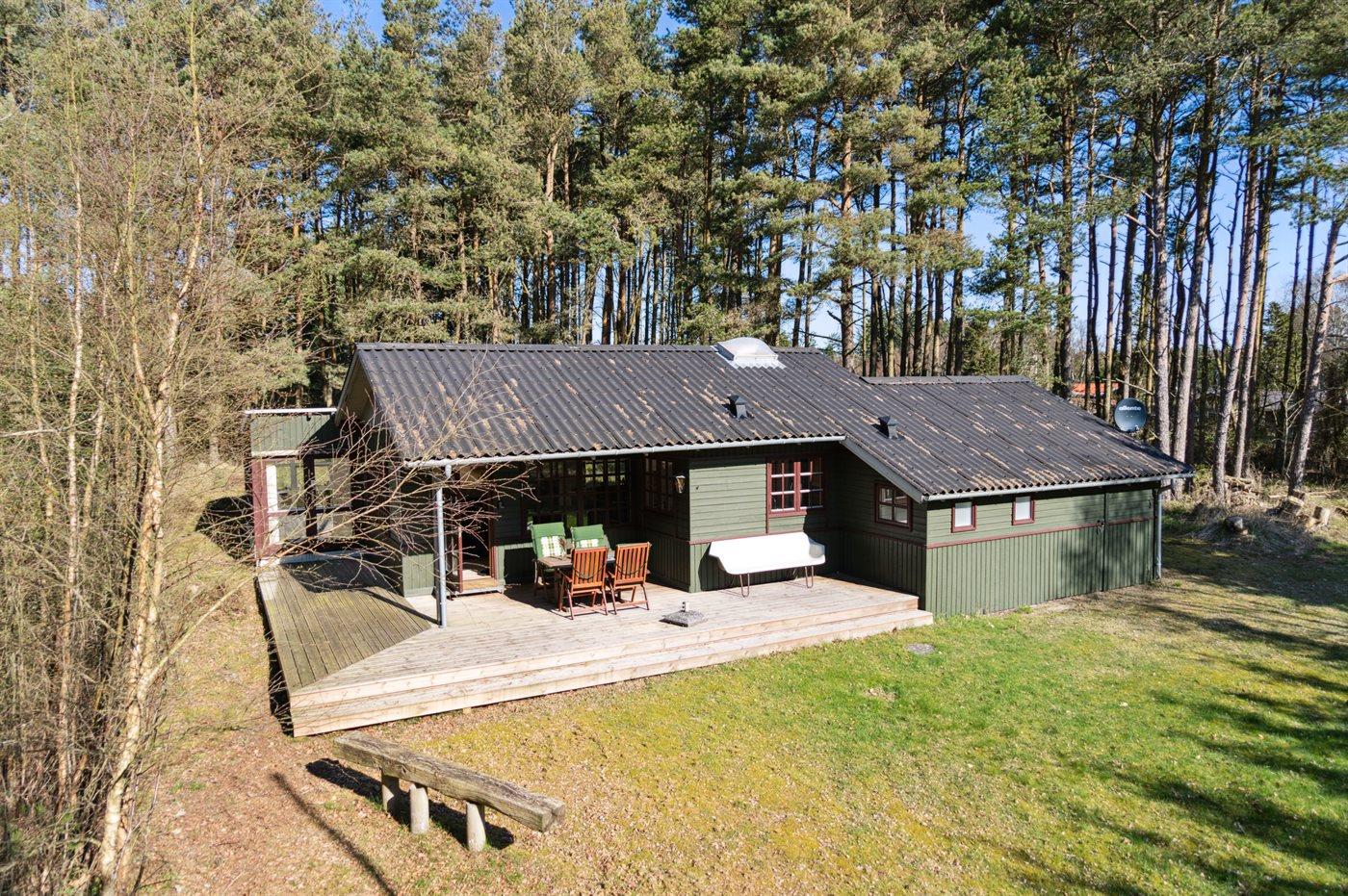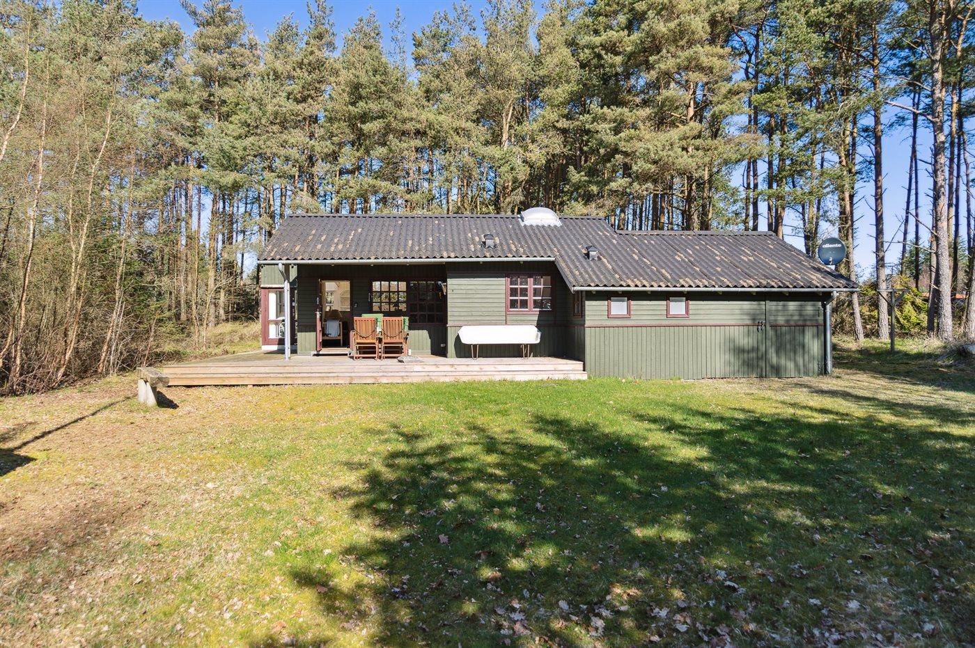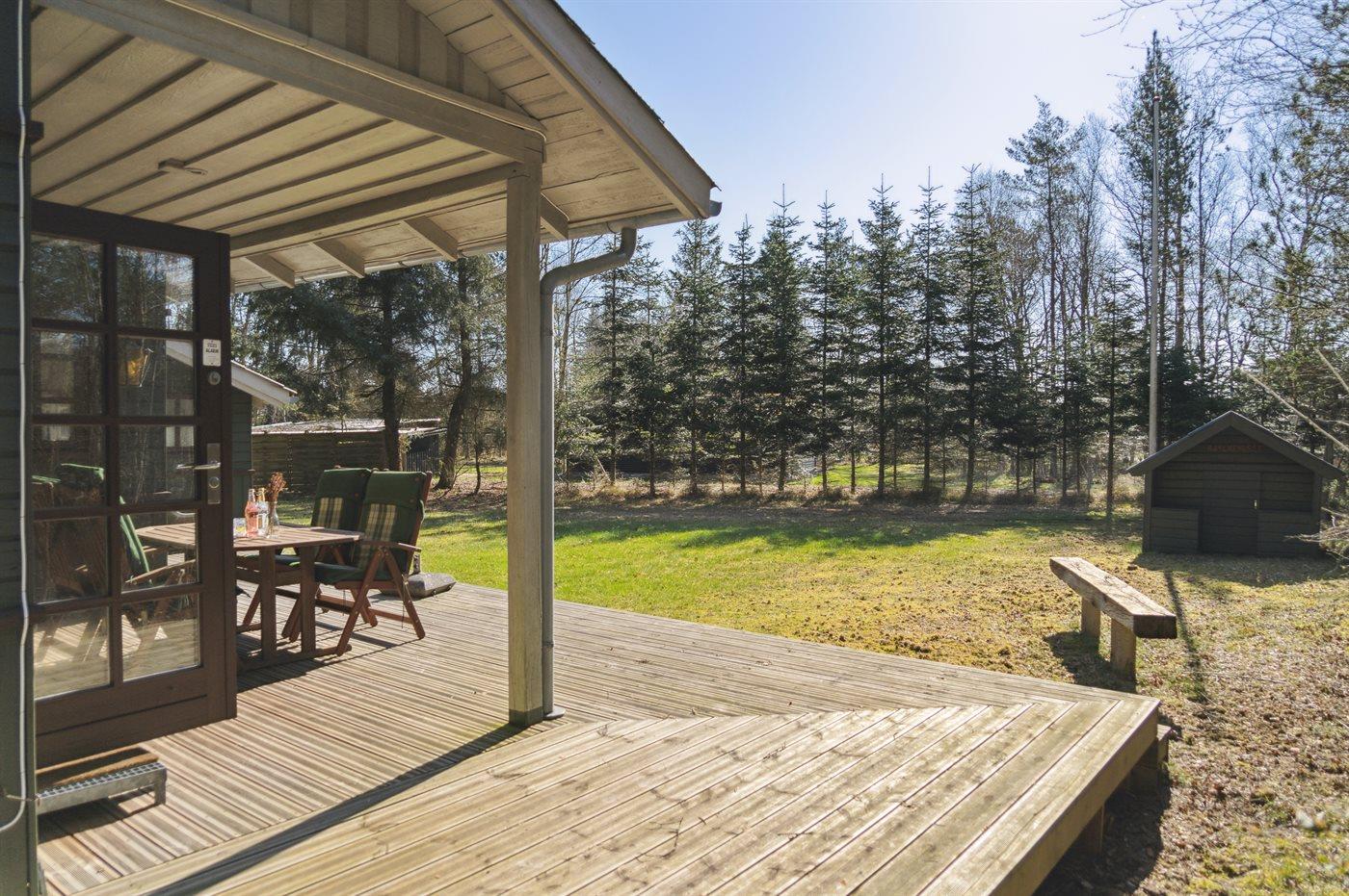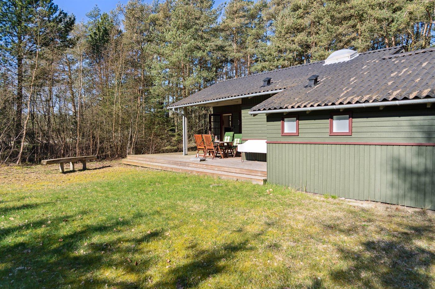 Das Ferienhaus liegt auf einem von Bäumen umgebenen Grundstück, sodass Sie sich ungestört im Garten aufhalten und die Ruhe genießen können. Es gibt sowohl eine offene als auch eine überdachte Terrasse, auf denen Sie Ihren Urlaub ganz unabhängig vom Wetter genießen können.