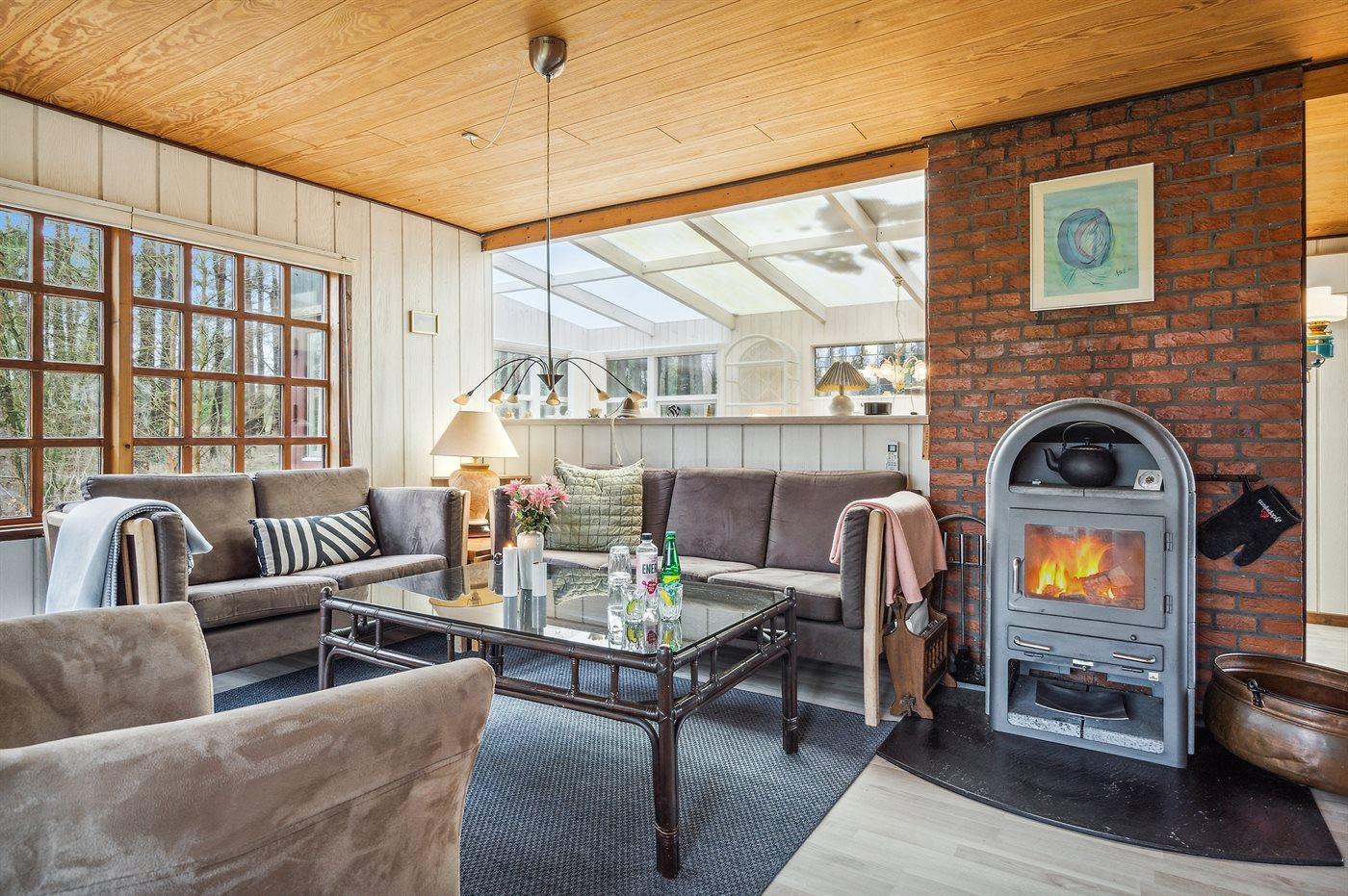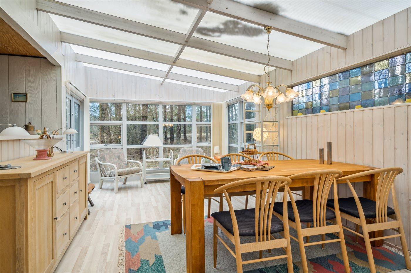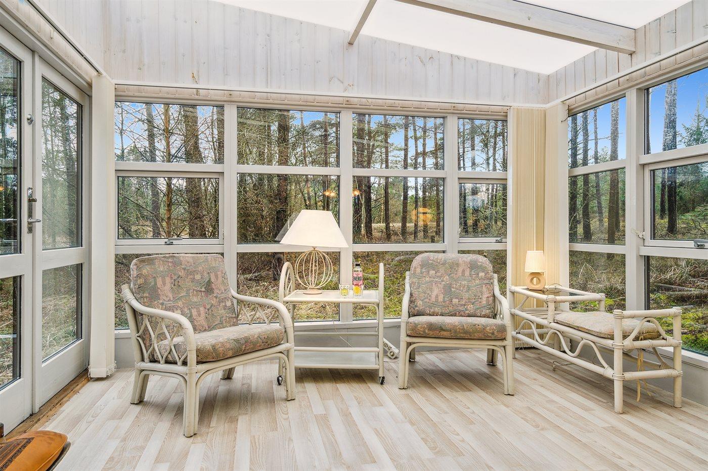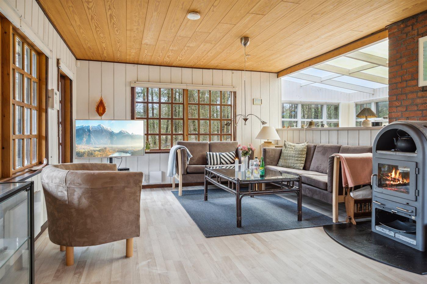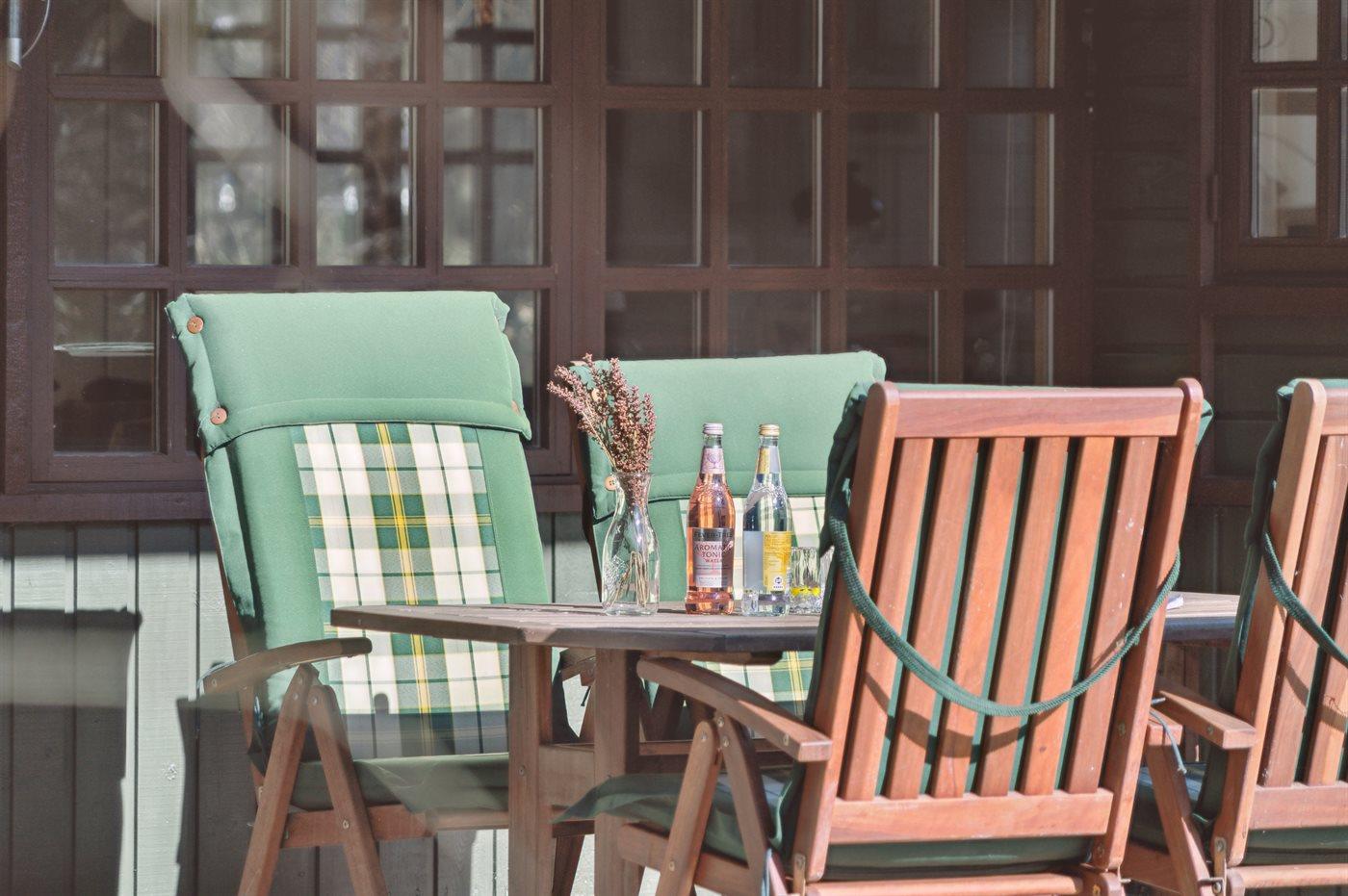 Das Ferienhaus liegt auf einem von Bäumen umgebenen Grundstück, sodass Sie sich ungestört im Garten aufhalten und die Ruhe genießen können. Es gibt sowohl eine offene als auch eine überdachte Terrasse, auf denen Sie Ihren Urlaub ganz unabhängig vom Wetter genießen können.
