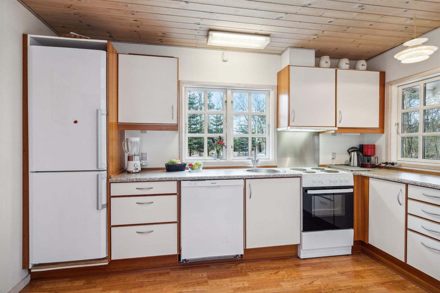 Die Küche ist mit Kühlschrank ausgestattet. Außerdem gibt es 4 Keramik-Kochfelder, Umluftofen sowie Geschirrspüler.