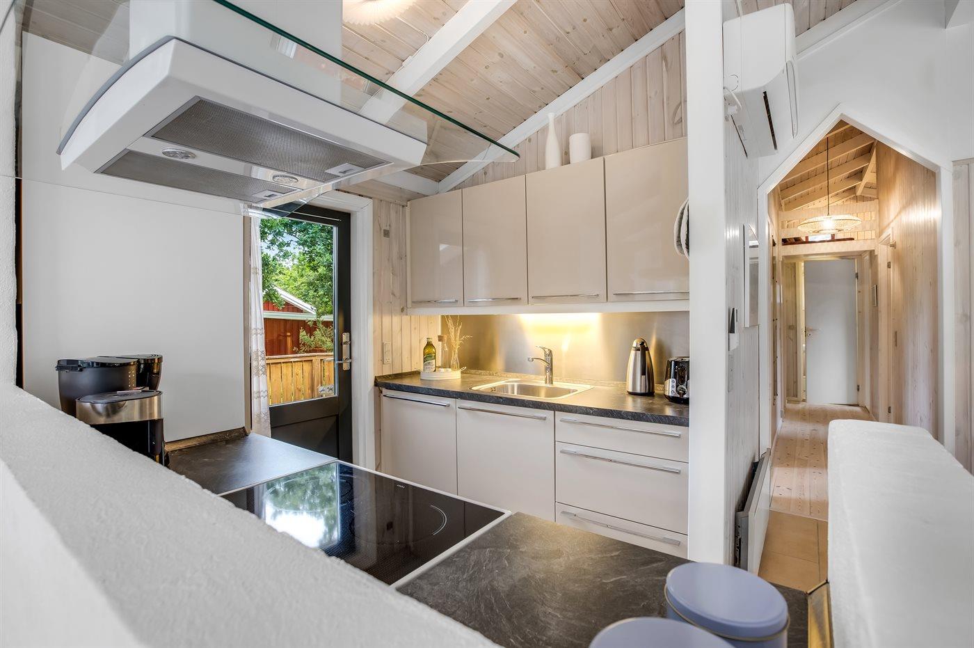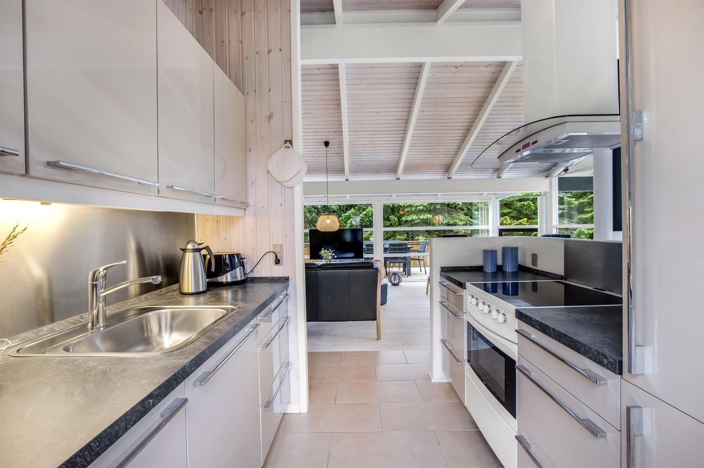 Die Küche ist mit Kühlschrank ausgestattet. Außerdem gibt es 4 Keramik-Kochfelder, Umluftofen, Mikrowelle sowie Geschirrspüler. Fußbodenheizung in der Küche.