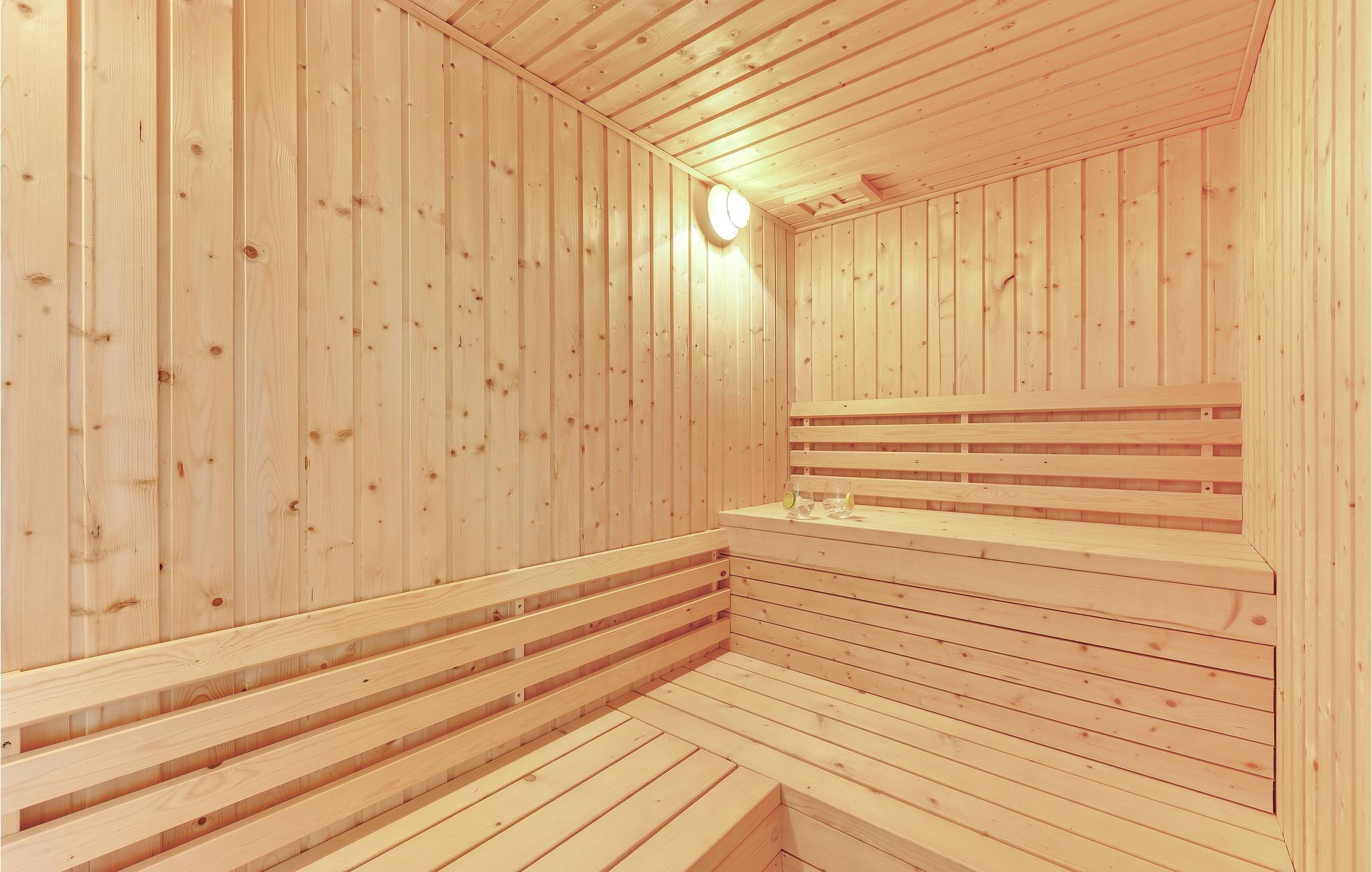 Es gibt drei Schlafzimmer und ein großes Badezimmer mit Sauna und Whirlpool.