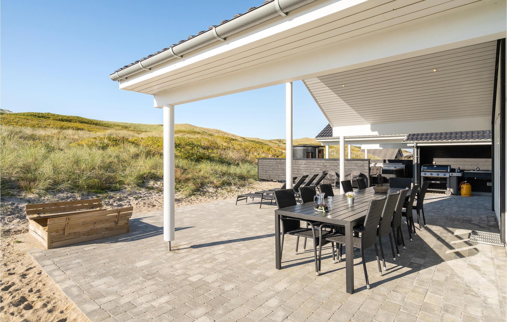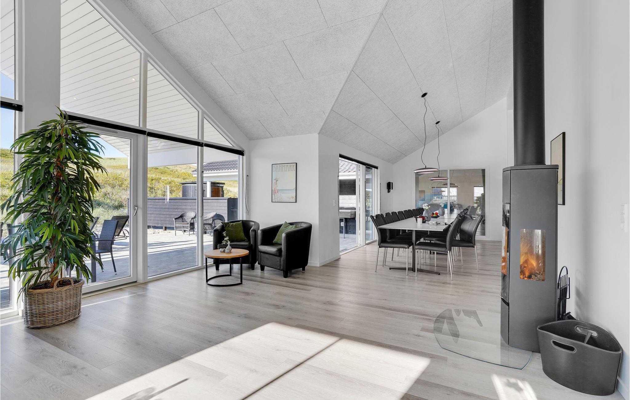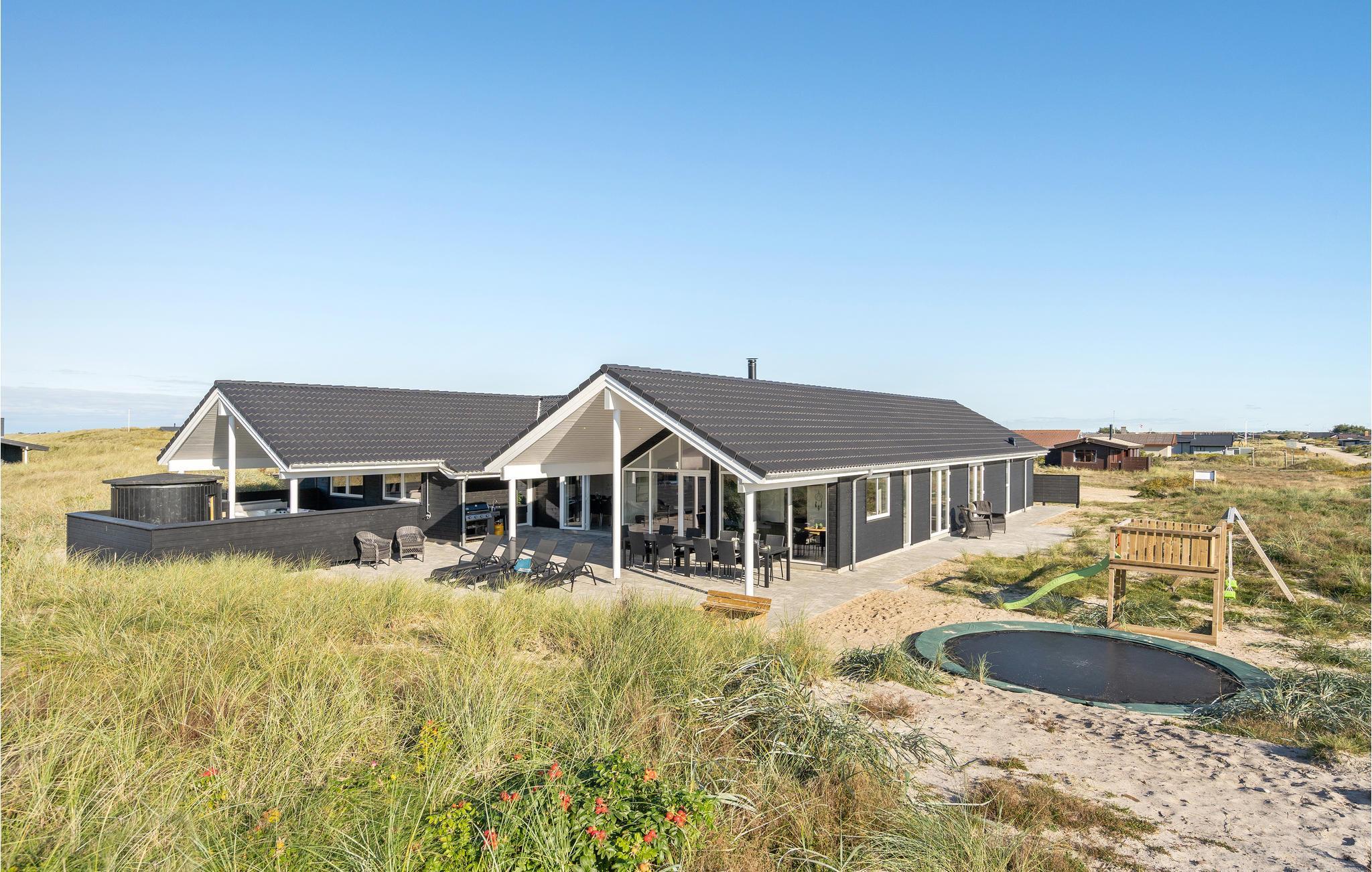 In Bjerregård, auf der Landzunge Holmsland Klit zwischen dem Ringkøbing-Fjord und der Nordsee, erwartet Sie dieses luxuriöse Ferienhaus im äußersten Dünenbereich, nur 50 m vom Wasser entfernt. Hier ist viel Platz für Familie und Freunde in der schönen Umgebung und der atemberaubenden Landschaft. Sie wohnen so nah an der Nordsee, dass Sie das Rauschen der Wellen hören und die Salzluft schmecken können. Die Nordsee ist das ganze Jahr über ein tolles Erlebnis. Das Haus verfügt über einen eigenen Pool- und Wellnessbereich mit Swimmingpool, Wasserrutsche und Gegenstromanlage. Sie können auch die Dampfsauna oder den großen Whirlpool für 6 Personen nutzen.