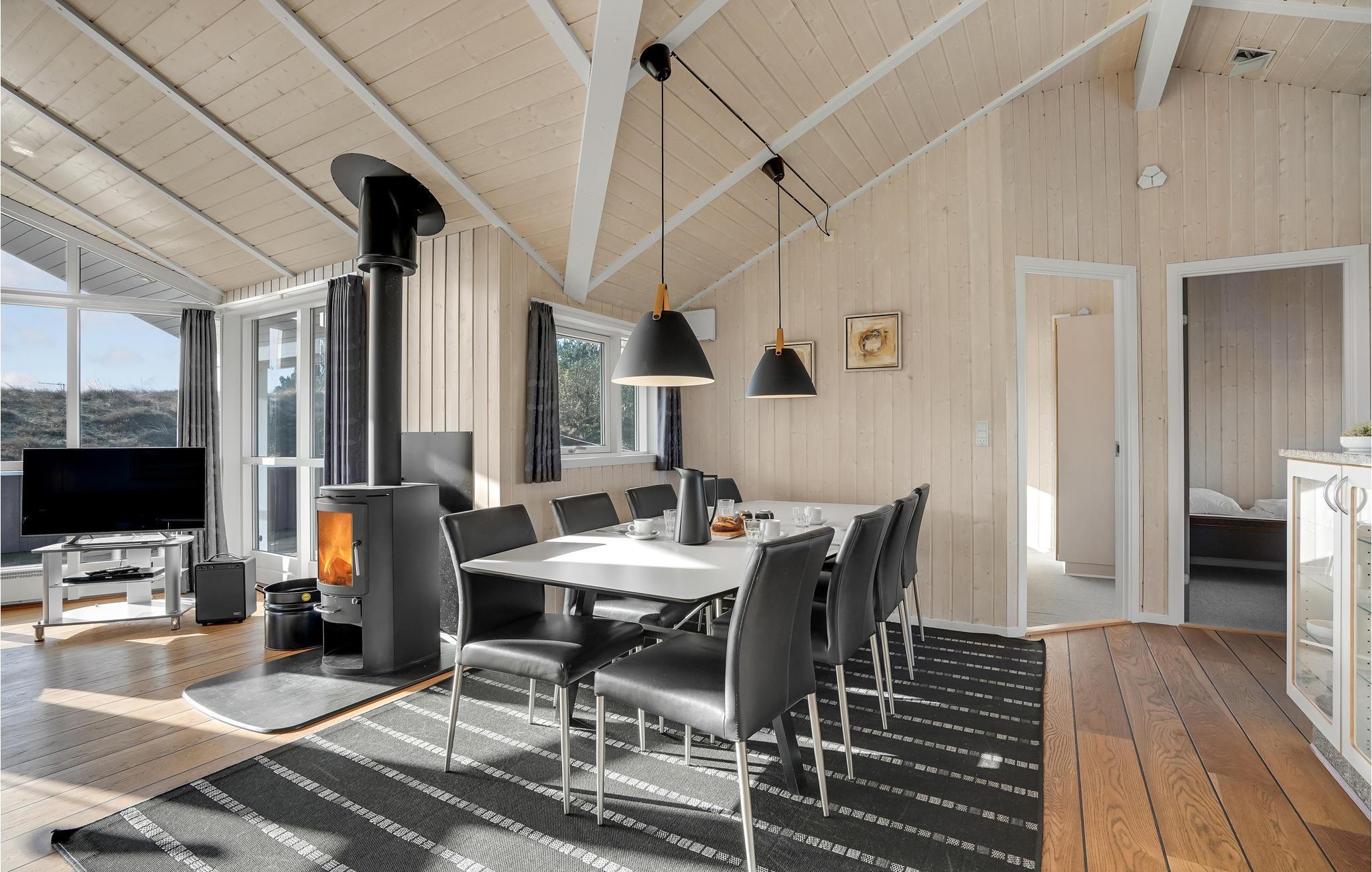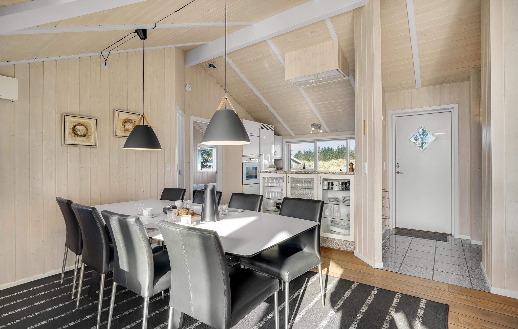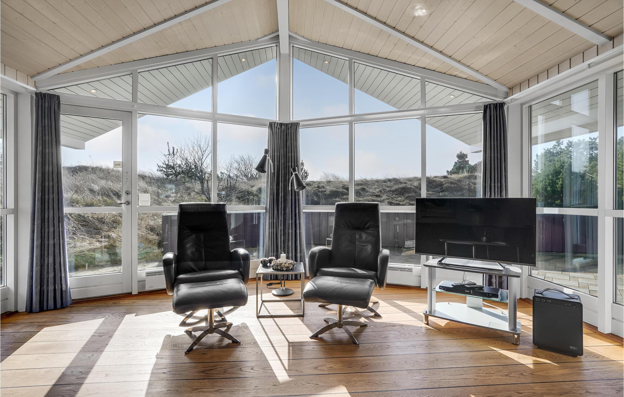 Schönes Ferienhaus auf welligem Dünengrundstück im reizvollen Bjerregård, auf dem Landstrich zwischen Meer und Fjord. Die Einrichtung ist interessant und charmant, viel Wert wird hier auf Qualität gelegt. Im geräumigen Wohnzimmer gibt es eine große Fensterfront, sie sorgt dafür, dass viel Licht ins Innere kommt und Sie sich in unmittelbarer Nähe zur Natur fühlen, dieser Raum ist zur gut ausgestatteten Küche offen.