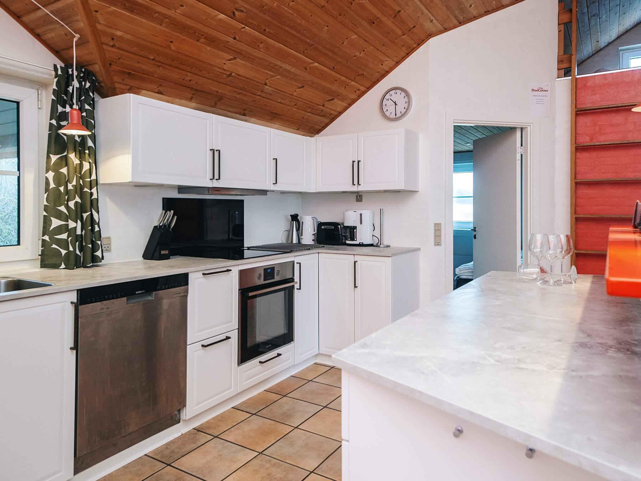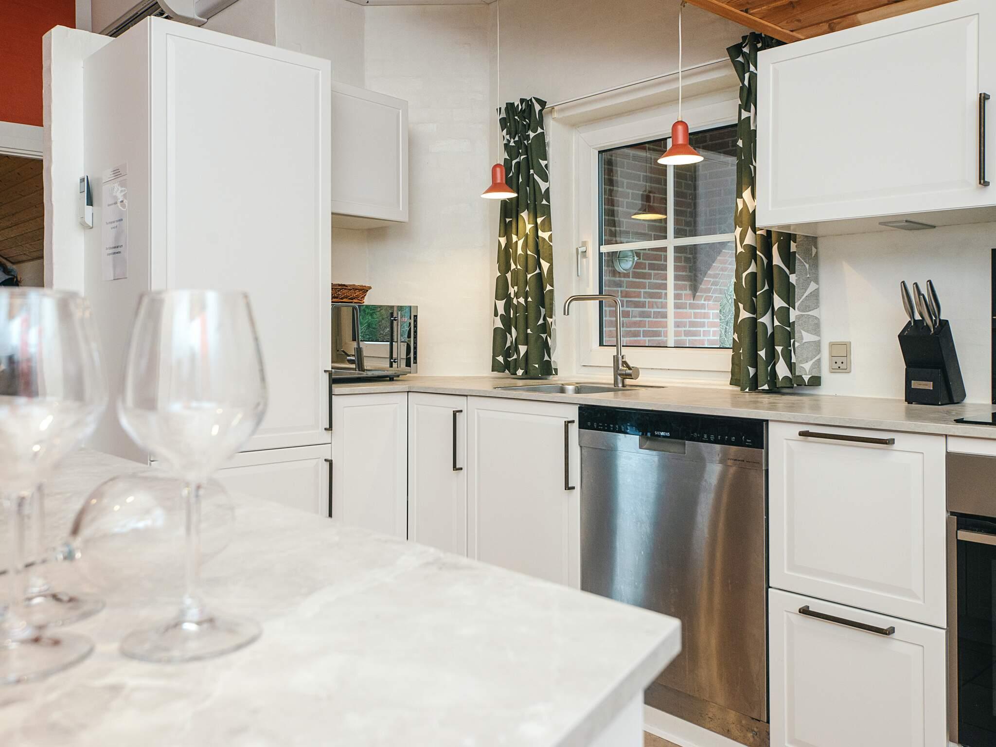 Im Haus gibt es u.a. zwei schöne Bäder mit Dusche sowie vier Schlafzimmer und einen Hems oben unter der Dachschräge. Bis auf die Schlafzimmer sind alle Böden im Haus gefliest. Das eine Bad ist mit einem Whirlpool für max. sechs Personen ausgestattet. Alle Zimmer sind hell und freundlich, das Wohnzimmer zudem besonders gemütlich eingerichtet. Es liegt im offenen Anschluss an den Küchen-/Essbereich, nur abgetrennt durch ein paar Stufen. Selbstverständlich ist die große Küche umfassend ausgestattet für die Selbstverpflegung. Da der Raum offen ist, können hier alle gleichzeitig an den Gesprächen und dem Familienleben teilnehmen.