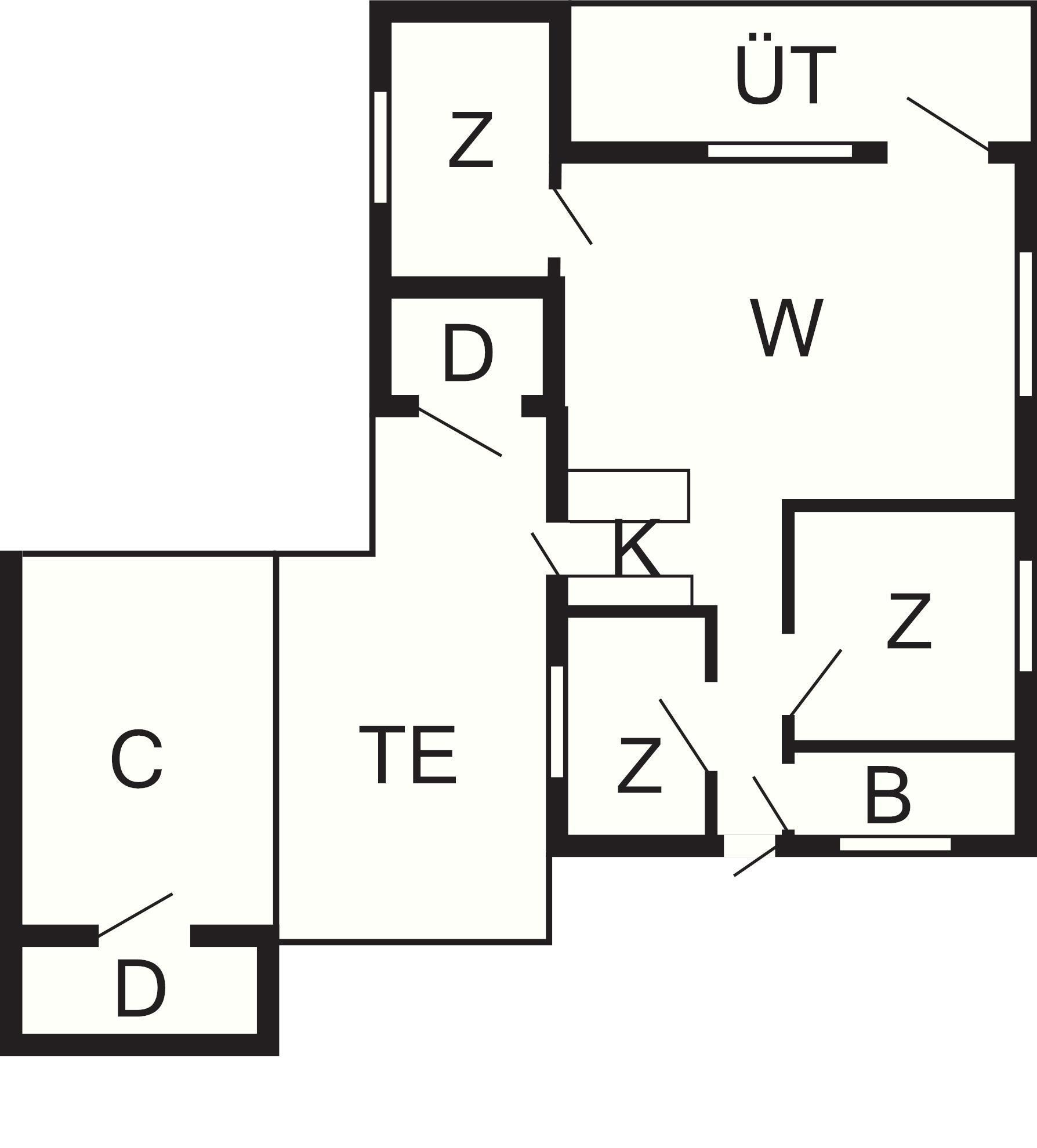Off. Küche: E-Herd, Kühlschr. m. Gefrierfach, Abzugsh., Kaffeem.