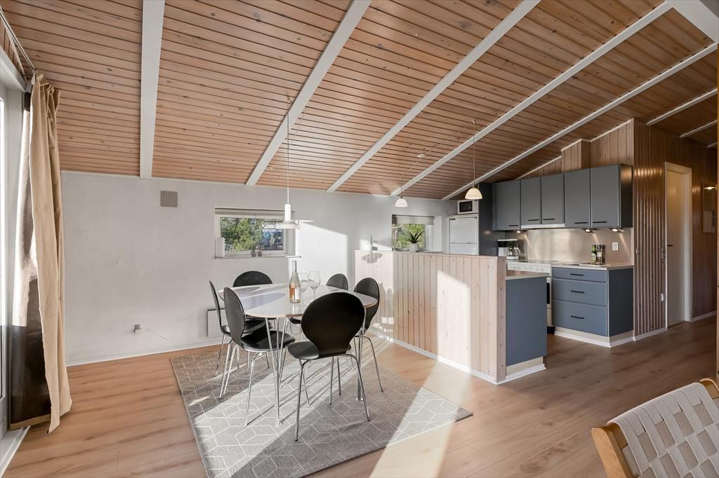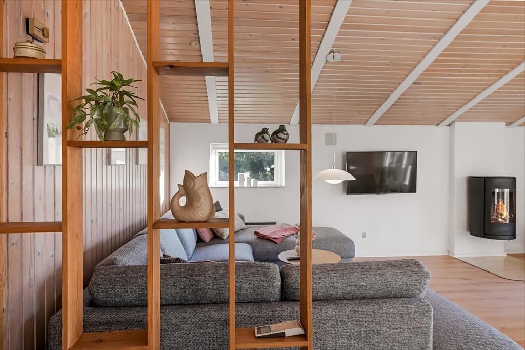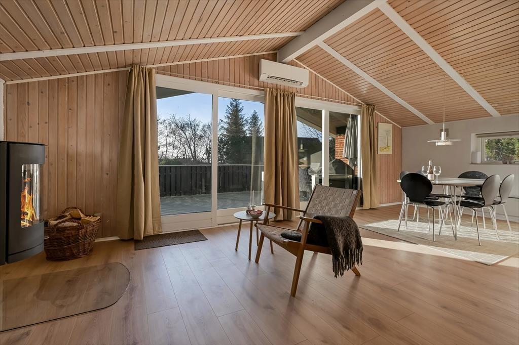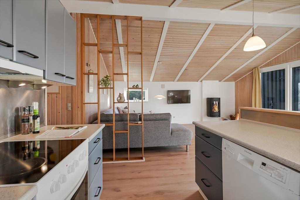 Der gemütliche Wohnbereich bietet ausreichend Platz für alle mitreisenden Urlaubsgäste. Er empfängt Sie mit einer guten Einrichtung mit einem Esstisch, einer Sofaecke und einem Kamin. Vom Wohnbereich gelangen Sie zudem direkt auf die Südterrasse des Hauses. Dank der offenen Verbindung mit dem Wohnraum haben Sie während der Erledigung Ihrer alltäglichen Aufgaben in der Küche jederzeit die Möglichkeit, allen Aktivitäten im Wohnraum beizuwohnen. Im schönen, hellen Badezimmer erwarten Sie eine Dusche und eine Sauna. Ihnen stehen zwei Schlafräume mit jeweils einem Doppelbett und ein Schlafraum mit einem Etagenbett zur Verfügung. Es ist möglich, Ihr eigenes Autoladegerät an das Haus anzuschließen.