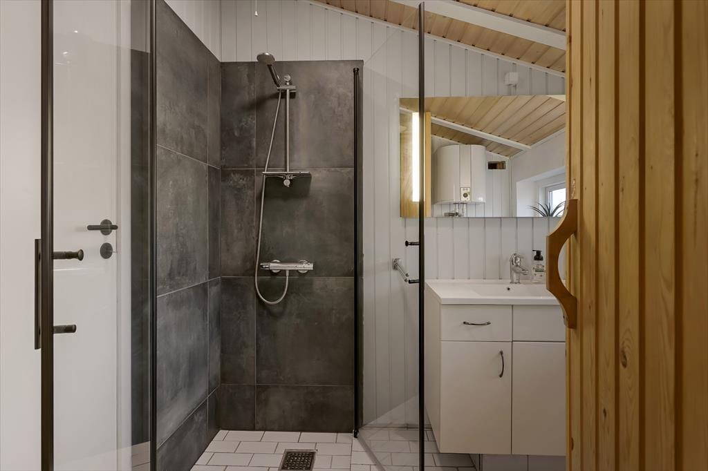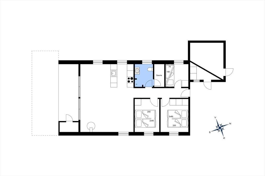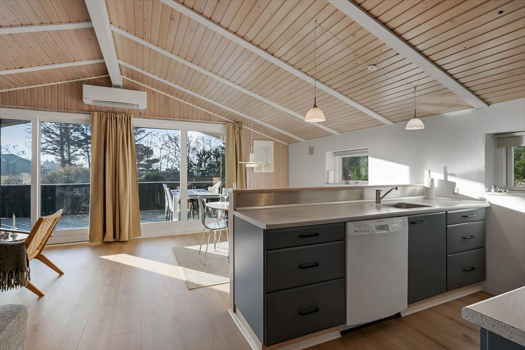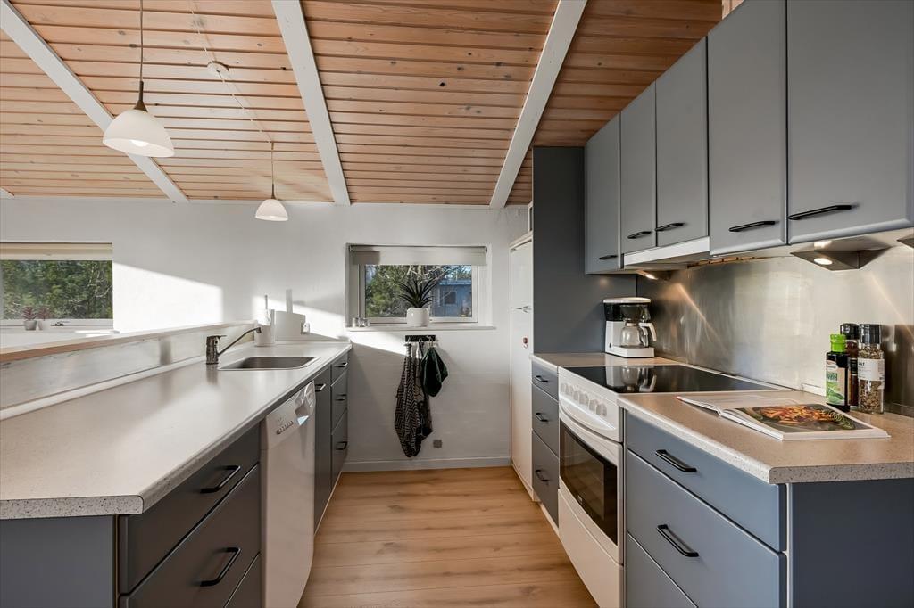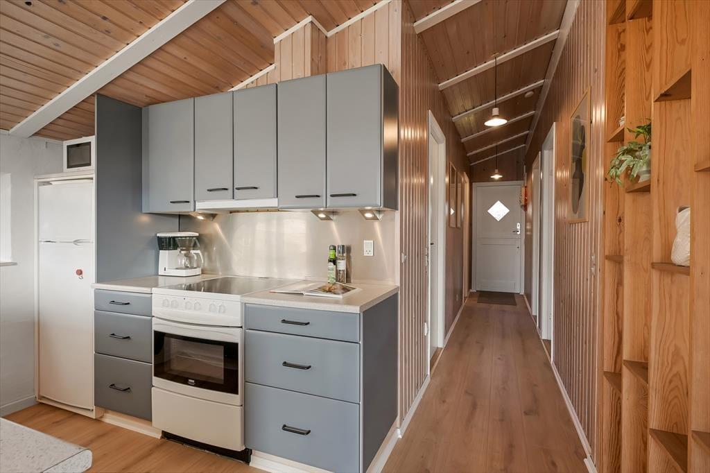 Der gemütliche Wohnbereich bietet ausreichend Platz für alle mitreisenden Urlaubsgäste. Er empfängt Sie mit einer guten Einrichtung mit einem Esstisch, einer Sofaecke und einem Kamin. Vom Wohnbereich gelangen Sie zudem direkt auf die Südterrasse des Hauses. Dank der offenen Verbindung mit dem Wohnraum haben Sie während der Erledigung Ihrer alltäglichen Aufgaben in der Küche jederzeit die Möglichkeit, allen Aktivitäten im Wohnraum beizuwohnen. Im schönen, hellen Badezimmer erwarten Sie eine Dusche und eine Sauna. Ihnen stehen zwei Schlafräume mit jeweils einem Doppelbett und ein Schlafraum mit einem Etagenbett zur Verfügung. Es ist möglich, Ihr eigenes Autoladegerät an das Haus anzuschließen.