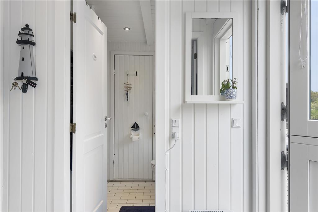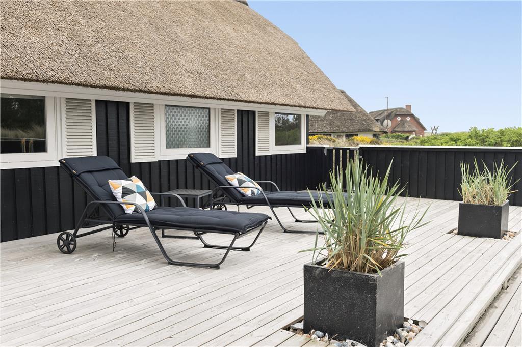 Das Grundstück liegt schön ungestört und die sehr große, eingezäunte Holzterrasse ist ein wunderbarer Rückzugsort. Auf der Terrasse gibt es mehrere gute windgeschützte Ecken, in denen Sie die Sonne entweder im Liegestuhl oder in den Gartenmöbeln genießen können. Außerdem sind die großen Blumentöpfe und Krüge mit Pflanzen aus der Heidelandschaft und vom Strand dekoriert. Auf der Terrasse lassen sich das Wetter und die Sonne vom Aufgang bis Untergang verfolgen. Das Haus steht so nah am Wasser, dass Sie das Meeresrauschen hören können, während Sie im Windschutz auf der Terrasse sitzen.