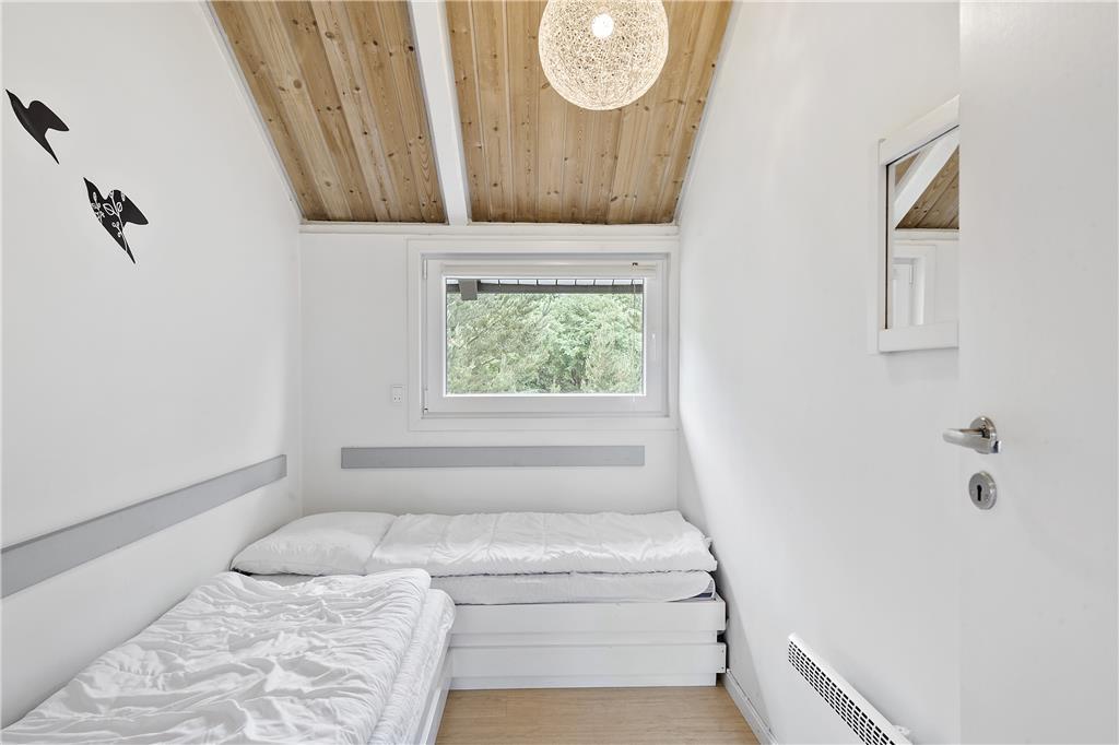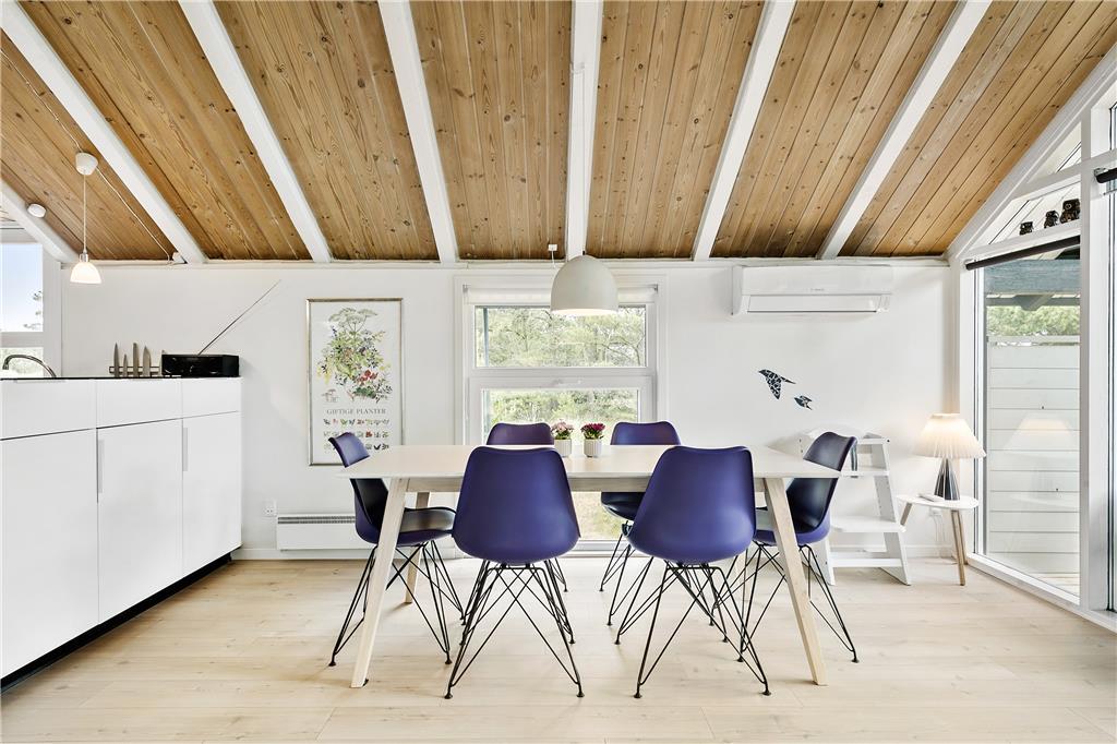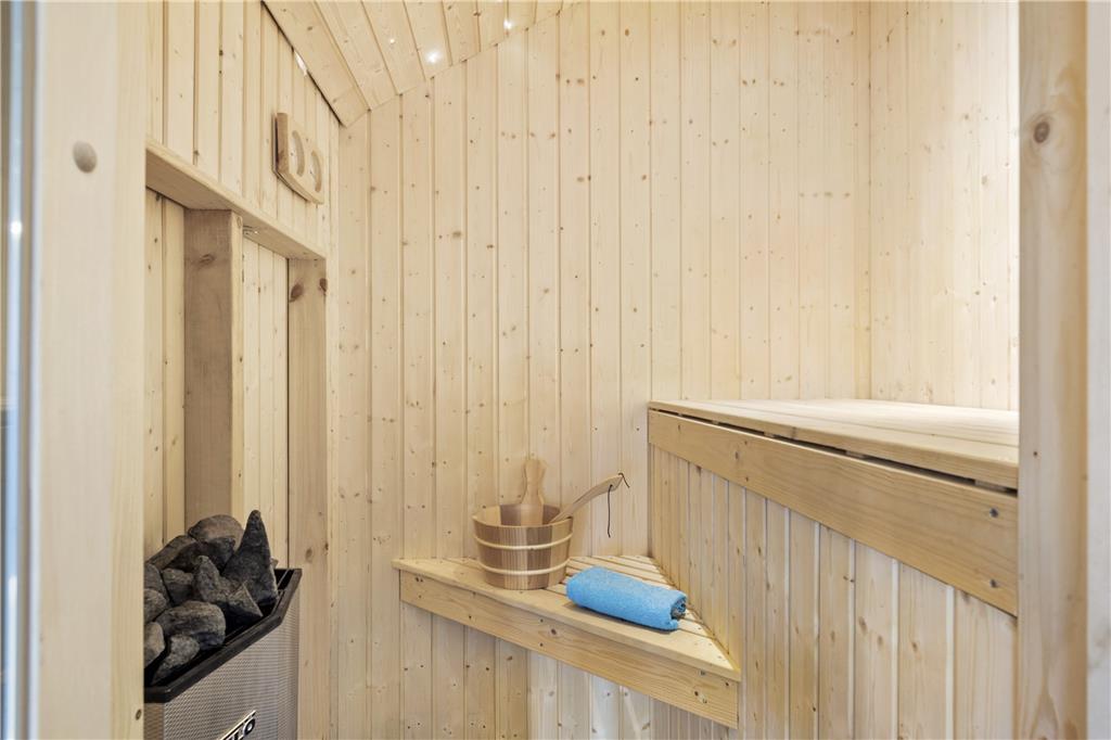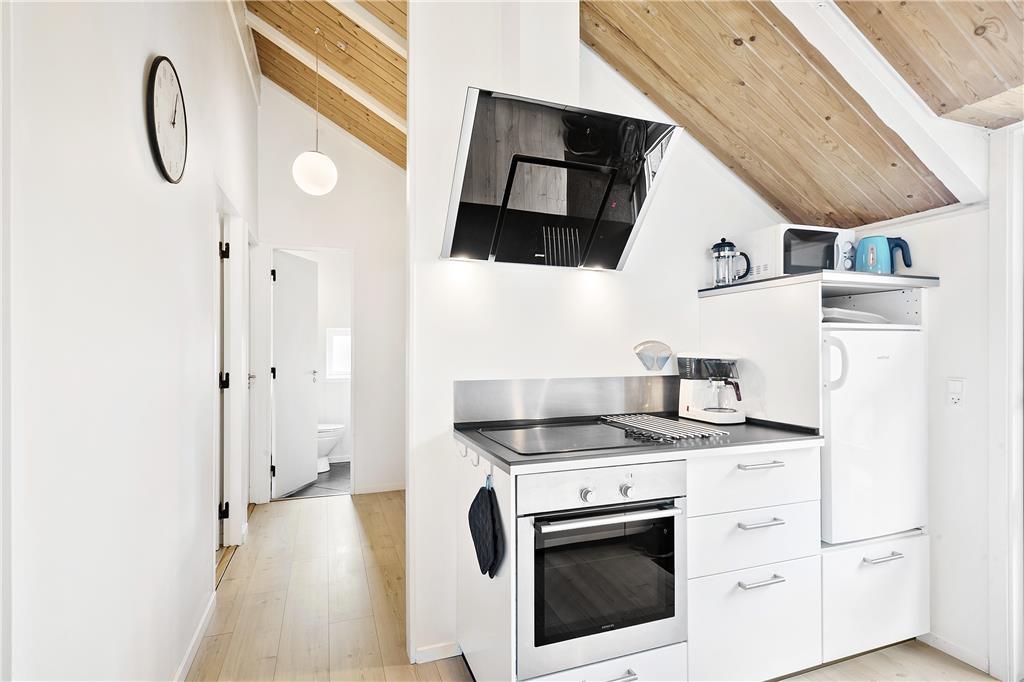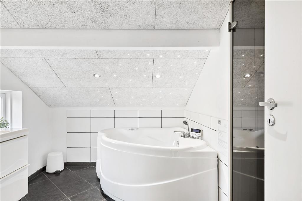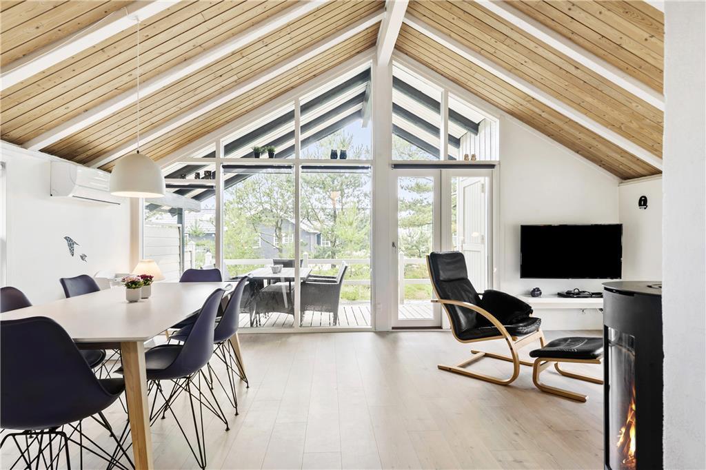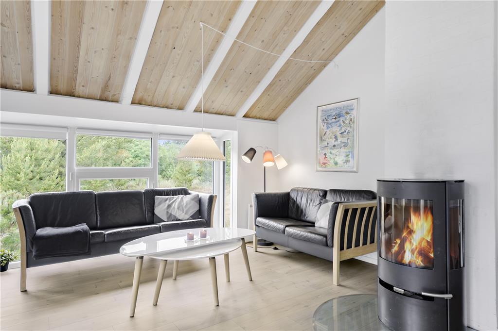 Ein außerordentlich gemütliches Ferienhaus für sechs Personen. Schöner Küchenbereich und Wohnzimmer mit Kamin. Wohnzimmer und Küche in hellen Farben und eingerichtet mit eleganten Möbeln im skandinavischen Stil. Durch die große Fensterfront können Sie auf dem großen Naturgrund das Tierleben beobachten. Zwei Schlafzimmer mit jeweils einem Doppelbett und ein Schlafzimmer mit zwei Einzelbetten (ein ist 1,70 m lang). Während Sie im Whirlpool liegen, können Sie in dem neuen Badezimmer in dem am Deckenhimmel installierten Sternenhimmel blicken.