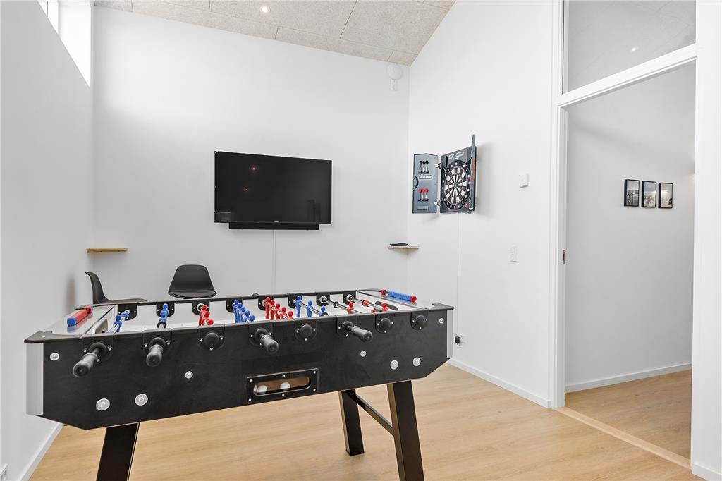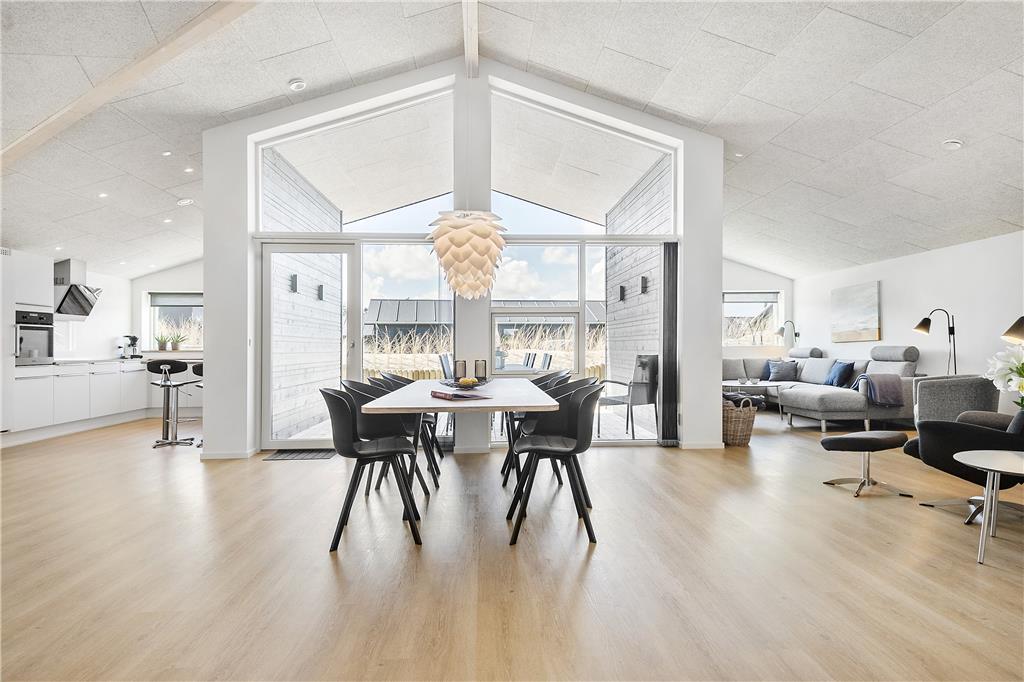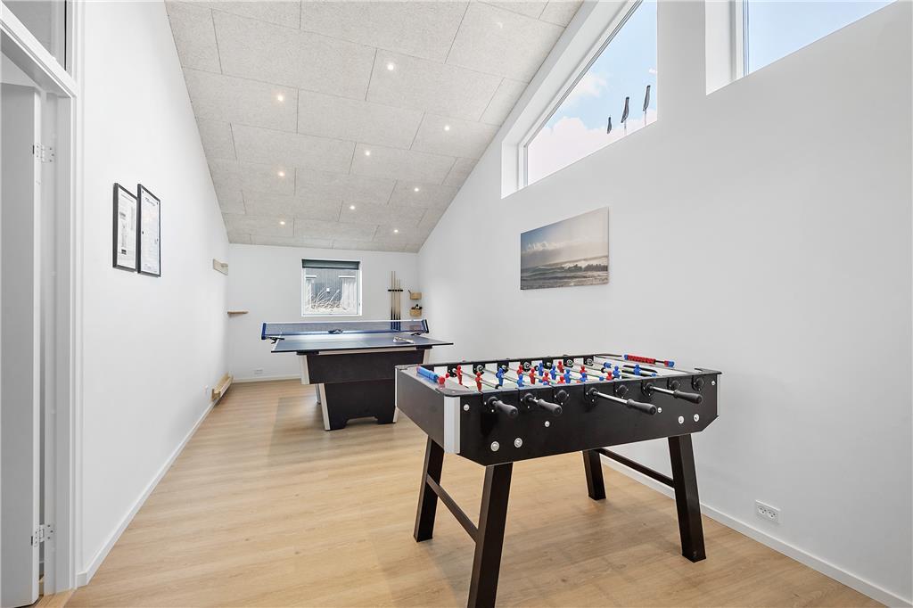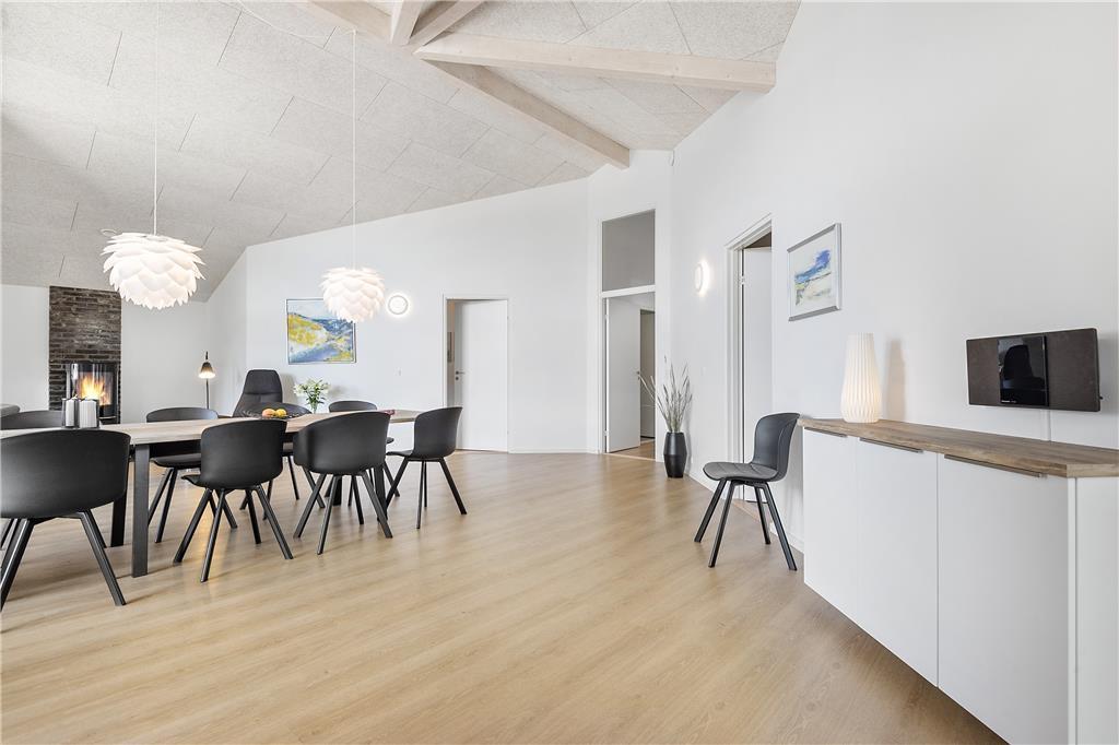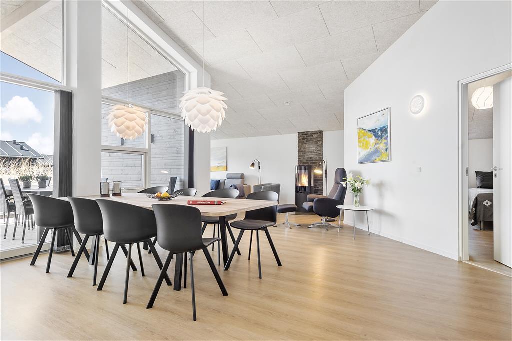 Das 217 m² große Ferienhaus aus dem Jahr 2018 verwöhnt nach allen Regeln der Kunst. Freuen Sie sich also unter anderem auf große, helle Räumlichkeiten, geräuschdämpfende Decken, eine Fußbodenheizung und eine Genvex-Lüftungsanlage. All diese Dinge tragen maßgeblich zur wunderbar behaglichen Wohnatmosphäre bei. Die bereits erwähnte Erdwärmenutzung und die Ganzjahresisolierung machen sich außerdem in einem geringen Energieverbrauch bemerkbar - selbst wenn Sie Ihren Urlaub im Winterhalbjahr verbringen. An kühlen Tagen wird es Sie garantiert unwiderstehlich in das größere der beiden Badezimmer ziehen. Hier locken ein Whirlpool und eine Sauna, die zu traumhaft entspannten Momenten voller Wellnessflair einladen. Zur Wohnfläche zählen darüber hinaus auch vier Schlafzimmer und ein Aktivitätsraum, in dem eine Tischtennisplatte, ein Billardtisch, eine elektronische Dartscheibe und ein großer Fernseher für viel Unterhaltung und Abwechslung sorgen. Das Herzstück des Urlaubsdomizils bildet allerdings der Wohnraum, bei dem es sich um einen großen, richtig schönen und überaus stilvollen Aufenthaltsraum mit einer offenen Küche, einem Kaminofen, einem Esstisch und einer komfortablen Sofagruppe handelt.