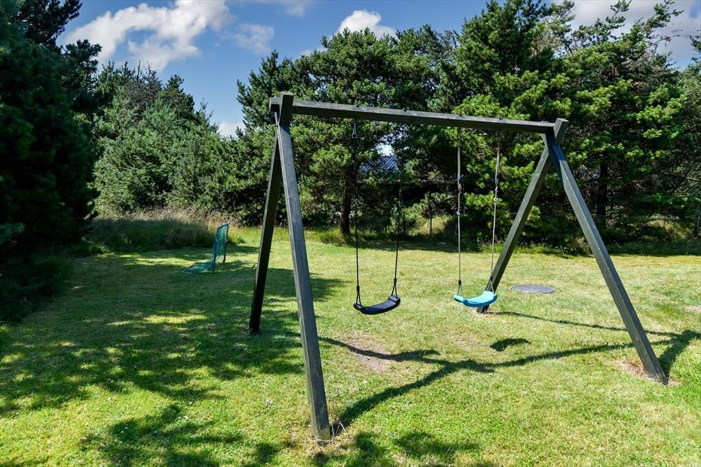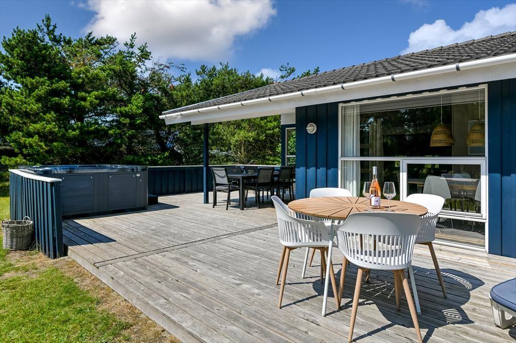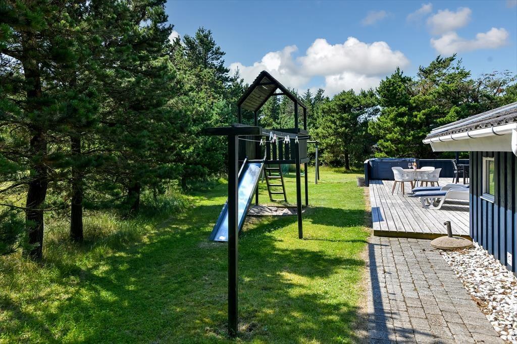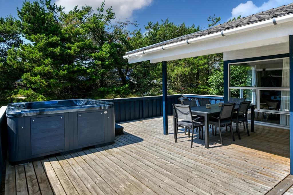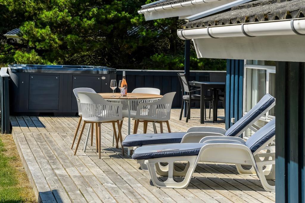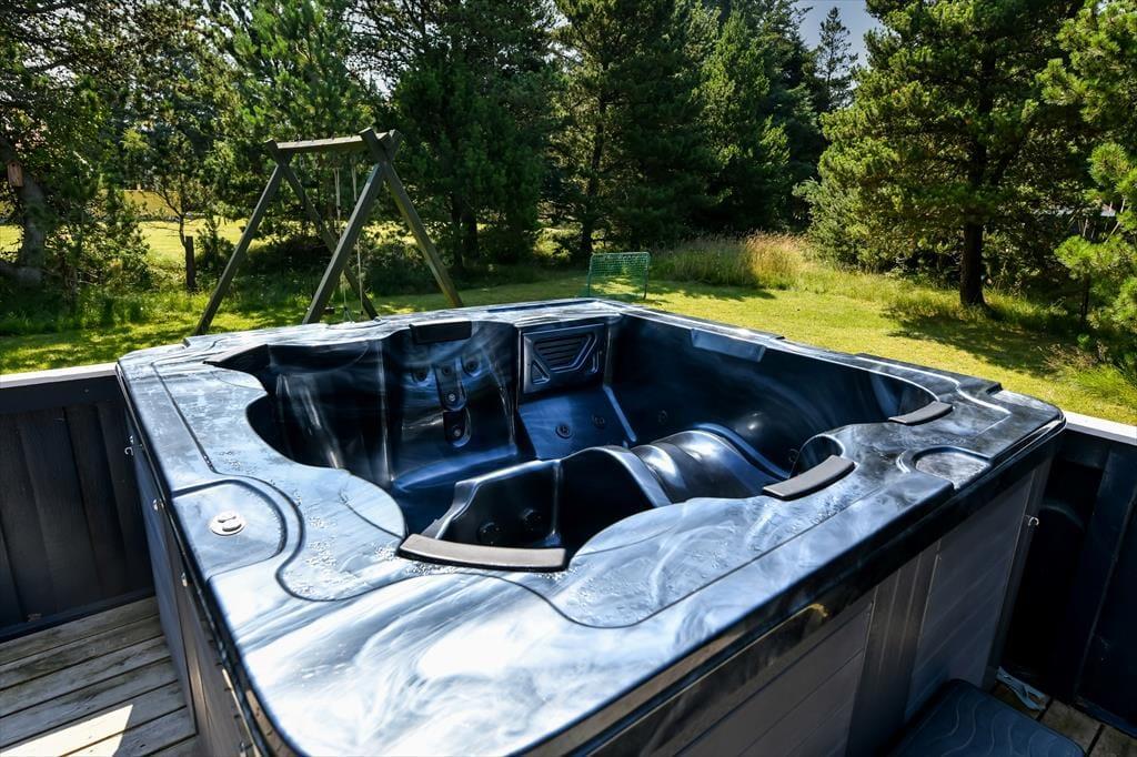 Das Leben im Freien lässt sich ebenfalls wunderbar auf der großen Holzterrasse des Ferienhauses genießen. Hier könnt ihr euch sonnen oder eine Siesta unter dem Sonnenschirm machen, und am Abend könnt ihr es euch mit Grill und leckeren Mahlzeiten auf dem überdachten Teil der Terrasse gemütlich machen – vielleicht während die Kinder vor dem Schlafengehen auf dem Naturgrundstück, das mit Schaukel, Spielturm, Sandkasten und Fußballtor ausgestattet ist, noch zu Ende spielen. Ein perfekter Abschluss des Tages ist ein Bad im Außenspa, denn es gibt kaum etwas Schöneres, als sich in warmem Wasser zurückzulehnen und dabei den freien Blick in den Sternenhimmel zu genießen.