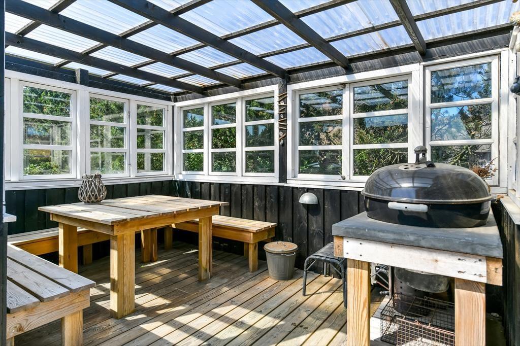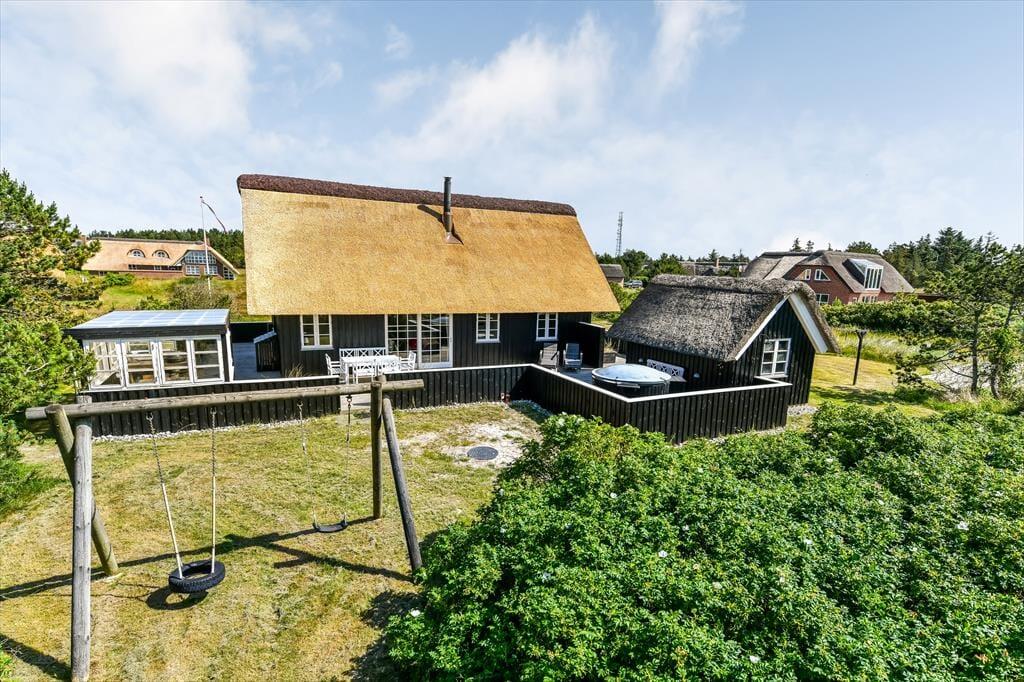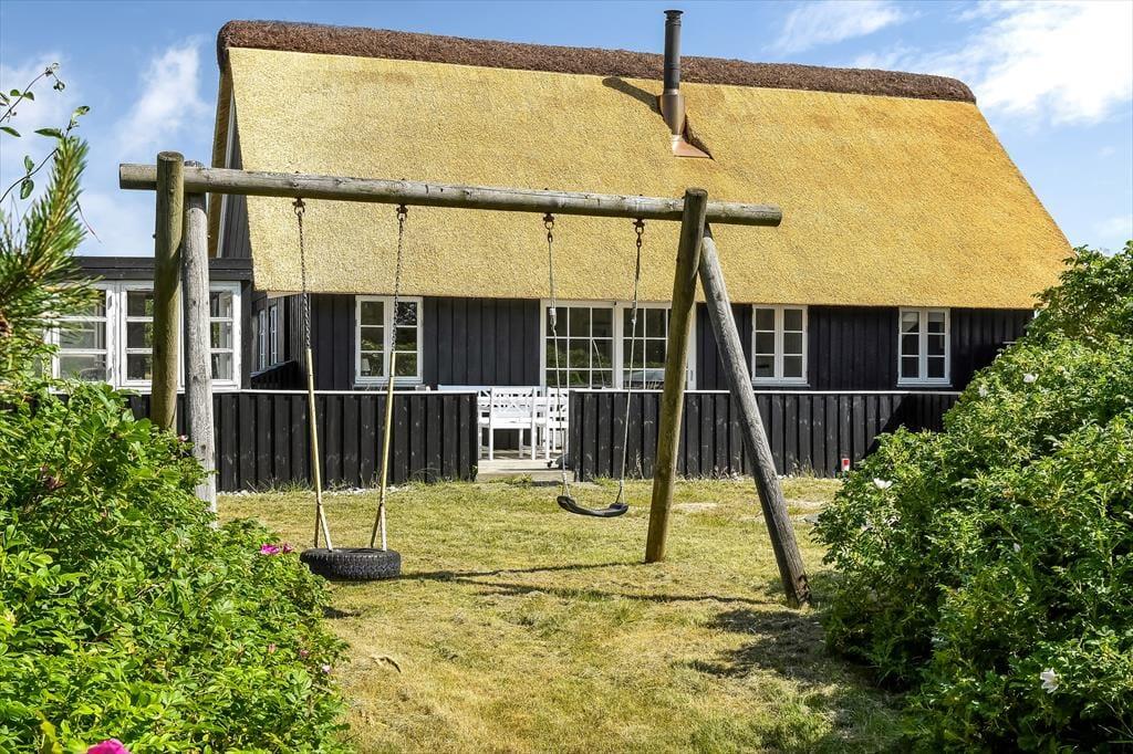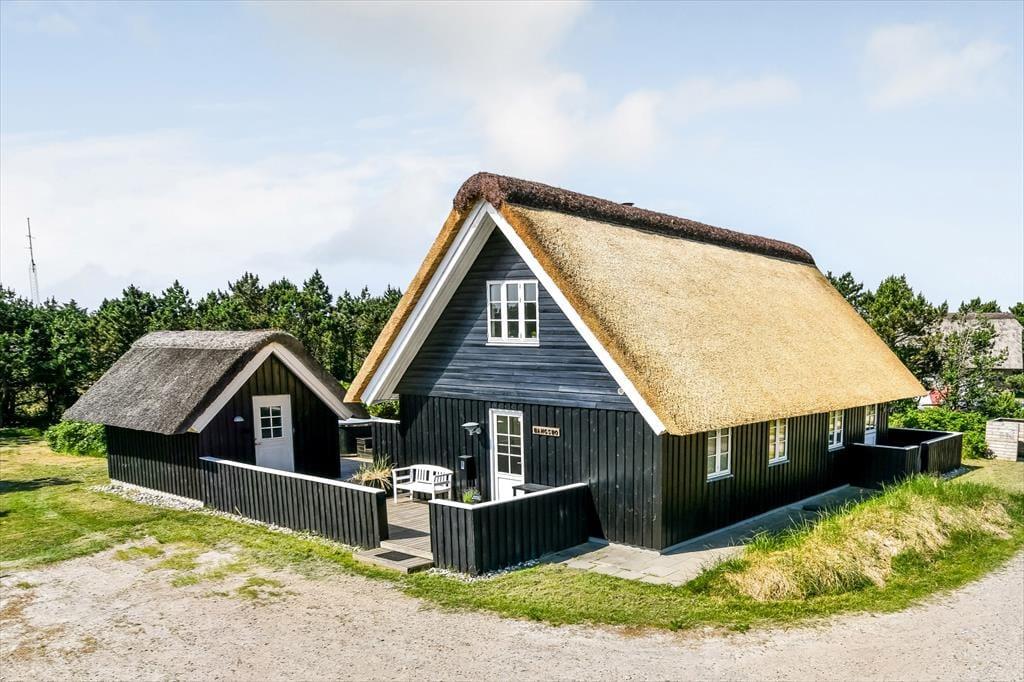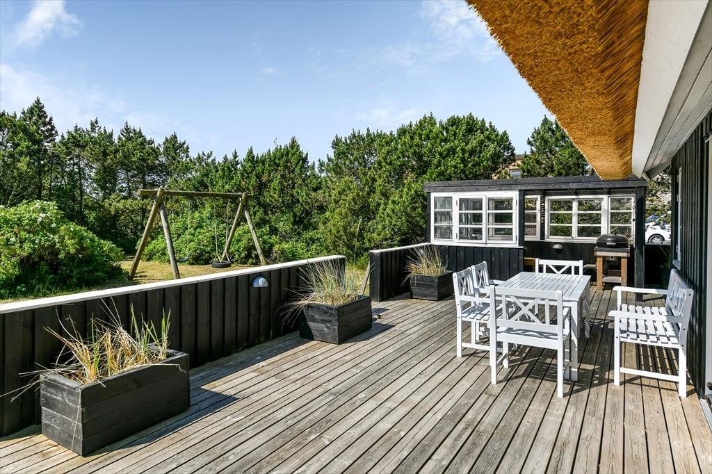 Die Holzterrasse dieses Reetdachhauses ist ein wunderbares Fleckchen, um die Sonne und den dänischen Sommer in vollen Zügen zu genießen. Die Terrasse schmiegt sich rund um das gesamte Haus, sodass Sie zu jeder Tageszeit problemlos ein sonniges Plätzchen finden werden. Der ebenfalls vorhandene überdachte Terrassenbereich ist zu zwei Seiten hin abgeschirmt und eignet sich somit ganz hervorragend für gesellige Abende mit einem köstlichen Essen vom Grill. Auf dem schlicht angelegten Grundstück dürfen sich Ihre Kinder auf eine Schaukel freuen. Die abgeschirmte Außendusche spült Ihnen nach einem langen Tag am Strand den Sand und das Salz von der Haut. Bitte beachten Sie, dass das Wildnisbad auf der Terrasse nicht ein Bestandteil des Mietvertrages ist.