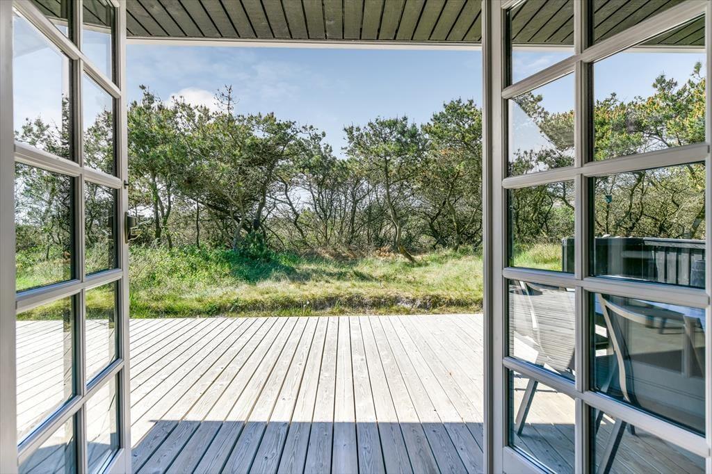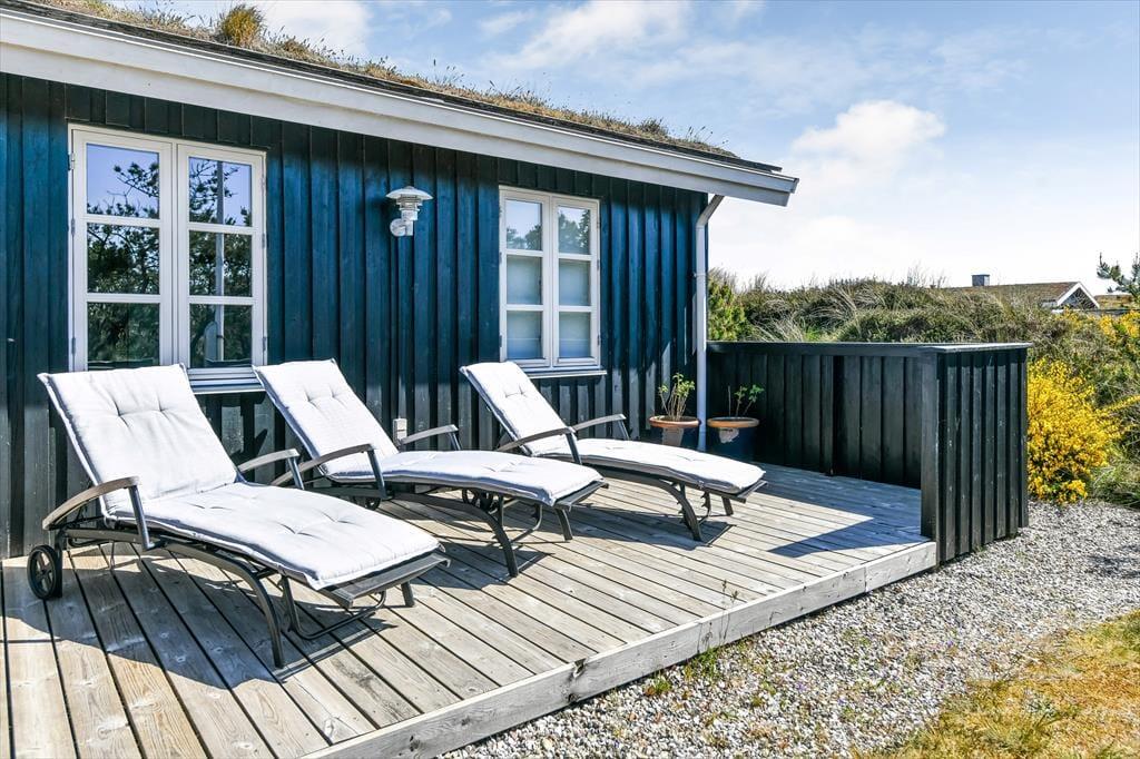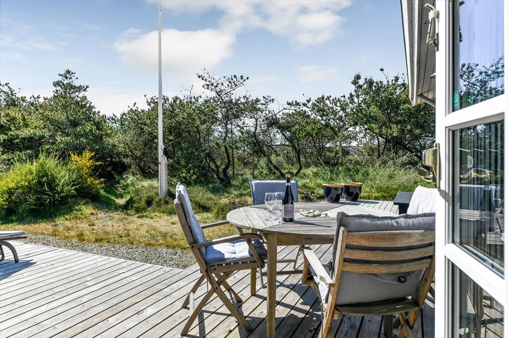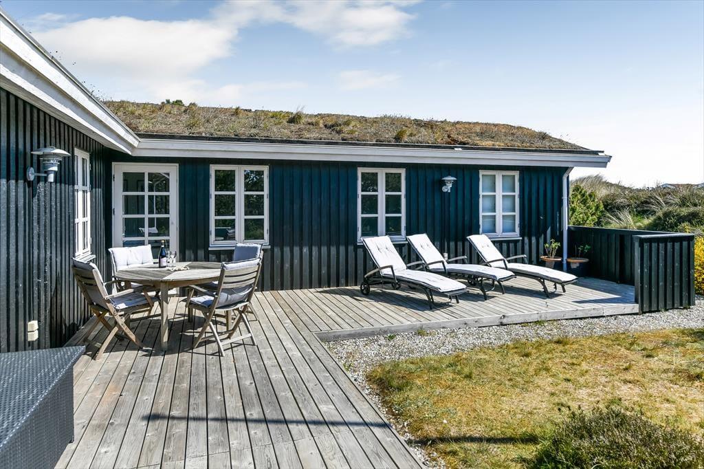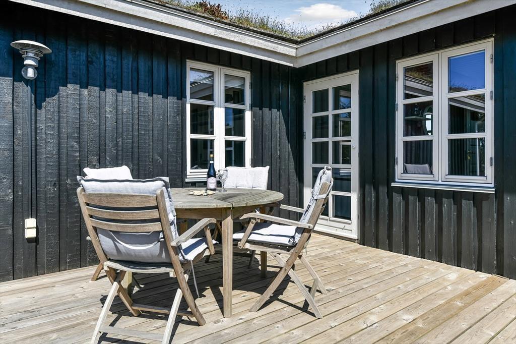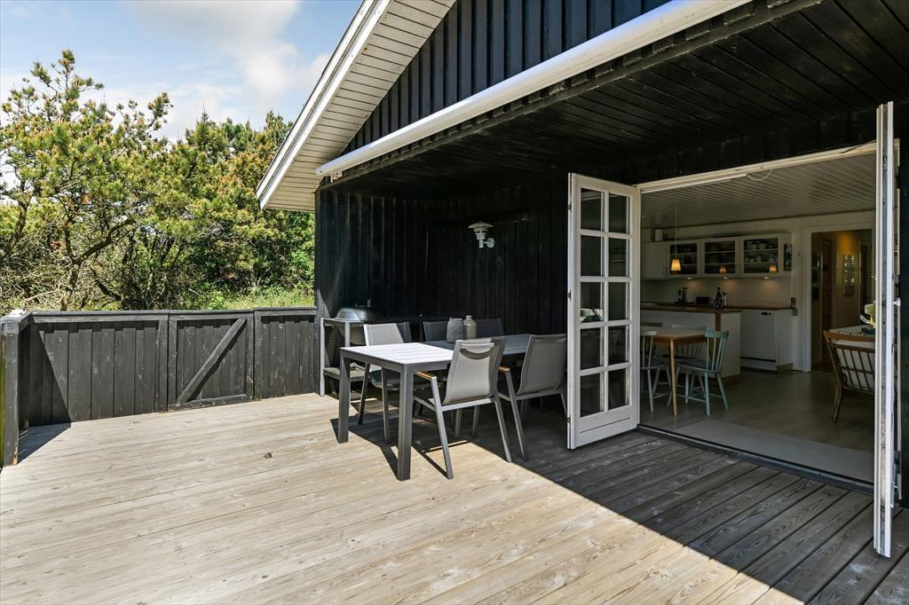 Vom Wohnzimmer gelangen Sie direkt hinaus auf die Terrasse, die an warmen Sommertagen eine natürliche Erweiterung der Wohnfläche darstellt. Die Terrasse schmiegt sich gen Süden und Osten an die Holzfassade des Hauses. Dadurch bieten sich Ihnen sehr gute Möglichkeiten, ganz nach persönlicher Vorliebe, ein sonniges oder auch schattiges Plätzchen unter freiem Himmel zu finden. Die friedvolle Umgebung ringsum ermöglicht es Ihnen zudem, sich in aller Ruhe im Freien niederzulassen, die Sonne zu genießen oder auch ein spannendes Buch zu lesen. Selbstverständlich können Sie auch sehr schön Ihre Urlaubsmahlzeiten auf der Terrasse einnehmen. Allabendlich, wenn die Sonne langsam hinter den Dünen versinkt, bietet sich der überdachte Terrassenbereich als herrlicher Rückzugort an, an dem Sie den Tag in geselliger Runde ausklingen lassen können.