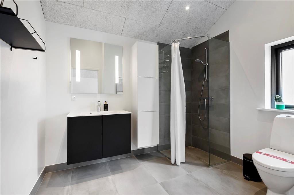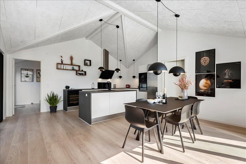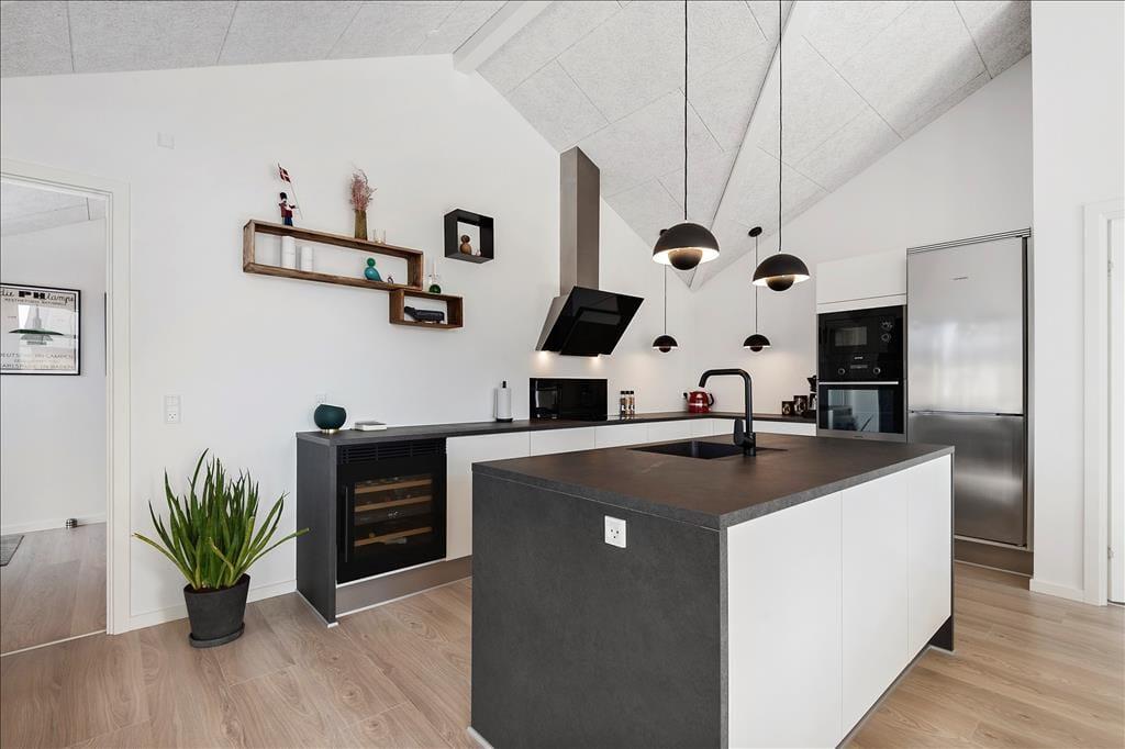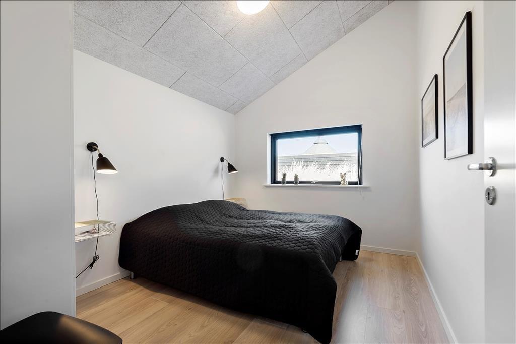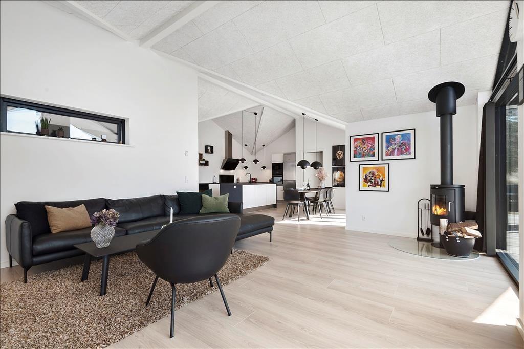 Dank einer Wohnfläche von 124 m² bietet sich Ihnen in diesem attraktiven Ferienhaus angenehm viel Bewegungsfreiheit. Mit insgesamt drei Schlafräumen und zwei Badezimmern ist dieses Mietobjekt für den gemeinsamen Urlaub von bis zu sechs Personen ausgelegt. Alle Räume bestechen mit hohen Decken und schönen Fußböden. Das moderne Interieur ist in schlichter, eleganter Weise primär in schwarzen und weißen Nuancen gehalten. Der elegante Einrichtungsstil prägt selbstverständlich auch den großen Aufenthaltsraum mit hoher Decke und großzügigem Tageslichteinfall. Urlauber, die gerne kochen, können sich in der modernen, offenen Küchenabteilung frei entfalten. Es erwarten Sie neben wunderbar viel Arbeitsfläche auch gute, moderne Küchengroßgeräte. Nach einer köstlichen Mahlzeit, die Sie in geselliger Runde am Esstisch genossen haben, machen Sie es sich am besten in der wunderschönen Sofaabteilung nahe des behaglich knisternden Kaminofens gemütlich. Das Haus bietet auch eine gute Internetverbindung 500/500.