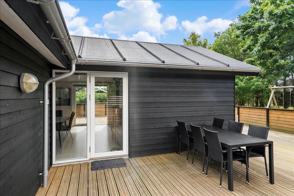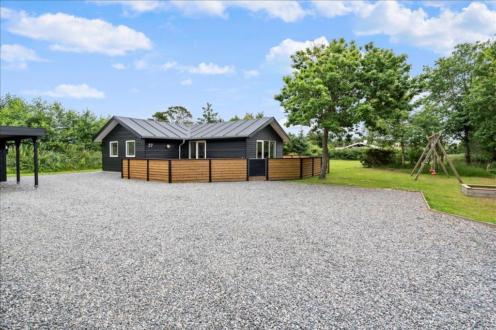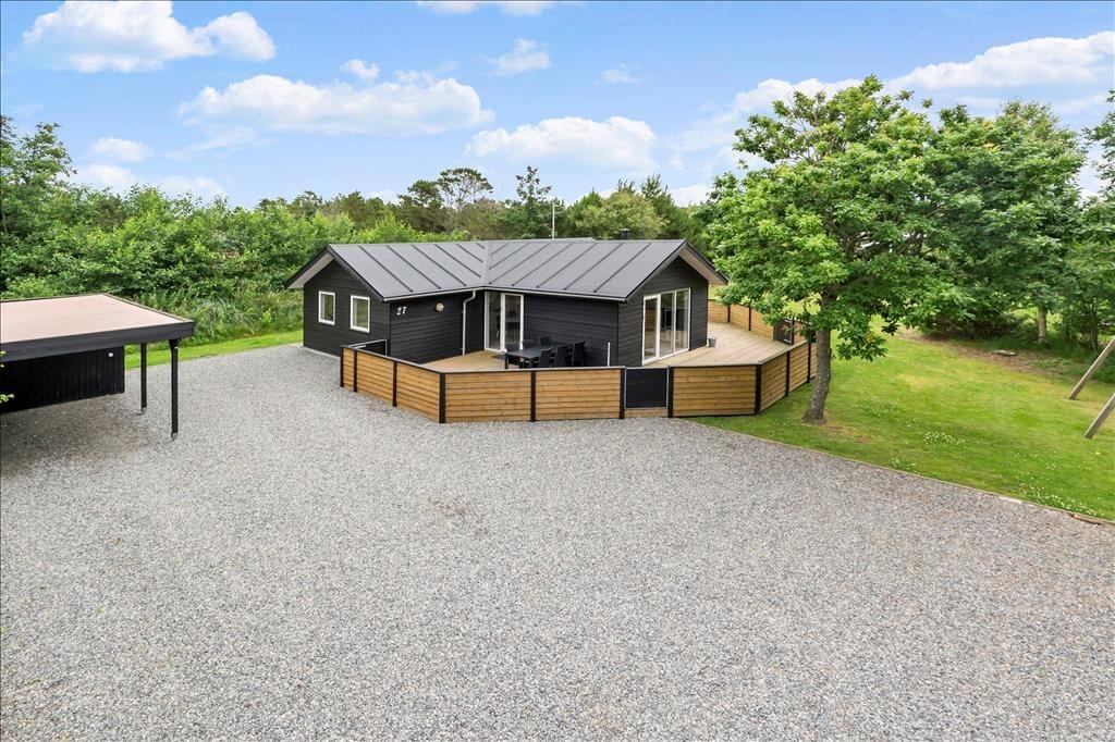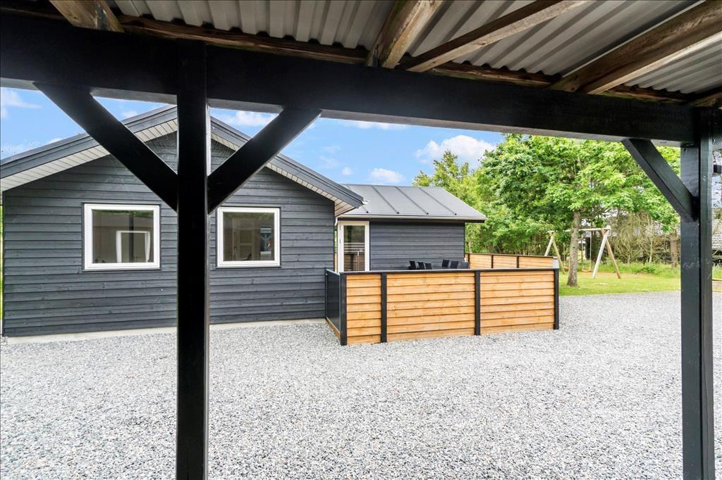 Eine große, abgeschirmte Holzterrasse schmiegt sich rund um das Haus und bietet Ihnen somit ausgesprochen viel Platz, um die Sommersonne und das entspannte, ruhige Urlaubsleben in vollen Zügen zu genießen. Insgesamt ist das Grundstück angenehm groß, sodass Sie und Ihre Kinder sich auf der Grasfläche zur Abwechslung auch wunderbar die Zeit mit vergnüglichen Gartenspielen und Fußball vertreiben können. Für die aller kleinsten Gäste sind eine Schaukel und eine Sandkiste vorhanden. Ein Carport steht für Sie am Ende des mit Schotter versehenen Areals zur Verfügung, auf dem im Übrigen bei Bedarf auch problemlos mehrere Pkws abgestellt werden können.