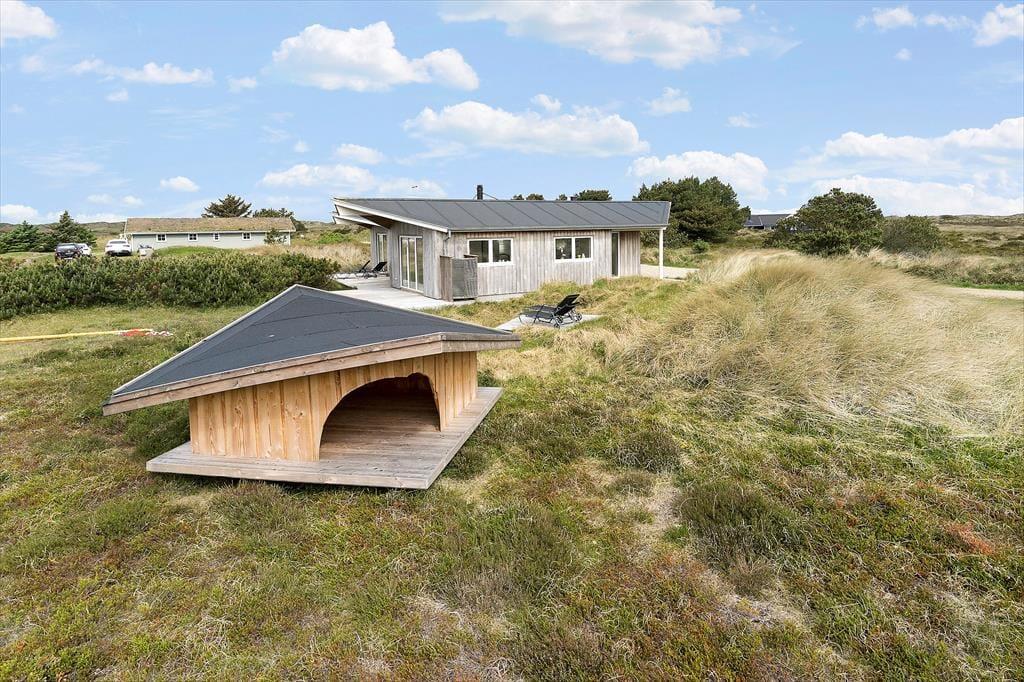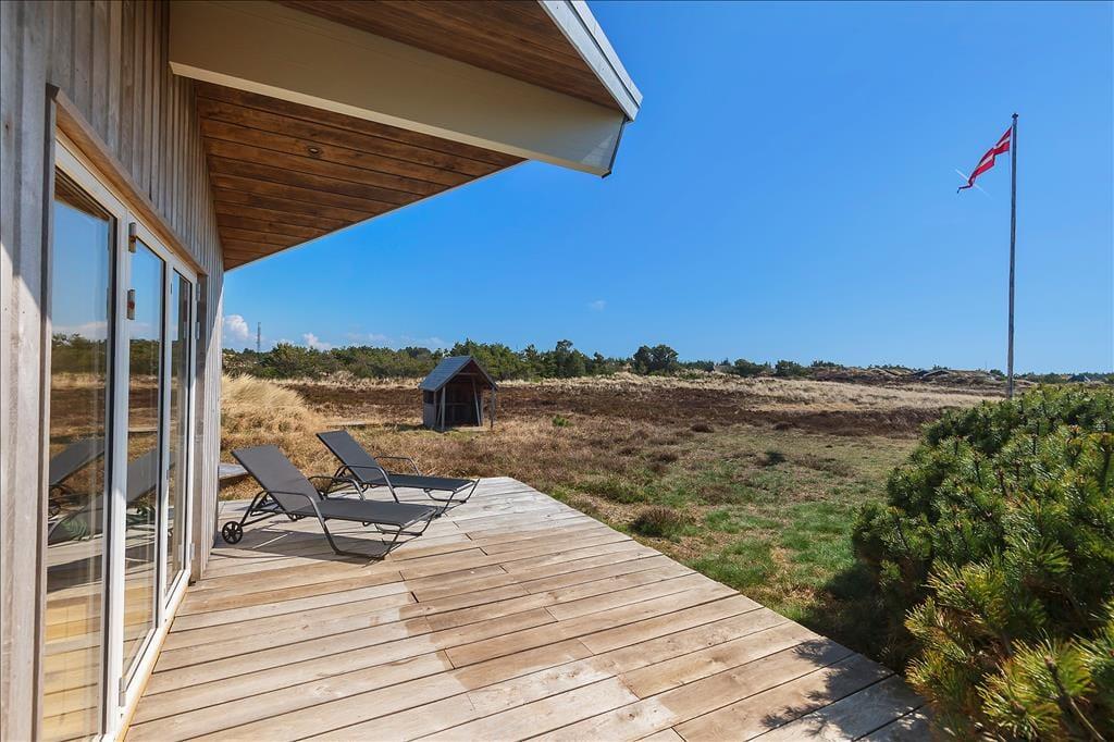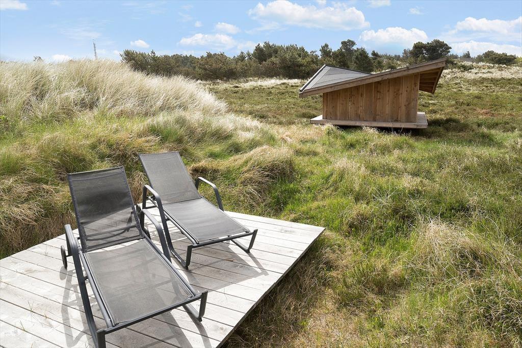 Die zahlreichen Türen machen es Ihnen leicht, sich hinaus ins Freie zu begeben. Sobald die Sonne vom hohen nordischen Himmel lacht, dürfen Sie sich auf ausgedehnte Sonnenbäder und gemütliche Mittagessen auf der Terrasse freuen. Sie genießen die Wahl zwischen gleich mehreren Terrassenberiechen, die schön platziert an das Haus schließen und Sie mit einer Aussicht über das eigene große Naturgrundstück und die offene Heidelandschaft der Westküste verwöhnen. Von einigen Bereichen der Terrasse erblicken Sie sogar den wunderschönen Leuchtturm Blåvandshuk Fyr, der des Nachts mit seinem magisch kreisenden Licht verzaubert. Auf Ihrem Grundstück gibt es eine Außendusche, die Ihnen nach einem langen Tag am Strand den Sand und das Salz der Nordsee von der Haut spült. Im Anschluss können Sie den schönen, erlebnisreichen Urlaubstag ganz hervorragend mit einem Essen vom Grill in geselliger Runde ausklingen lassen.