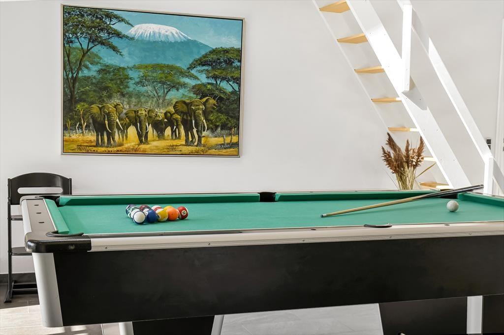 Das 196 m² umfassende Mietobjekt glänzt mit einer hervorragenden Raumaufteilung. Es beinhaltet vier Schlafräume, zwei Badezimmer und einen wunderbaren Aufenthaltsbereich, der sich aus dem Aktivitätsraum, dem Wohnraum und der offenen Küche zusammensetzt. Praktischerweise sind die Schlafräume und die Bäder so im Haus verteilt, dass es gut von zwei Familien bewohnt werden kann. Ein Schlafboden steht darüber hinaus zusätzlich zu Ihrer Verfügung. Dieser wird garantiert im Nu zum absoluten Favoriten Ihrer größeren Kinder oder Ihrer Teenager avancieren. Der Aktivitätsraum sorgt mit seinem Tischkicker und dem Billardtisch für viel Spaß und Abwechslung bei allen Mitreisenden. Alternativ lockt jedoch auch stets der gemütliche Wohnraum, der mit einem eingebauten Kaminofen und einem direkten Zugang zur Terrasse zu überzeugen weiß. Das größere der beiden Badezimmer lädt mit seinem tollen Whirlpool und der Sauna zu traumhaft entspannten Momenten voller Wellnessflair ein. Das Whirlpoolwasser wird übrigens mittels der Erdwärmeanlage erwärmt. An diese ist auch die Fußbodenheizung angeschlossen, die sich durch das gesamte Ferienhaus erstreckt. Somit genießen Sie nicht nur heimelige Wärme, sondern beruhigen auch Ihr grünes Gewissen.